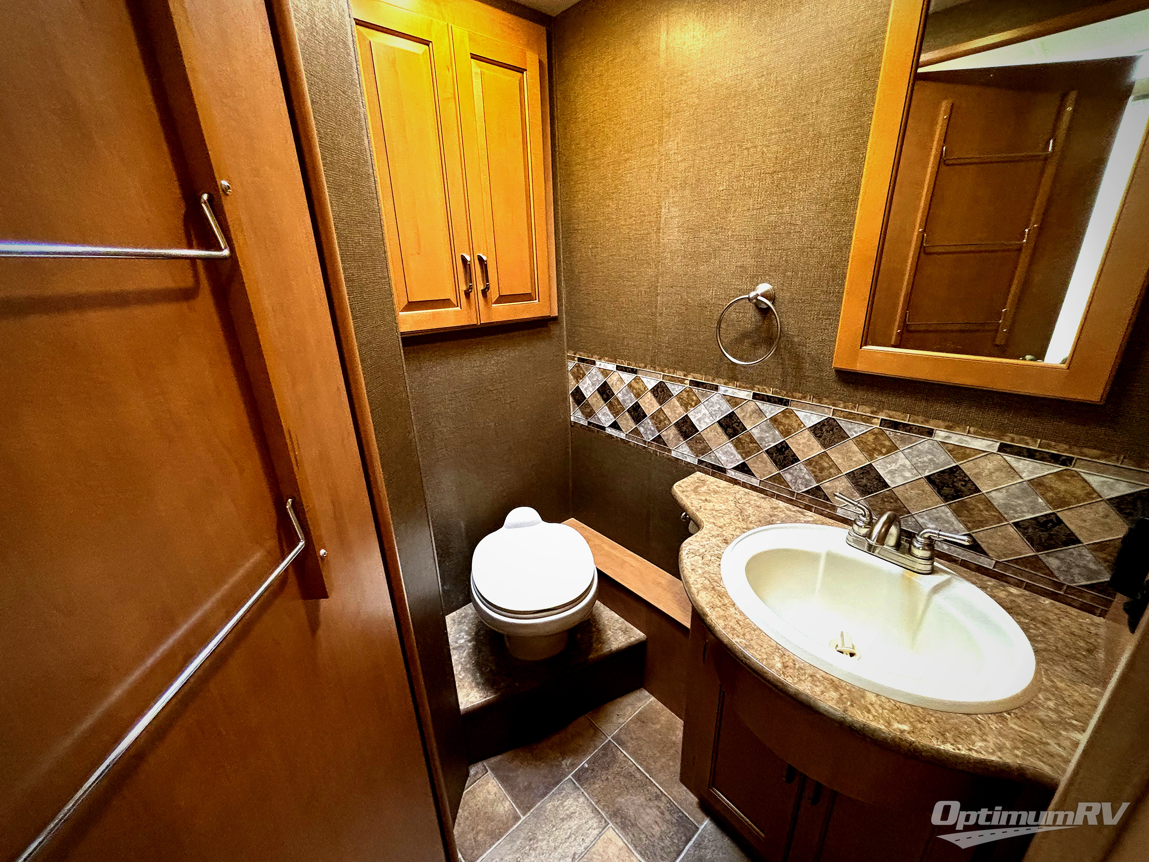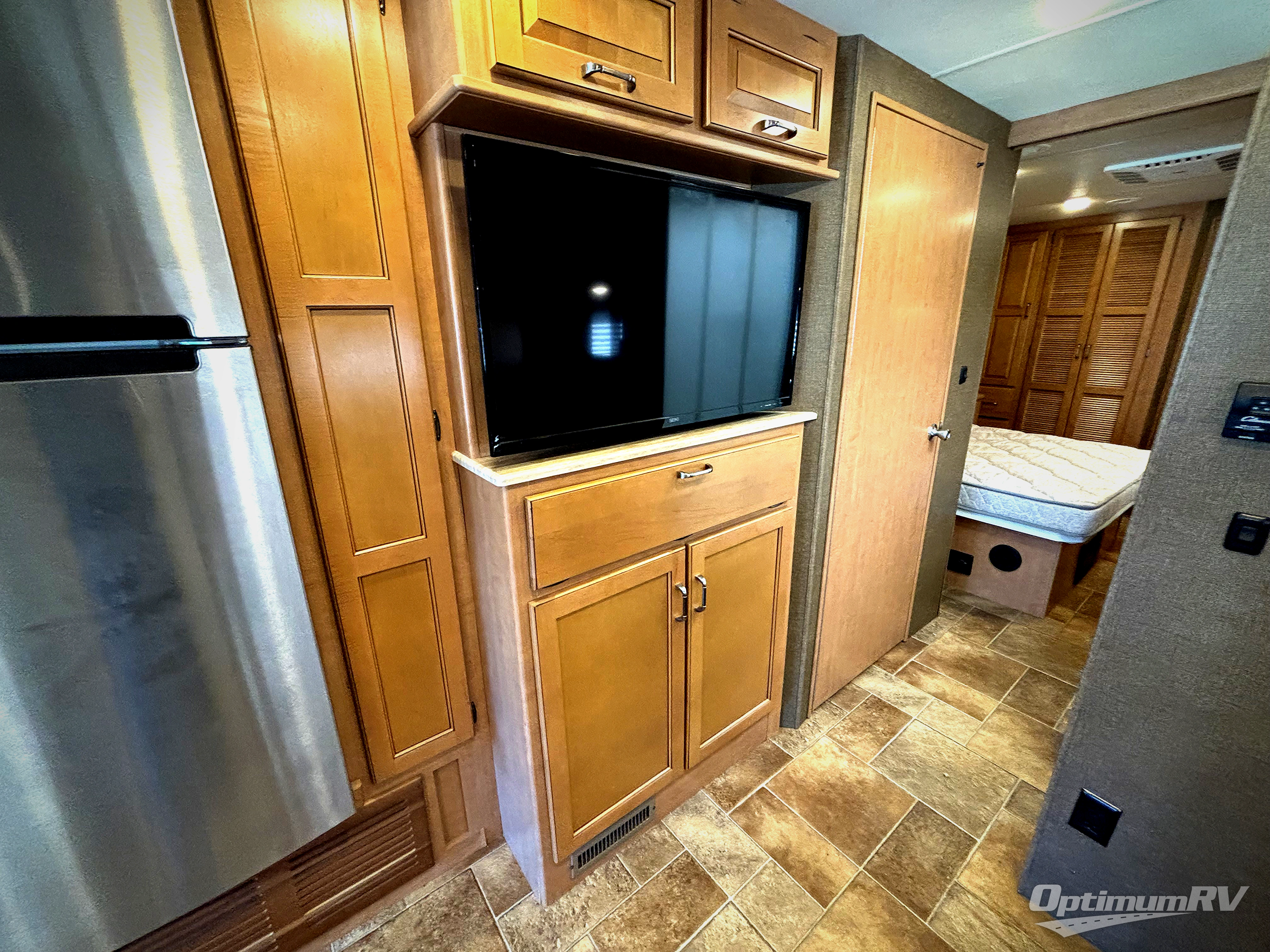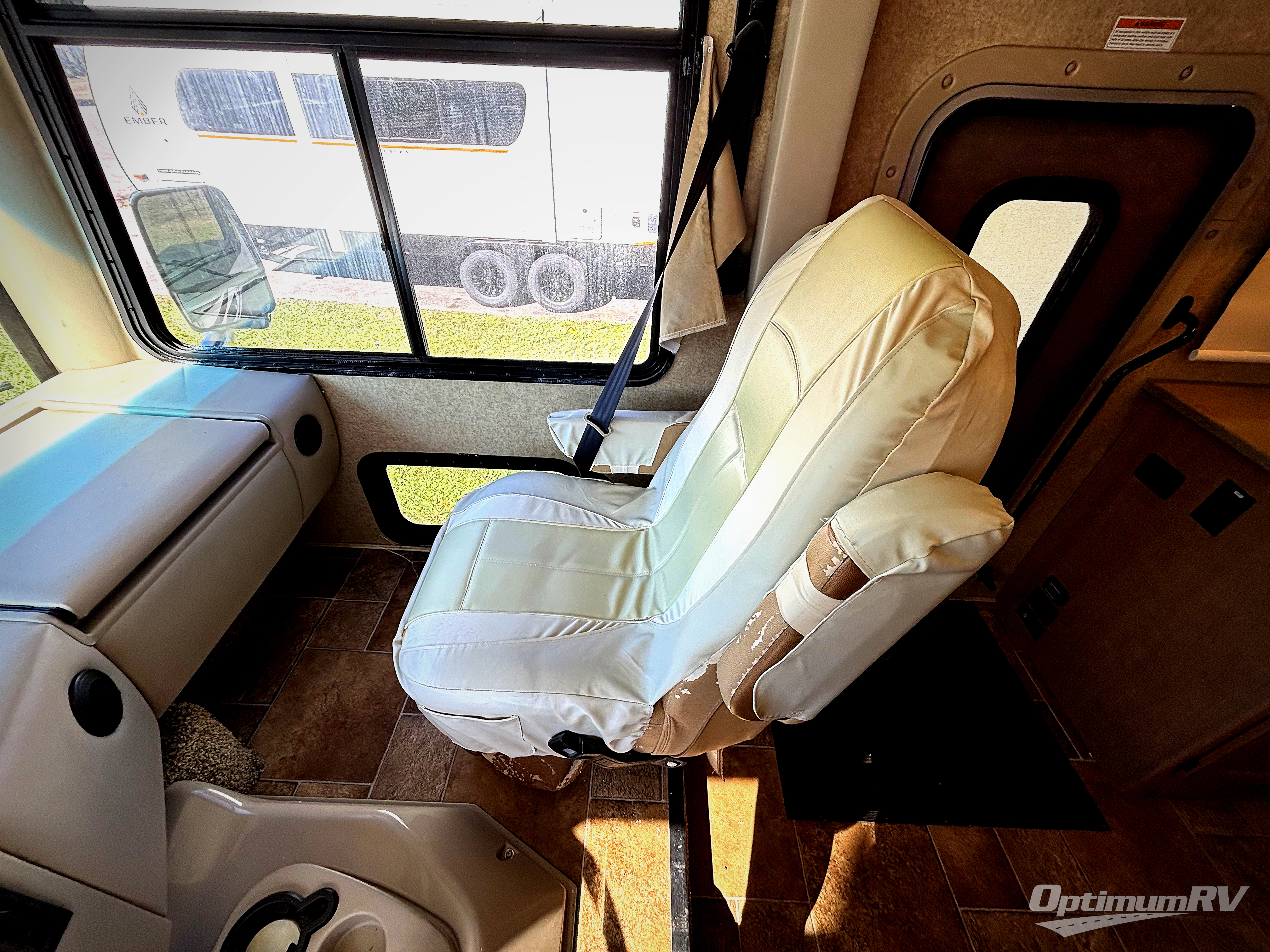 Step inside model 35C and see just how convenient your next road trip can be. There is a slide out dream dinette and theater seating for two opposite the entry door. With overhead storage above the theater seating, and two sets of seat belts, all of your guests and cabinet items will be secure while traveling. There is also a drop down overhead bunk above the cab area for added sleeping space if needed as well. The convenient coffee table between the captain's chairs allows for more table top space for just about anything. You can also choose a sofa with air bed in place of the theater seats if you like. Enjoy the 40" LED TV along the outer bathroom wall.