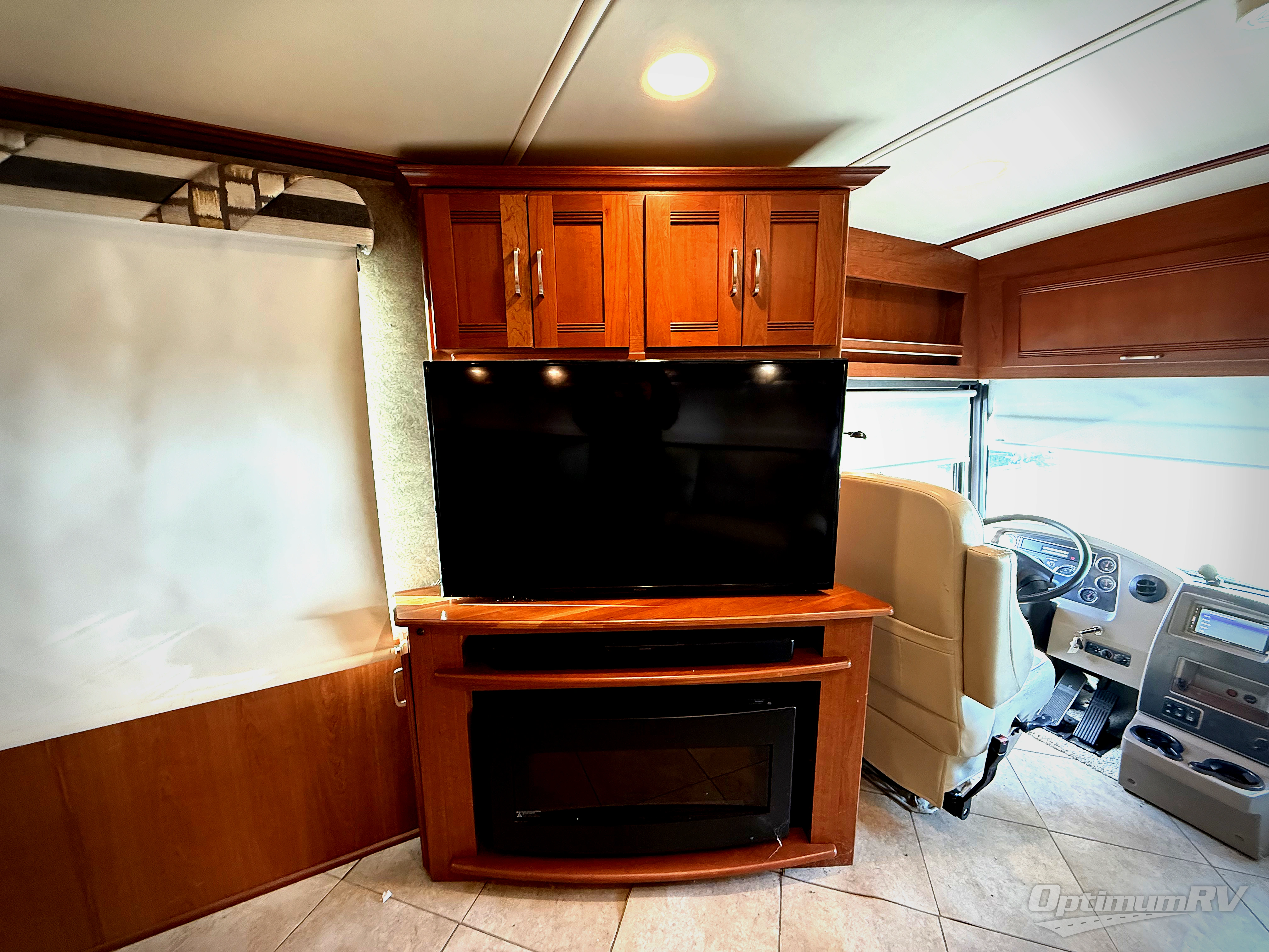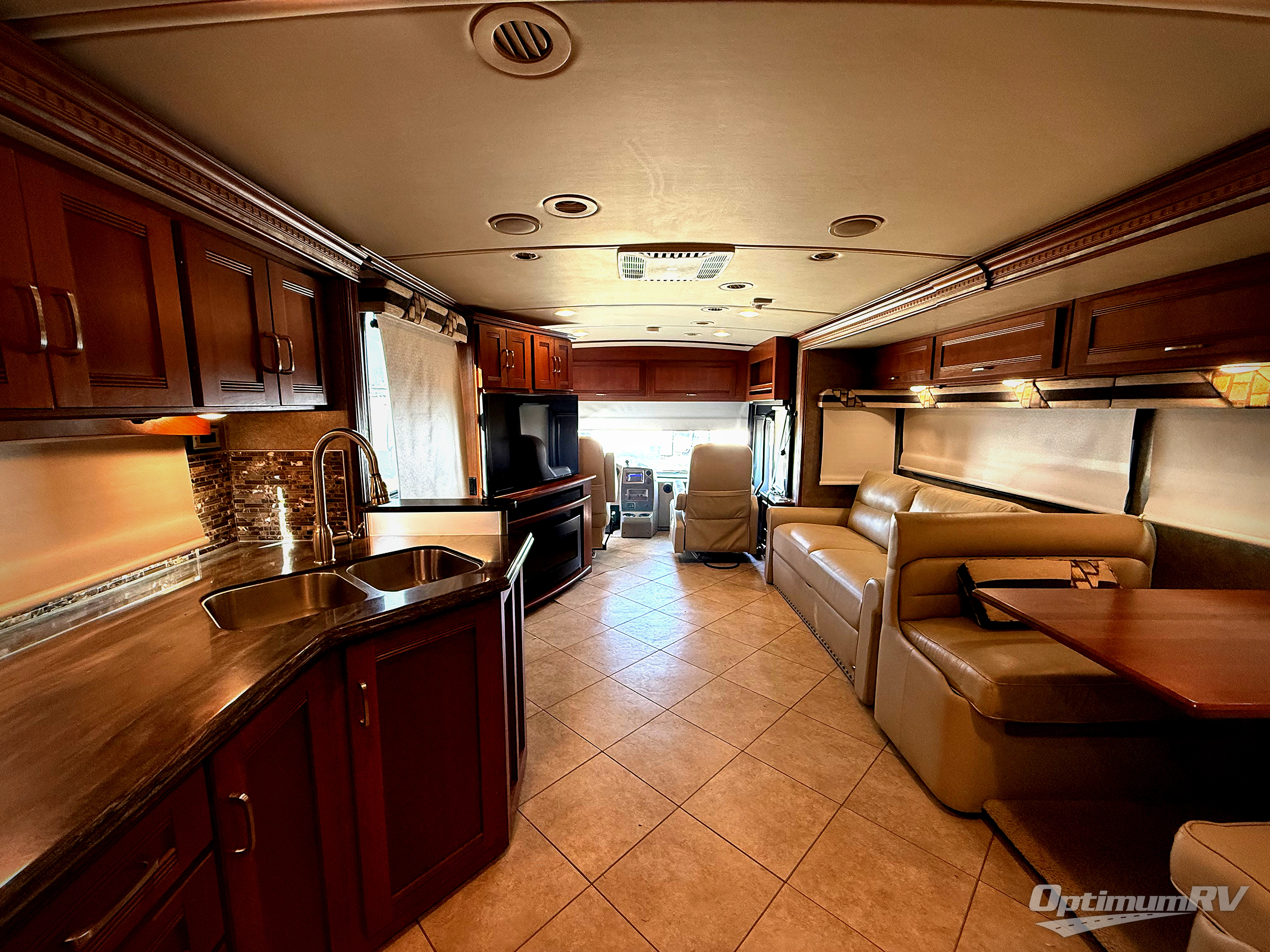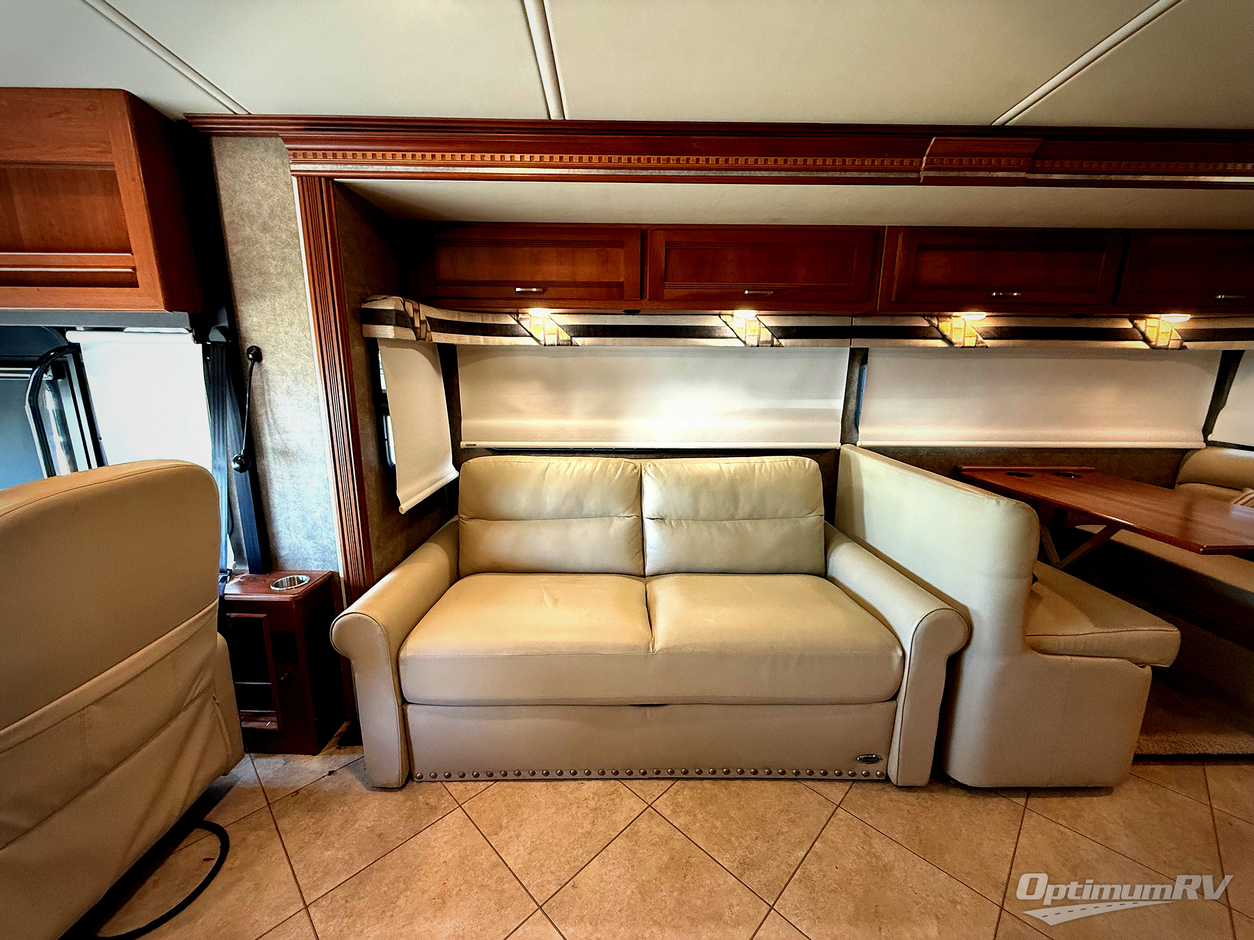 Enter model 36G in front of the passenger seat. Looking back you will see a spacious interior with a slide out Flexsteel fold-n-tumble sofa and Benchmark dinette on your left. Notice the seat belts which are great for rear travelers. Opposite you will find a recliner with pull-out flip-out table, and a corner location for the 48" HDTV, and optional fireplace if you choose to add.