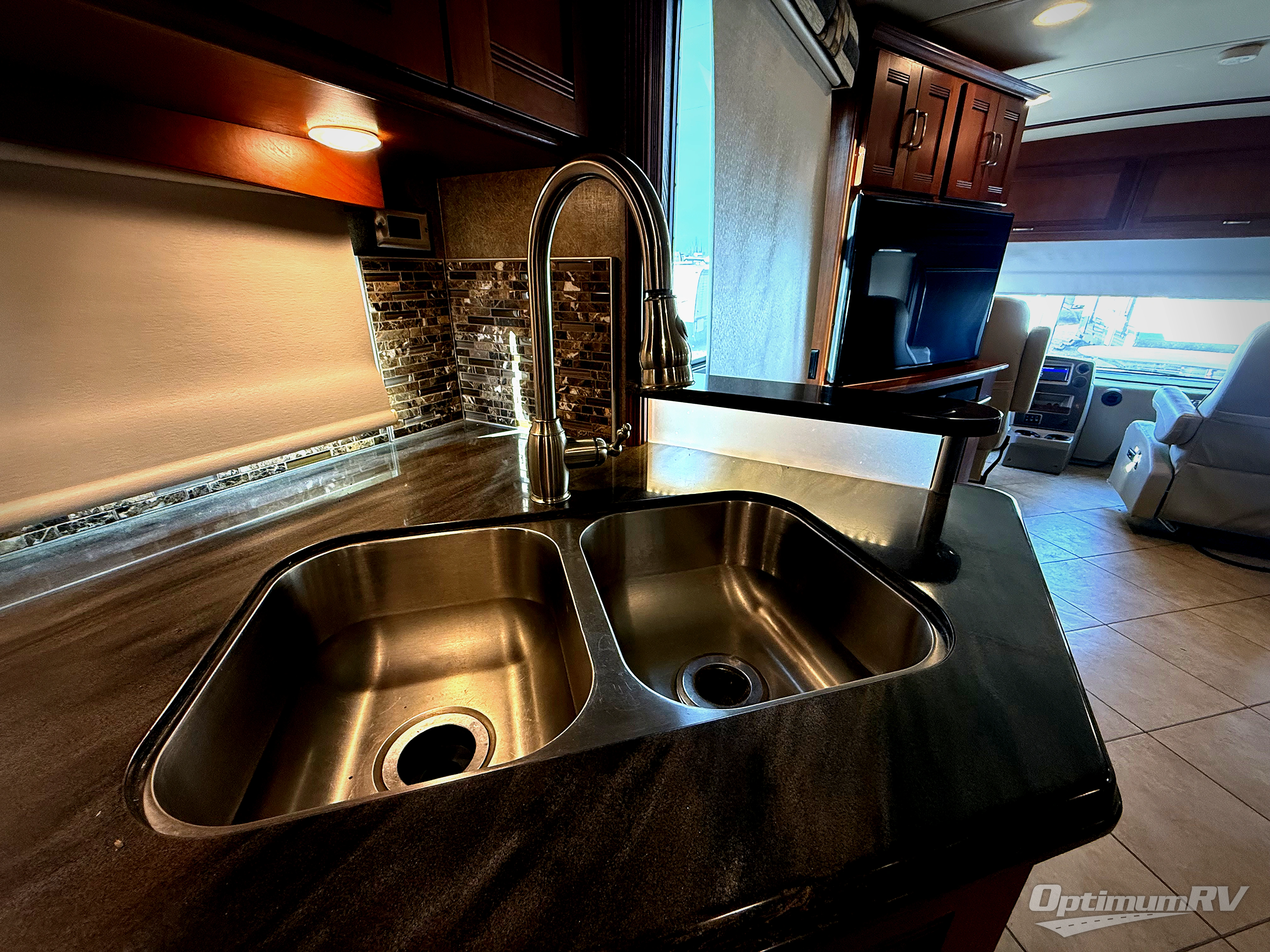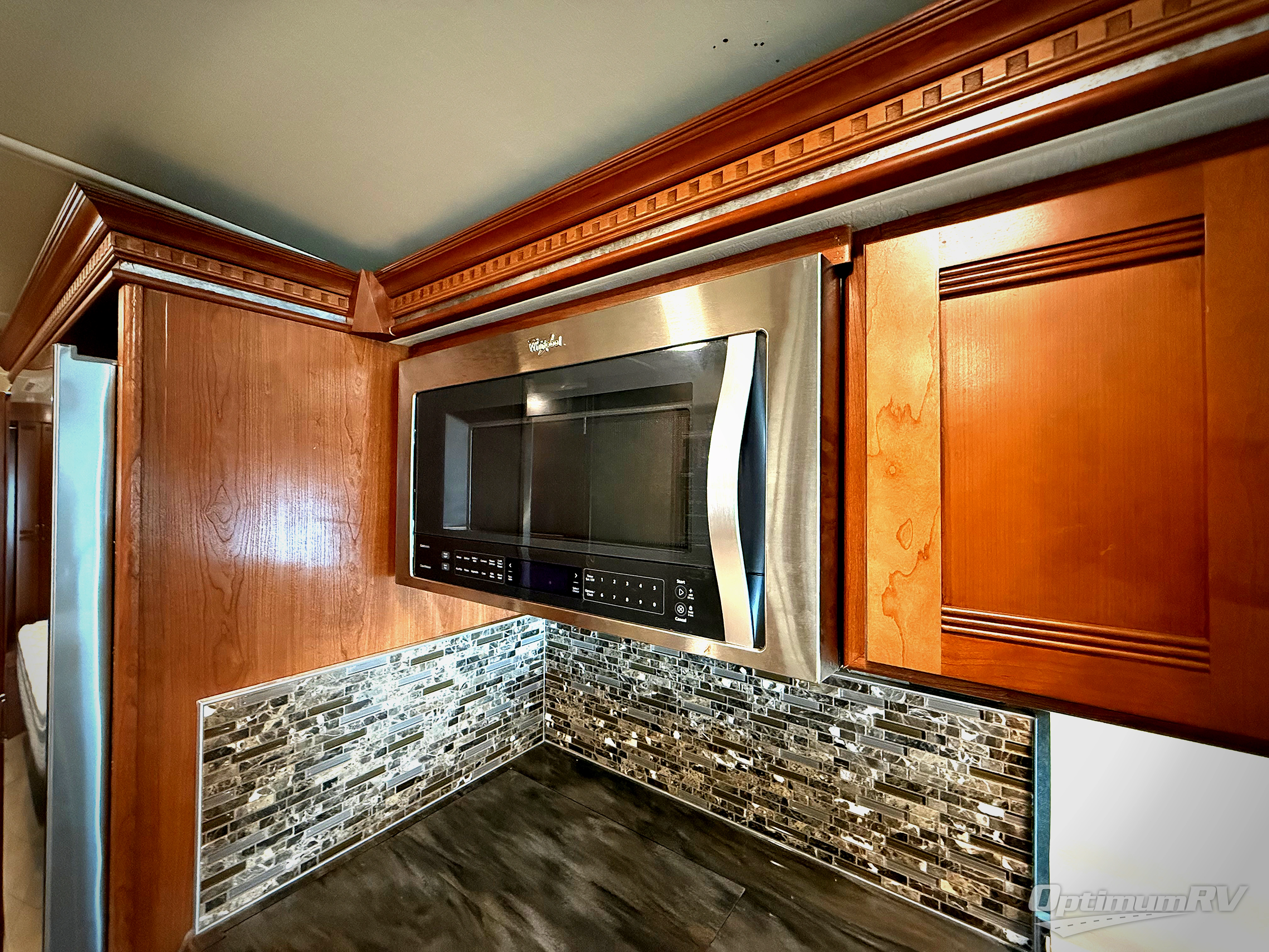Heading further back you will come to the kitchen and bath area. The kitchen begins at the head of the driver's side slide out with an angled double sink, a three burner range, and a residential refrigerator. There is also a storage cabinet that can be the location of the washer and dryer if you wish to add that convenience. Here you will have no problem creating meals and snacks while on the move.