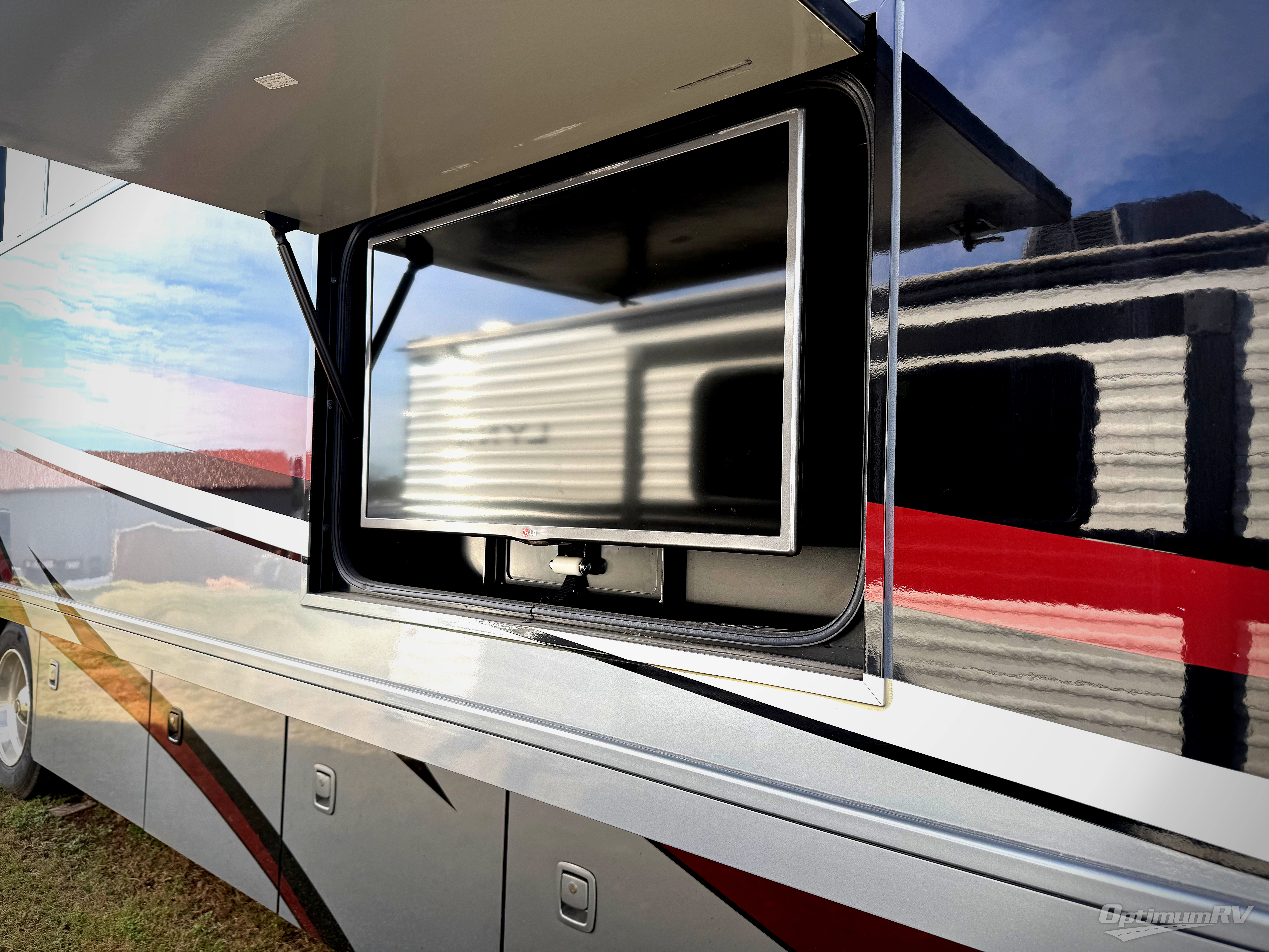 The rear master bedroom features a queen bed slide including nightstands and overhead storage. The chest of drawers opposite is part of the large slide on the road side that also features the kitchen appliances. Here you will enjoy storage drawers for your things, plus there is a 40" HDTV as well. Along the rear wall find even more storage with a wardrobe and storage cabinet. You can choose a king size bed if you wish for a bit more sleeping space, plus so much more!