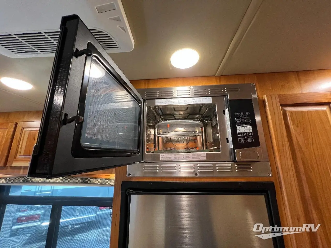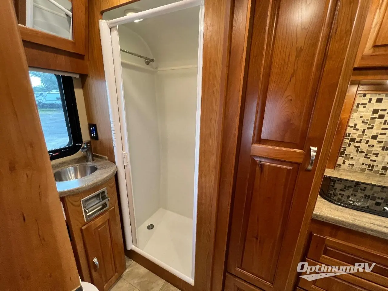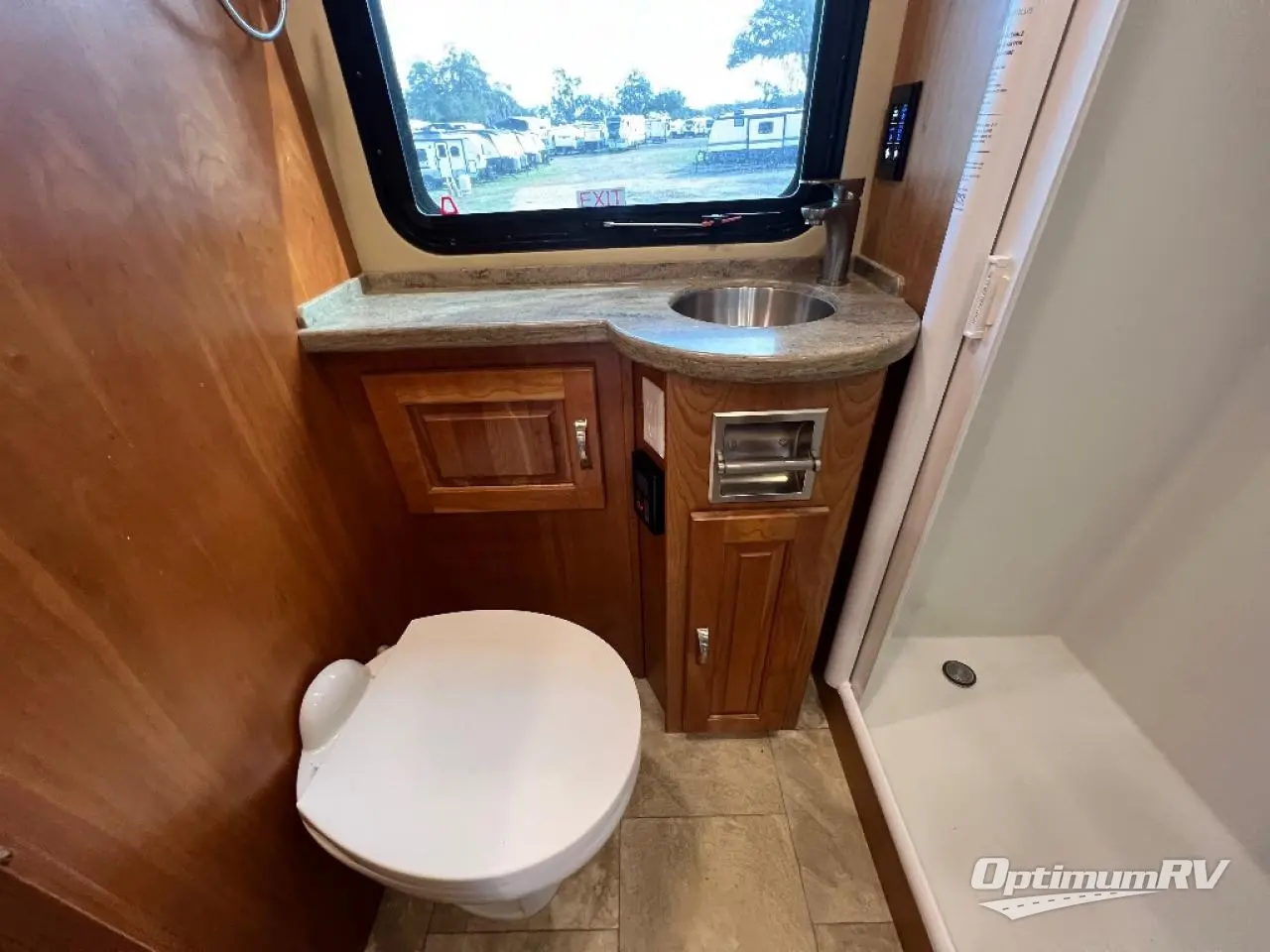 Enter along the curb side towards the rear of the coach and find a convenient rear bath including a shower, toilet, and vanity with sink. There is also a storage closet to your immediate left just inside the door along the rear wall as well.