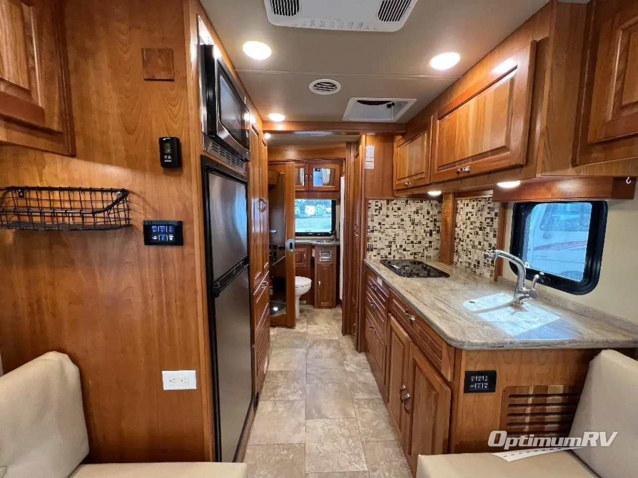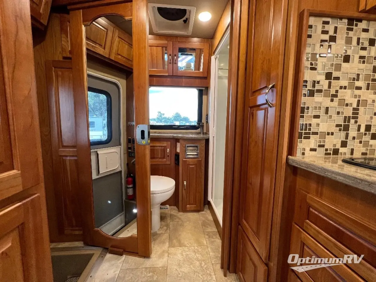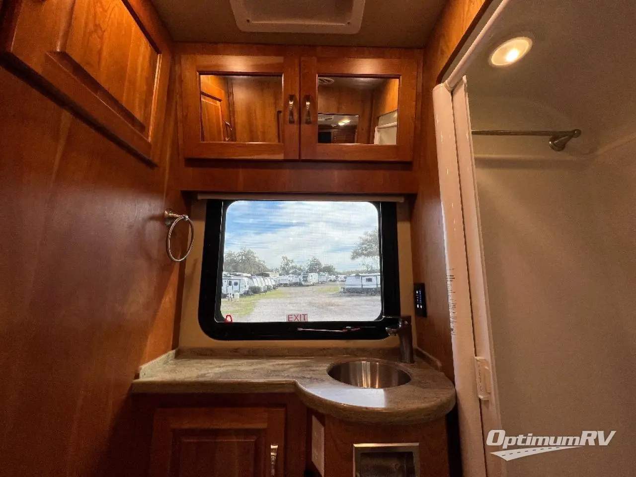 Enter along the curb side towards the rear of the coach and find a convenient rear bath including a shower, toilet, and vanity with sink. There is also a storage closet to your immediate left just inside the door along the rear wall as well.