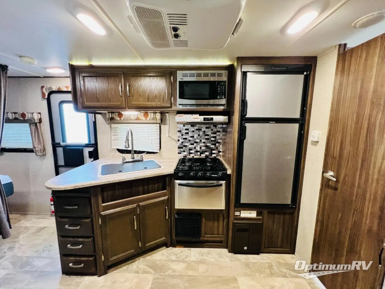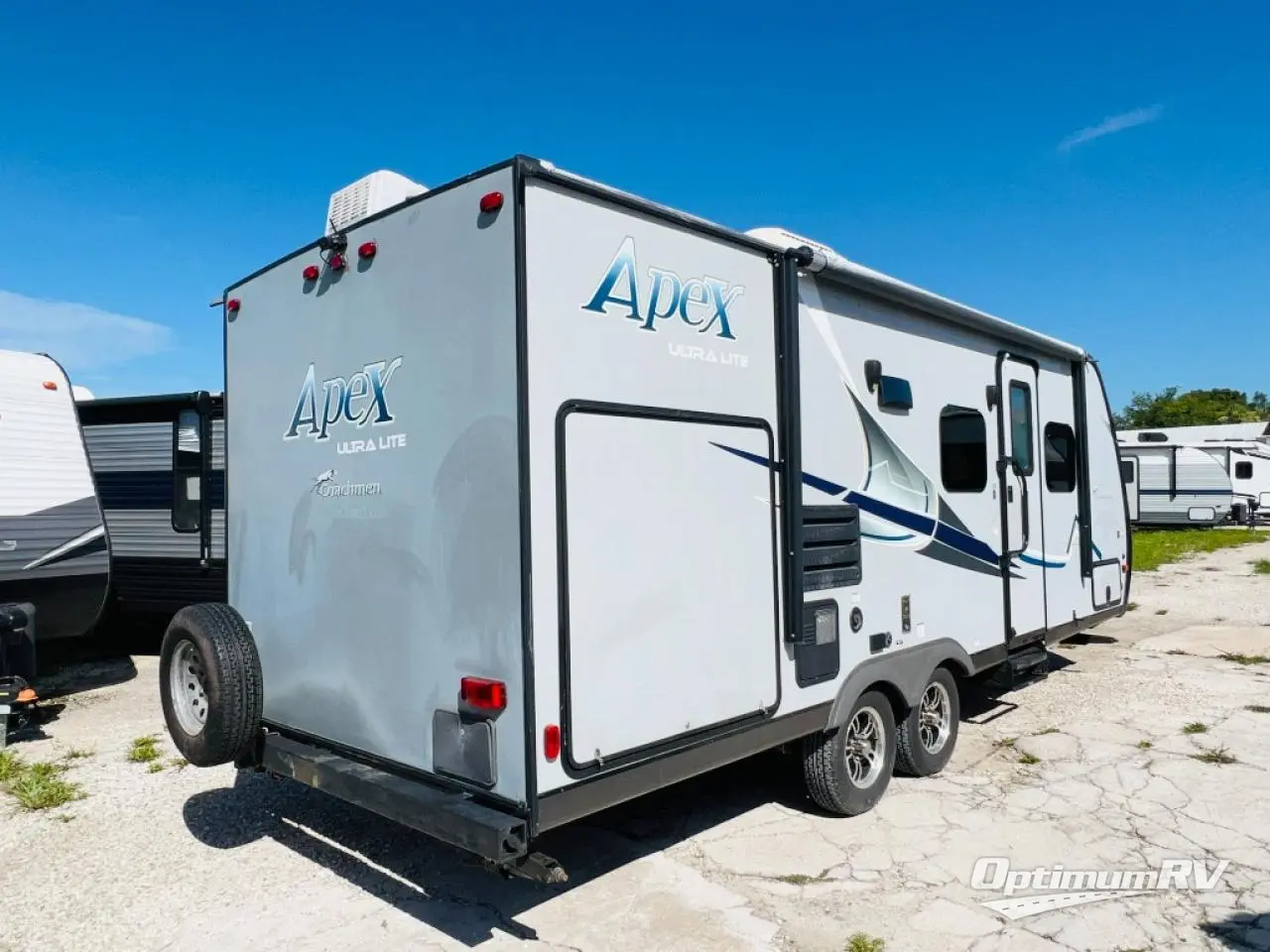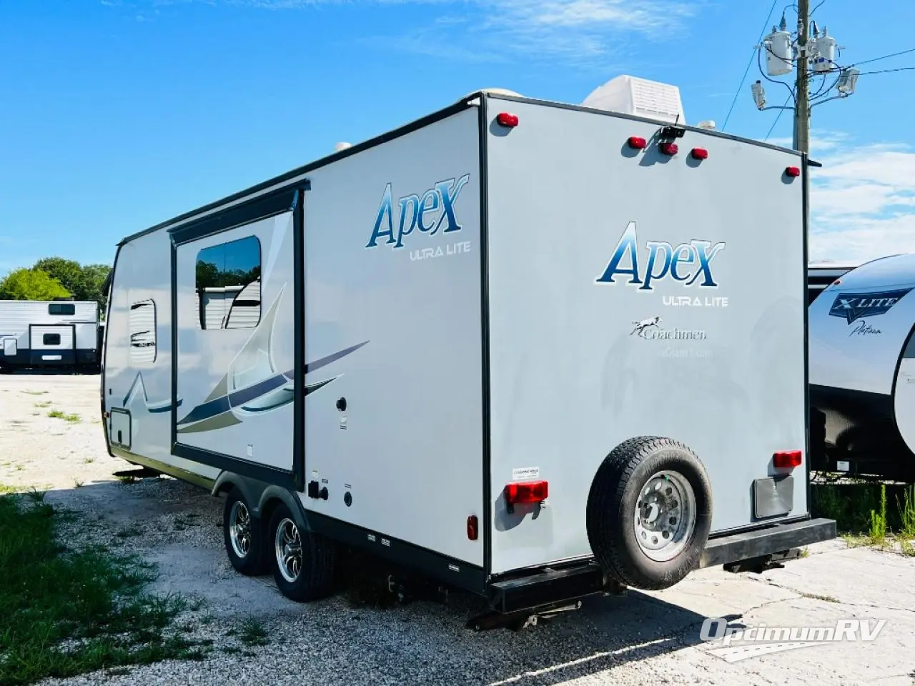 Camp comfortably in this 215RBK Apex ultra lite trailer by Coachmen RV. This model features a complete rear bath with angled shower, toilet, sink with medicine cabinet, and a storage wardrobe that is above the outside kitchen.