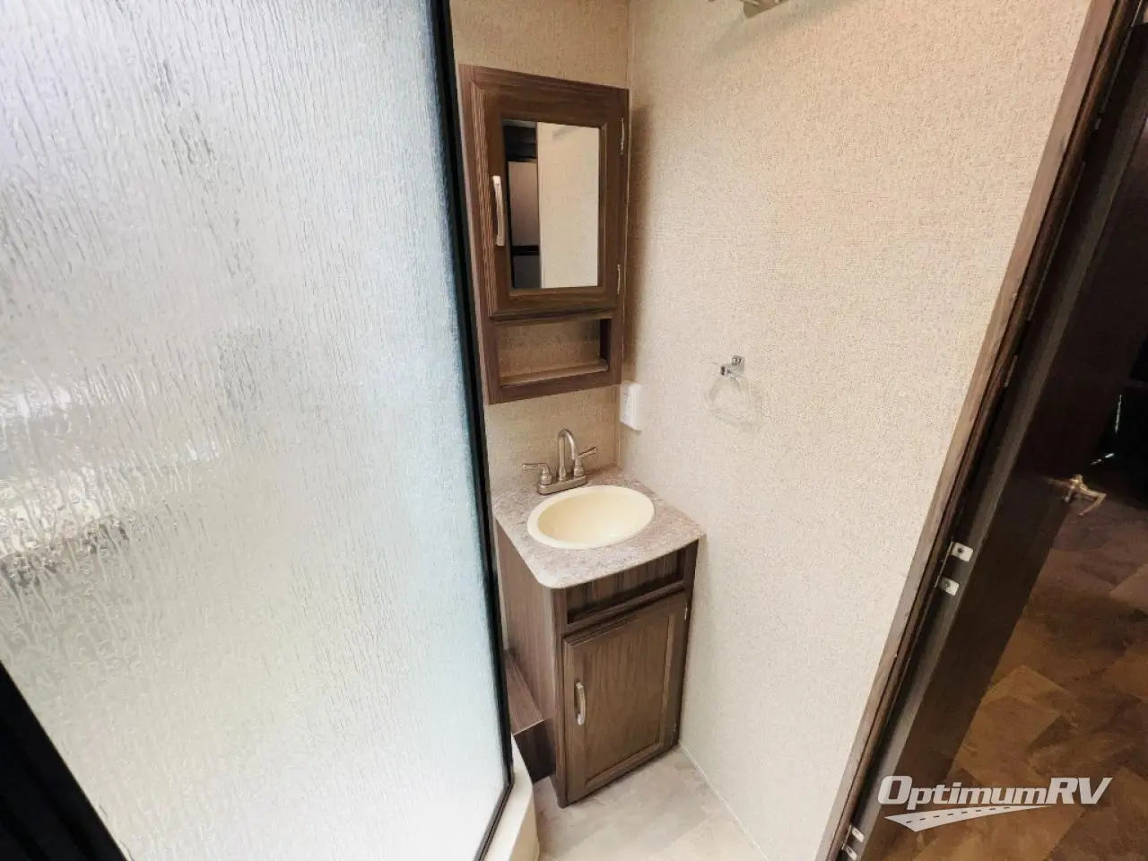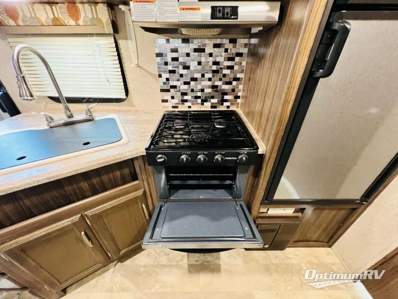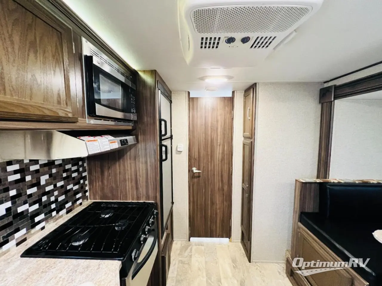 Camp comfortably in this 215RBK Apex ultra lite trailer by Coachmen RV. This model features a complete rear bath with angled shower, toilet, sink with medicine cabinet, and a storage wardrobe that is above the outside kitchen.
