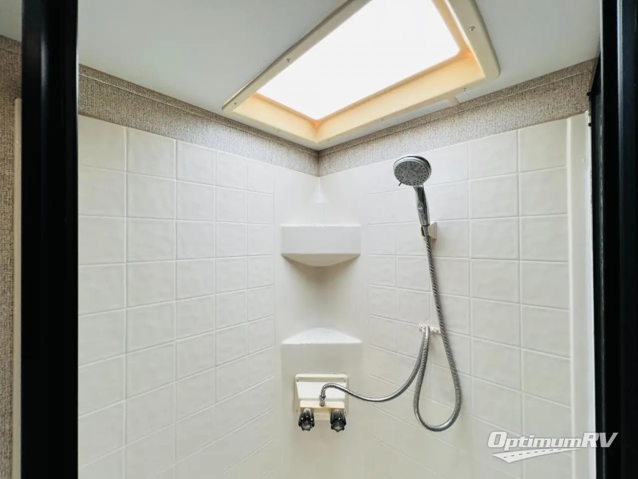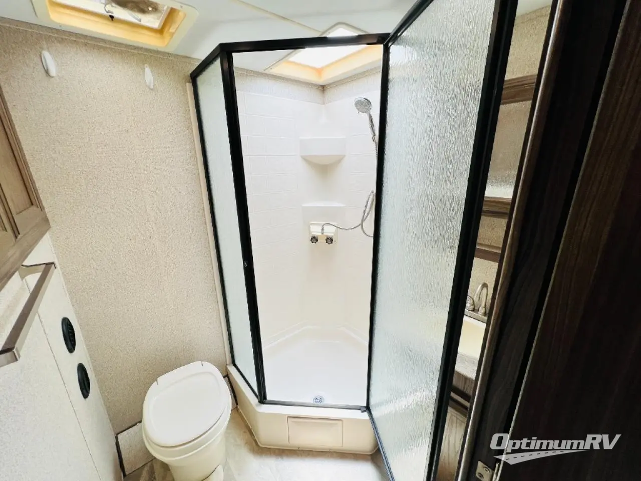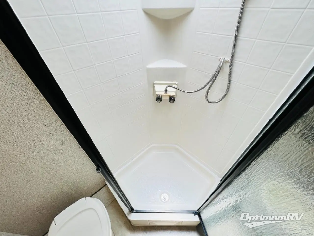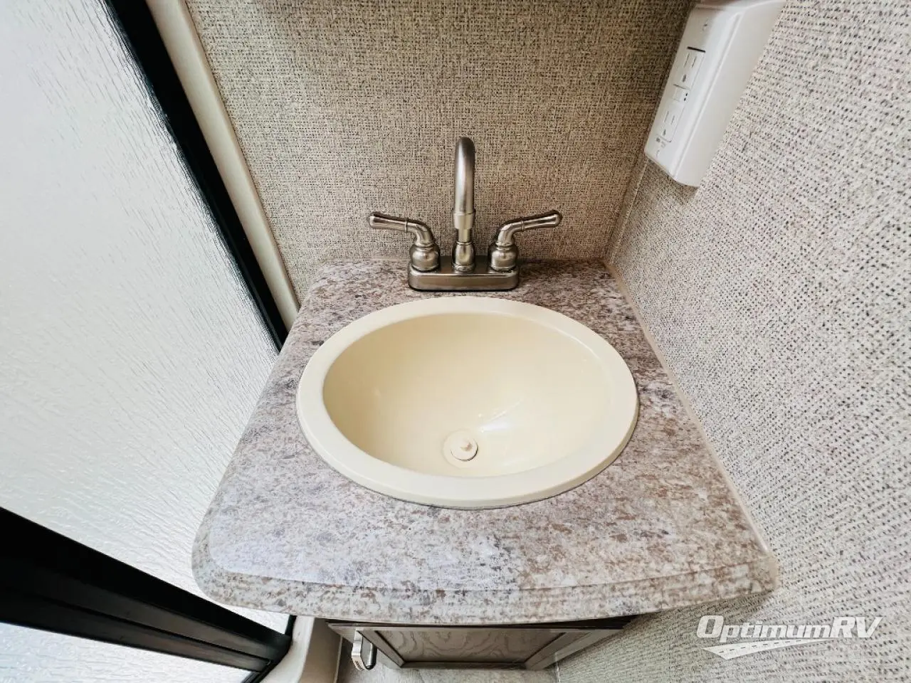 The main living area features a slide out u-shaped convertible dinette that is comfortable for dining or viewing the entertainment center. Enjoy cooking while you travel with a complete kitchen setup including a refrigerator, 3 burner range with overhead microwave, and double sink for doing the dishes. There is a pantry and overhead storage for your dry goods and anything else you might need.