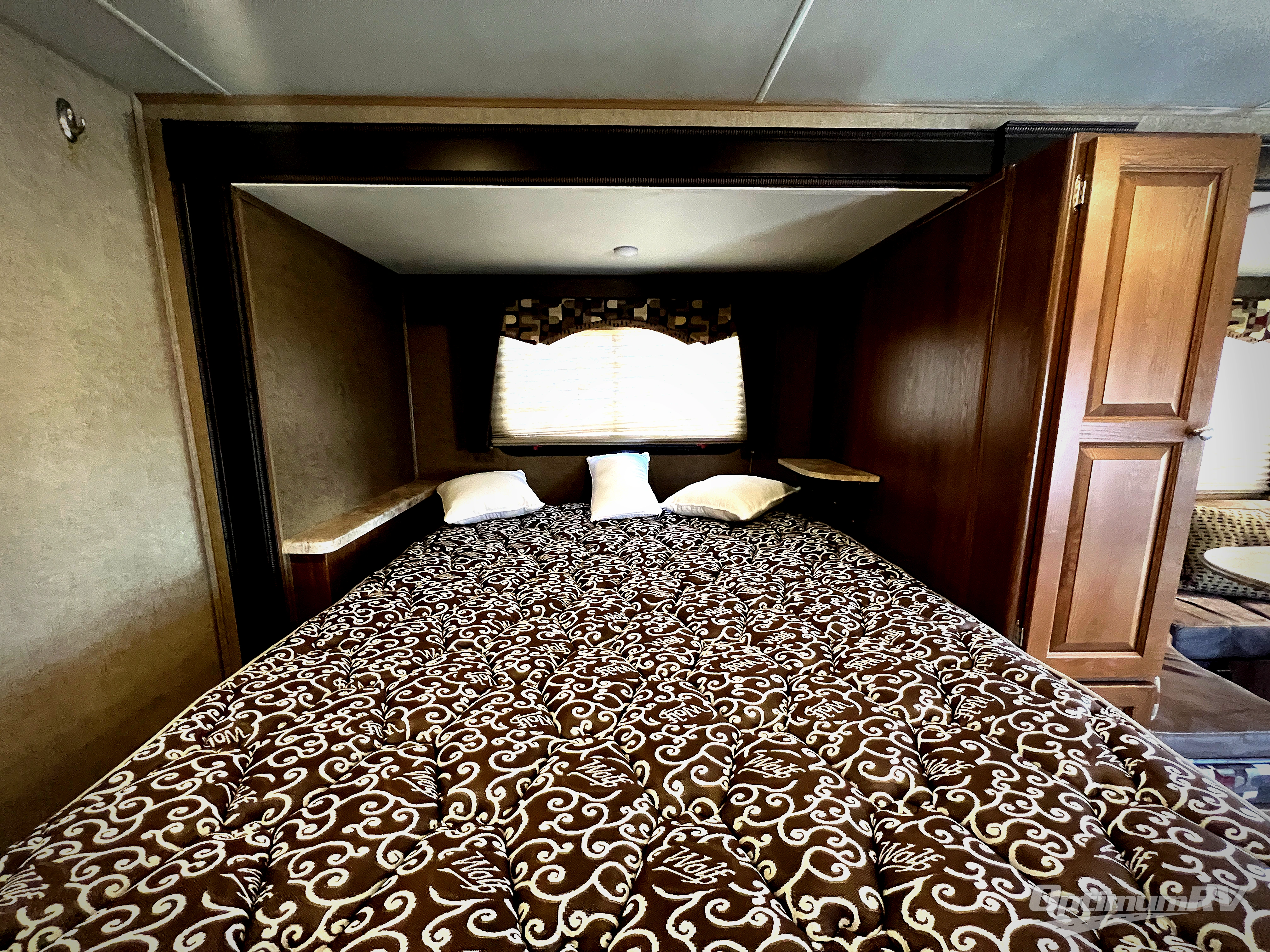 Straight ahead through the entry door find more seating in the slide out u-shaped dinette. Beside the dinette within the slide is also a combined full extended entertainment center/pantry/fireplace that provides separation from the living area and bedroom, plus a queen bed with nightstand and shelf. You may choose the optional recliners or a sofa in place of the u-shaped dinette. A walk-in closet is along the rear wall for all of your clothing.