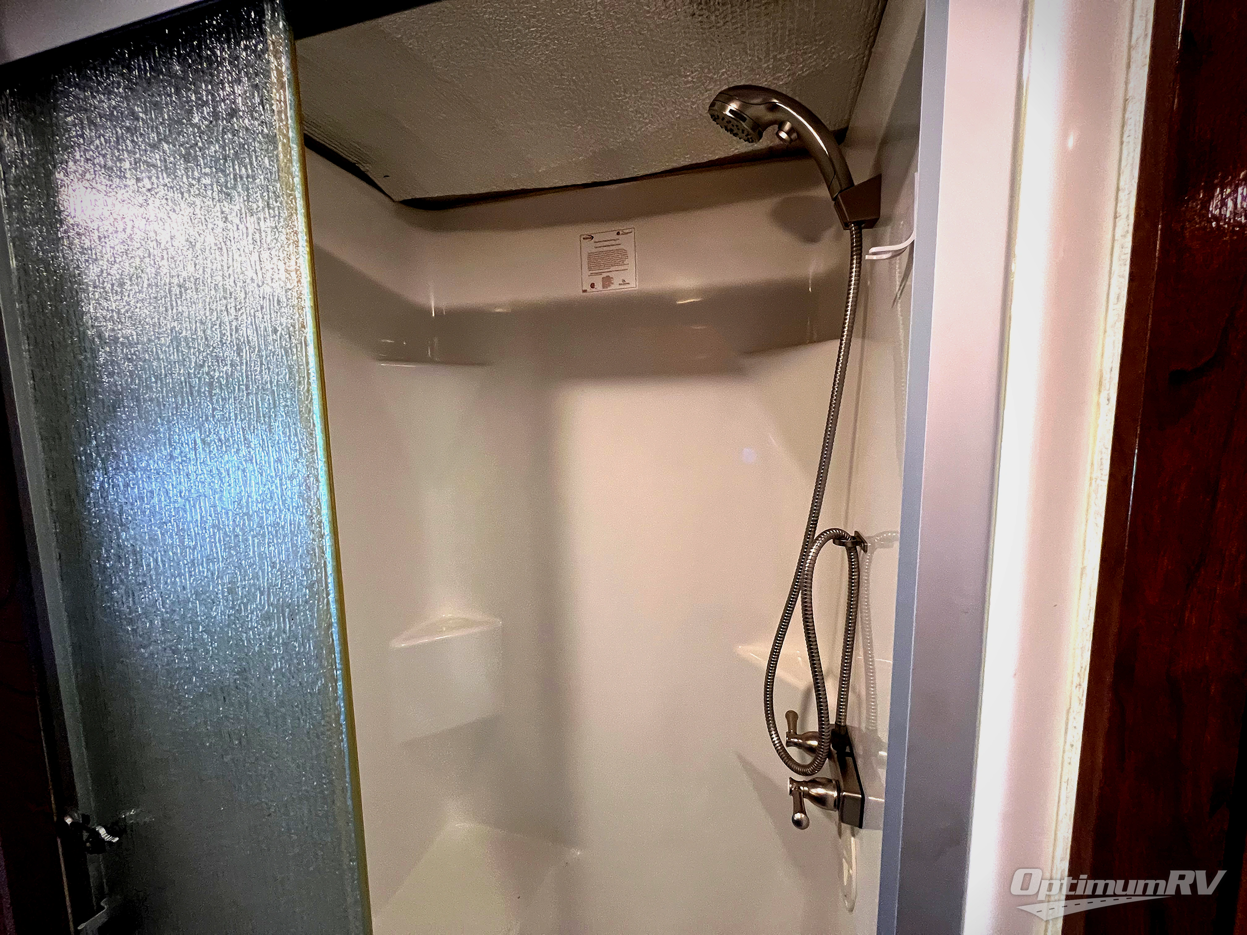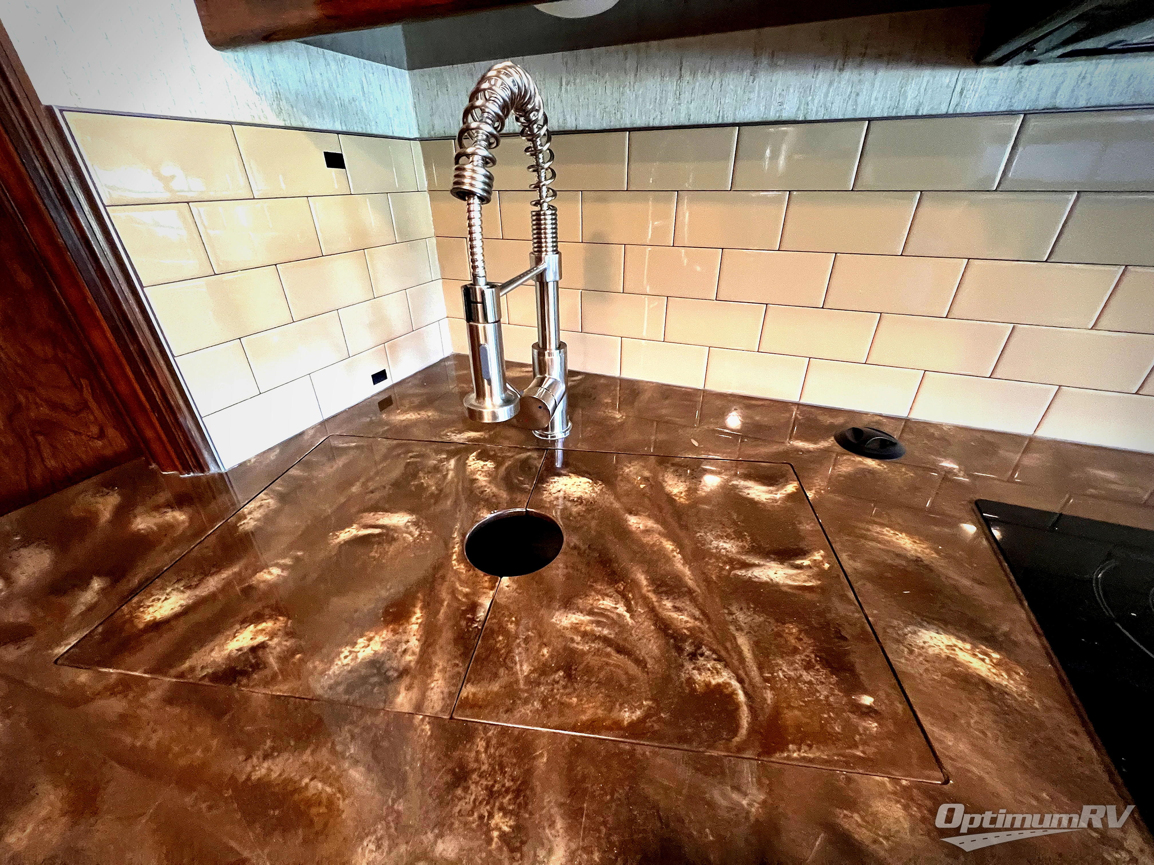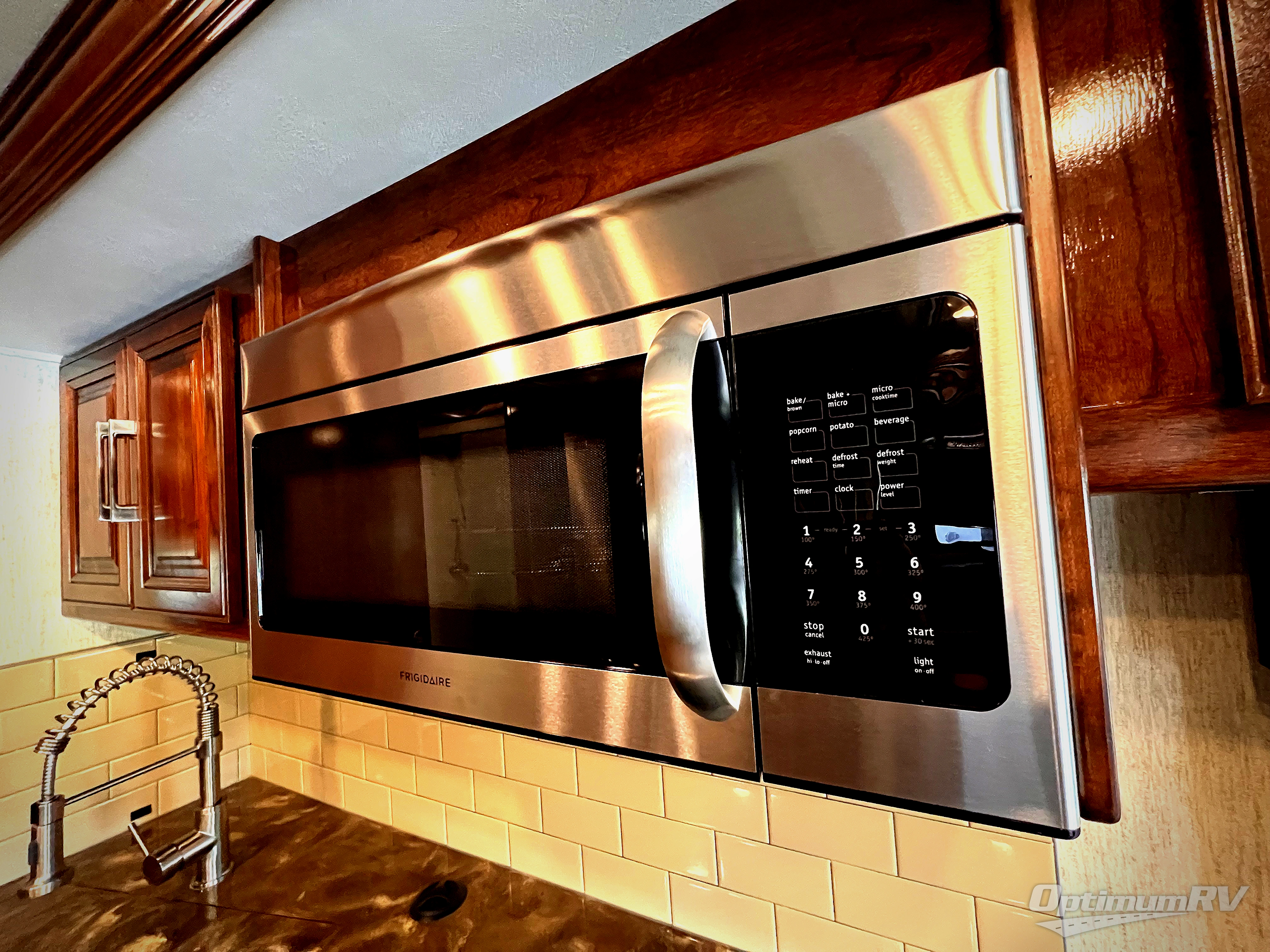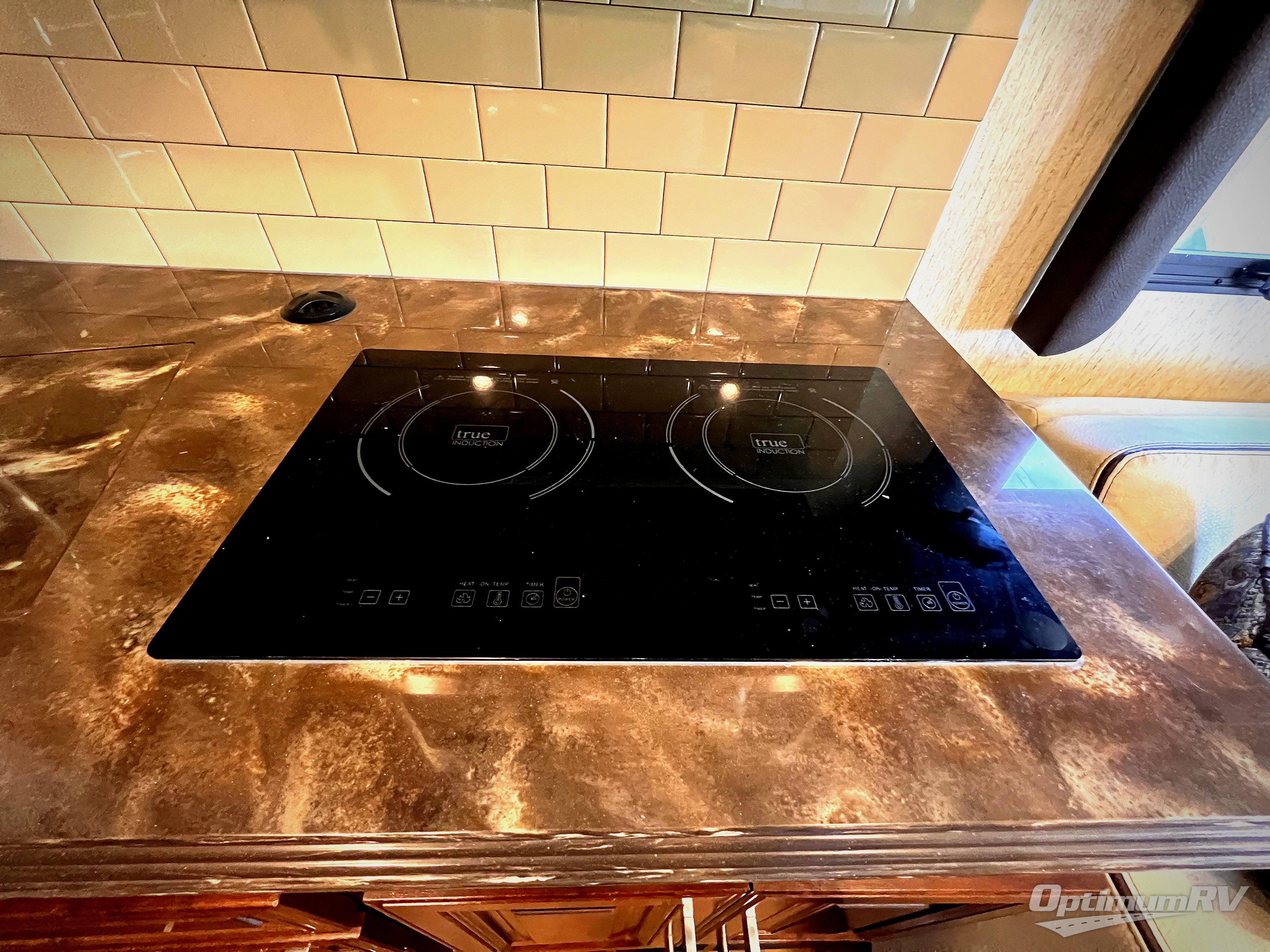 As you enter model 364TS in front of the passenger's seat take a look back at the spaciousness of the dual opposing slides in the main living and kitchen area. The curb side slide includes a booth dinette with a 48" LED TV, a pantry, and a residential refrigerator. The opposite slide provides a sofa with bed, a two burner range with overhead microwave oven, and a large kitchen sink for washing the dishes. You will also find plenty of overhead storage as well.