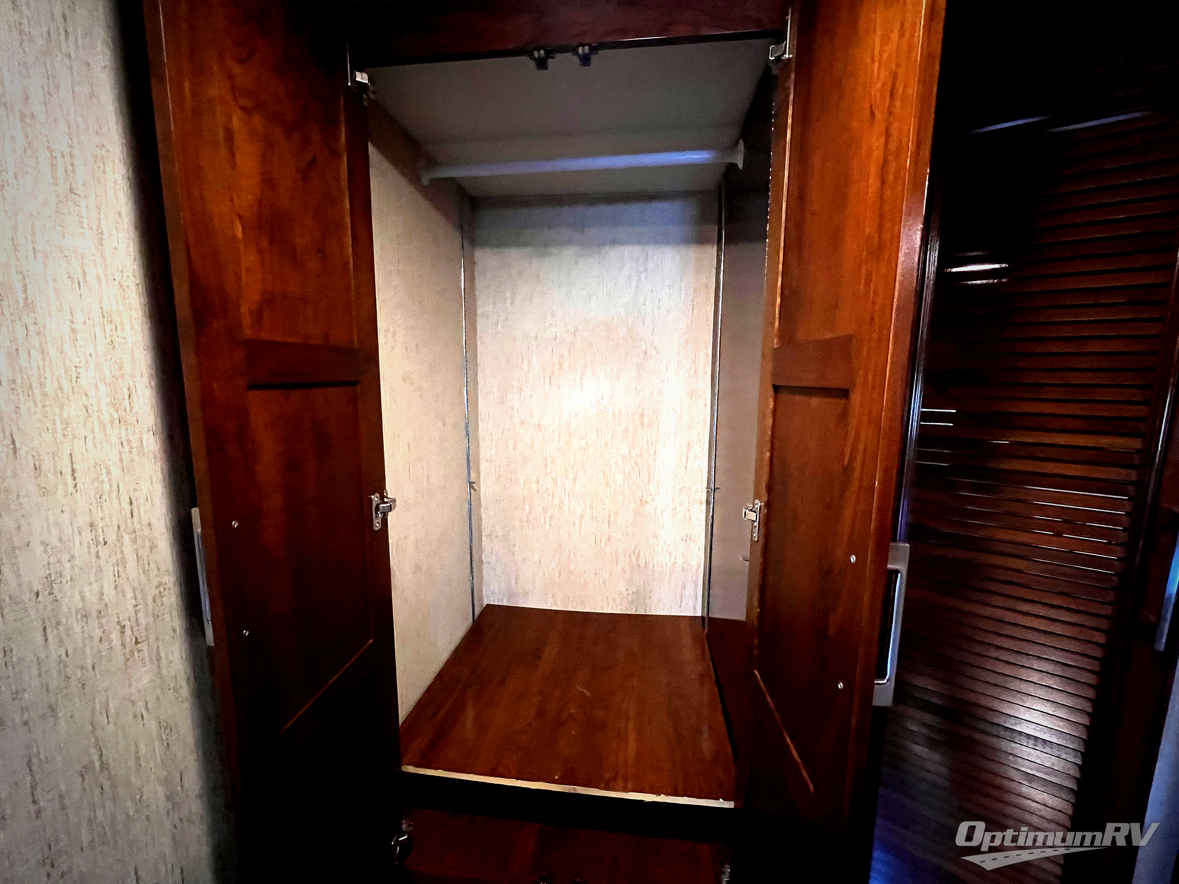 The bedroom provides a restful night's sleep on a king bed slide out with nightstands and overhead storage along the road side wall. On the opposite side you will find a closet, a dresser, and a 32" TV. Along the rear wall there is additional clothing storage in the closet, plus there is a wardrobe that has been prepped for a washer and dryer if you choose to add that option.