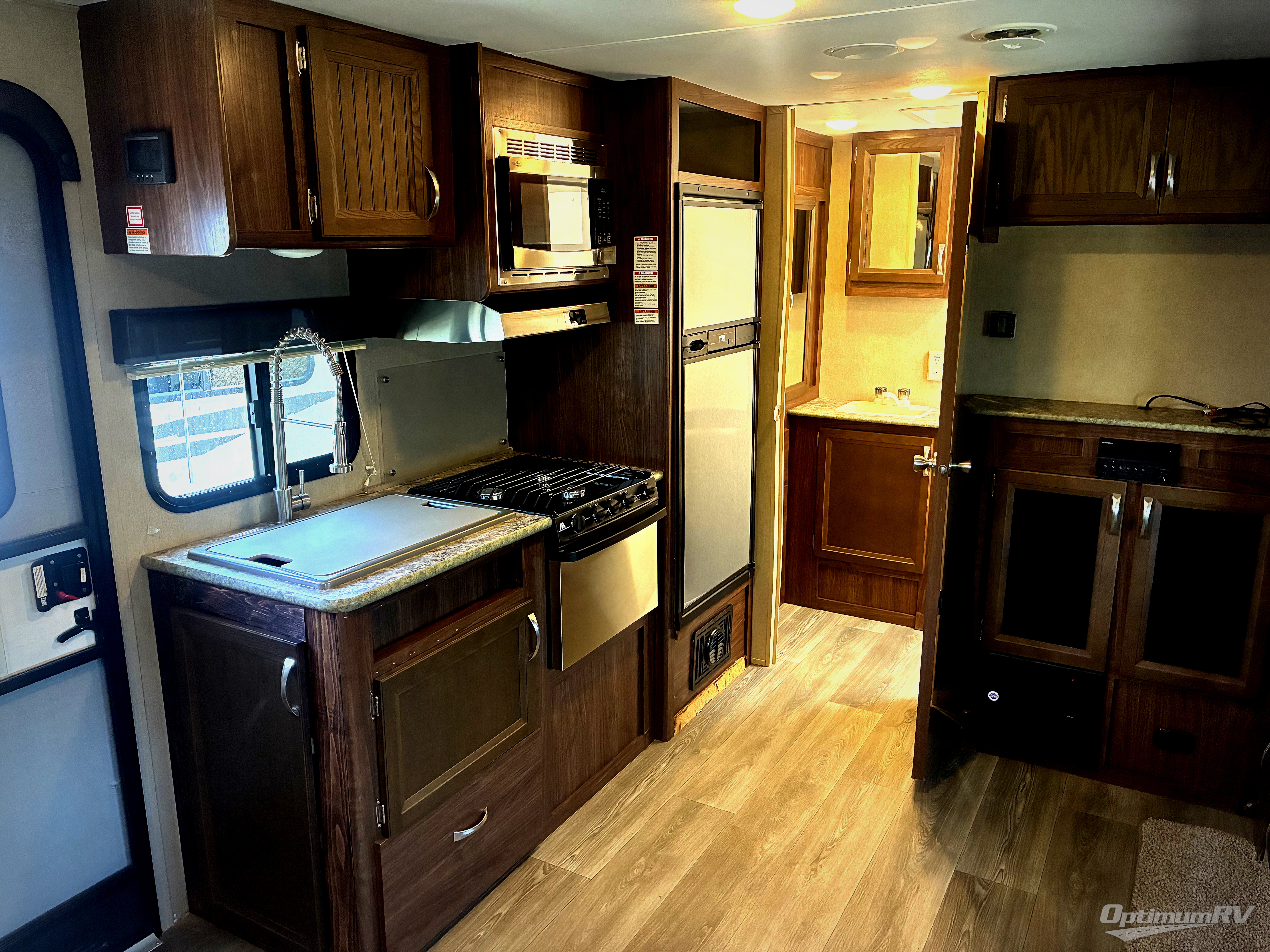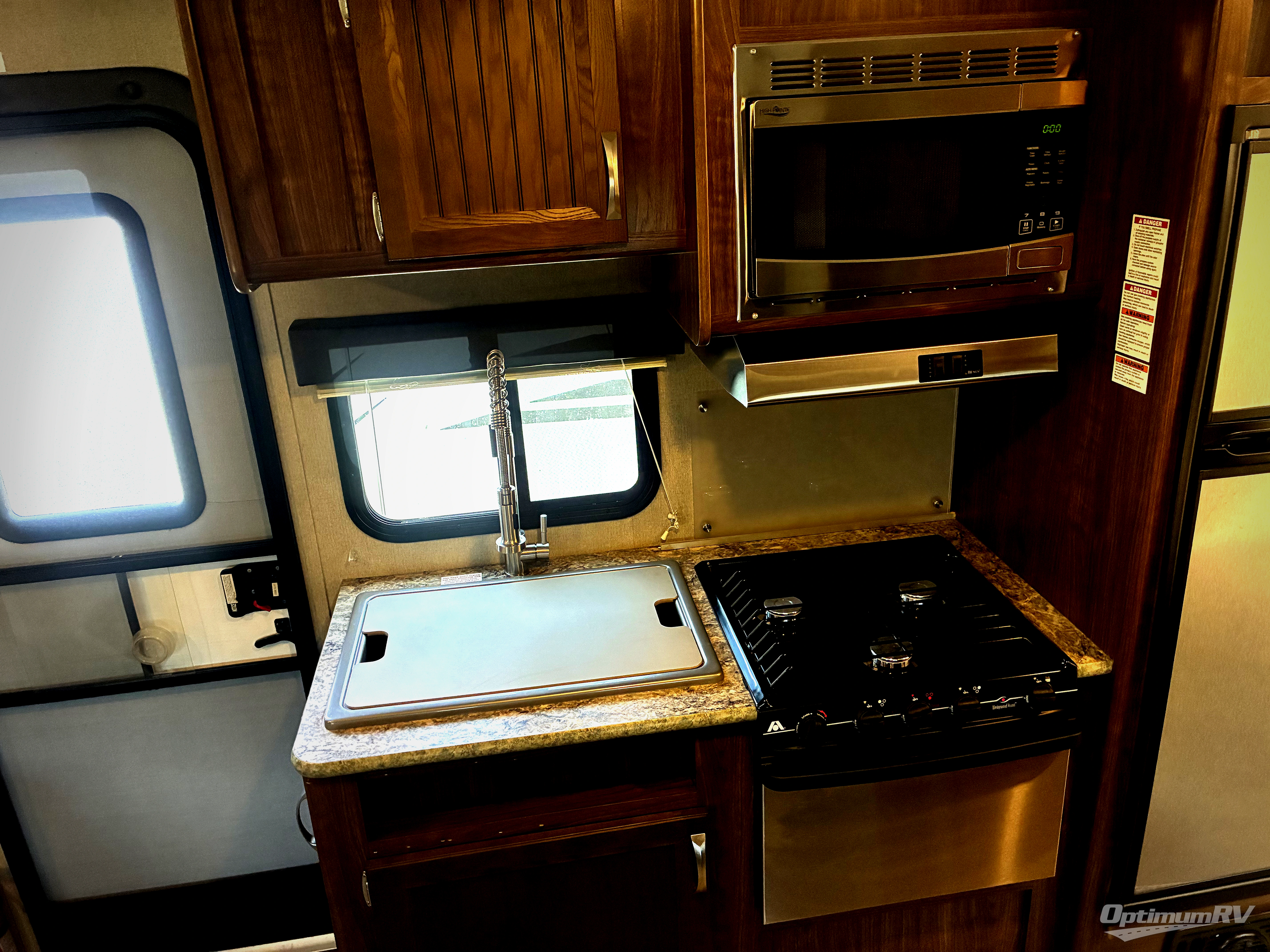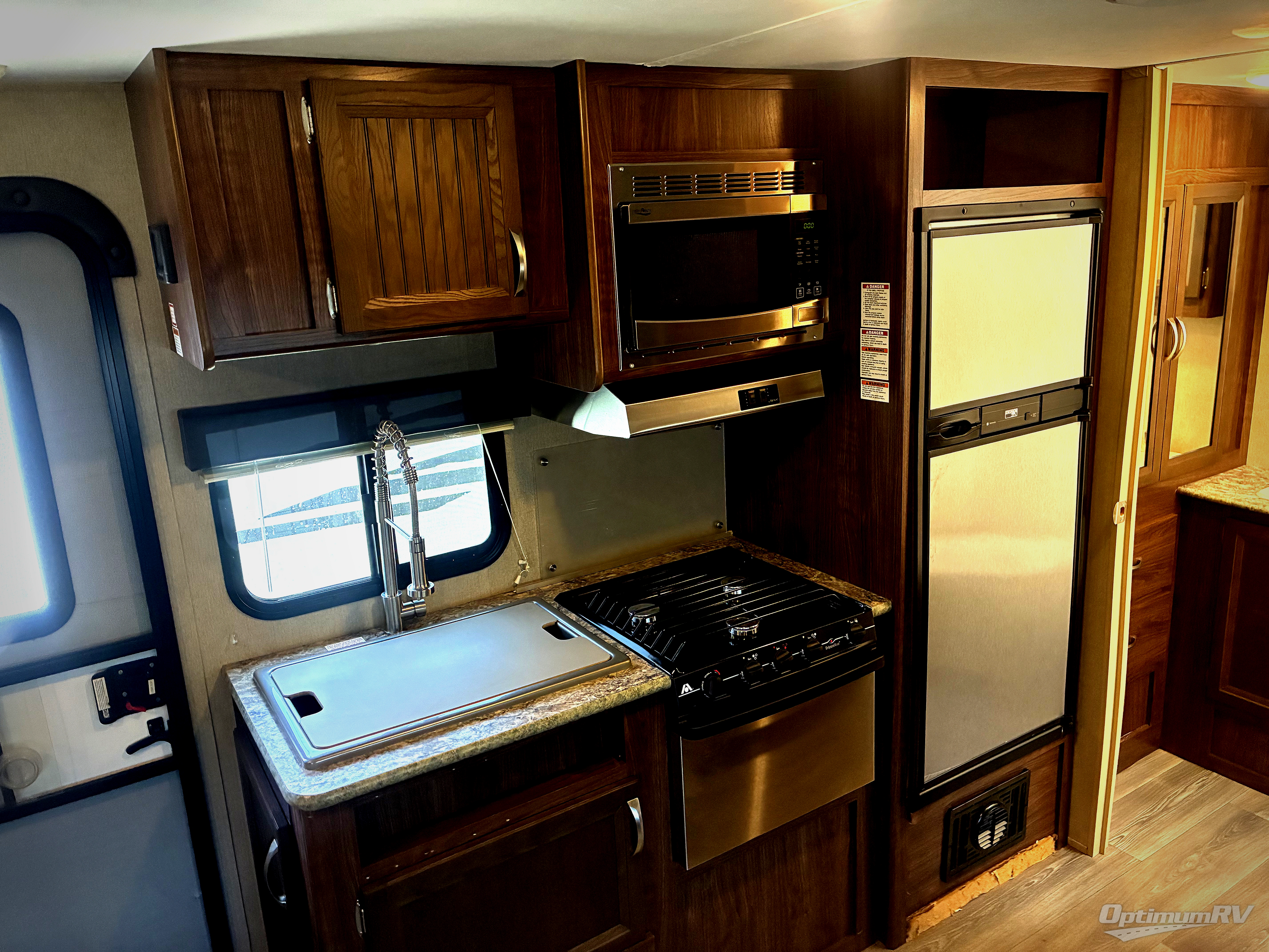 Along the curbside wall the kitchen amenities include a double sink, three burner range with microwave above, overhead cabinets, and a refrigerator.