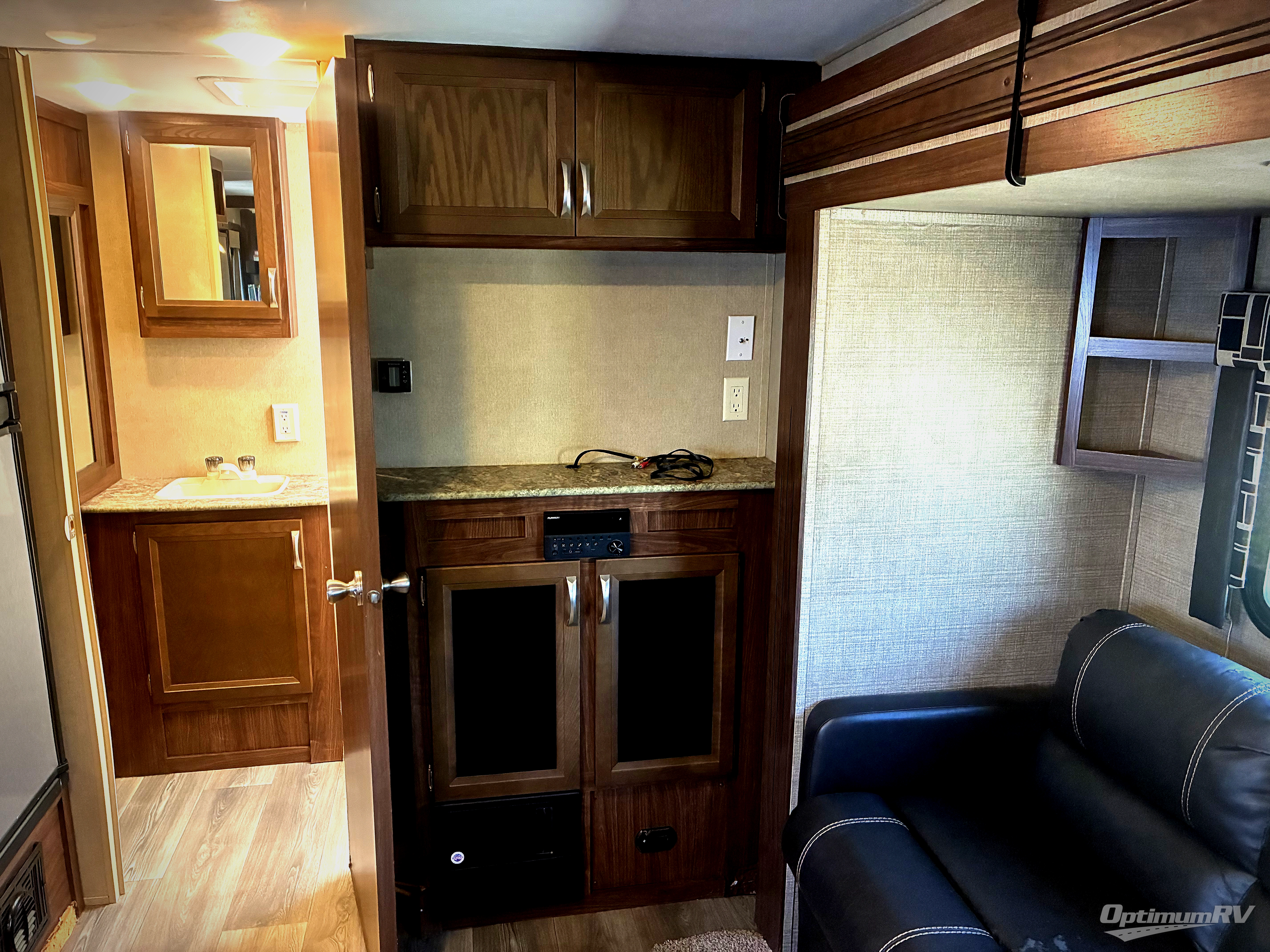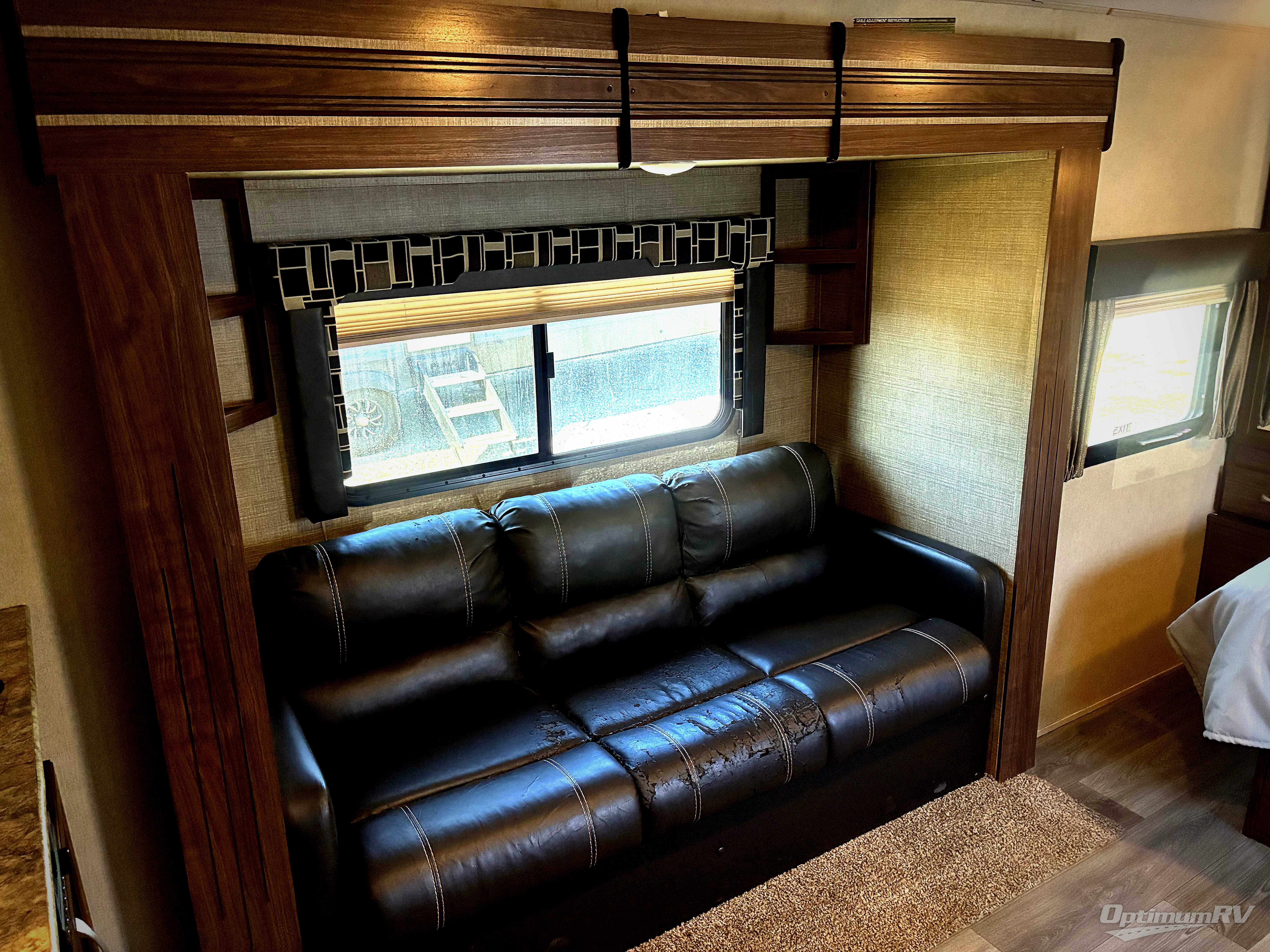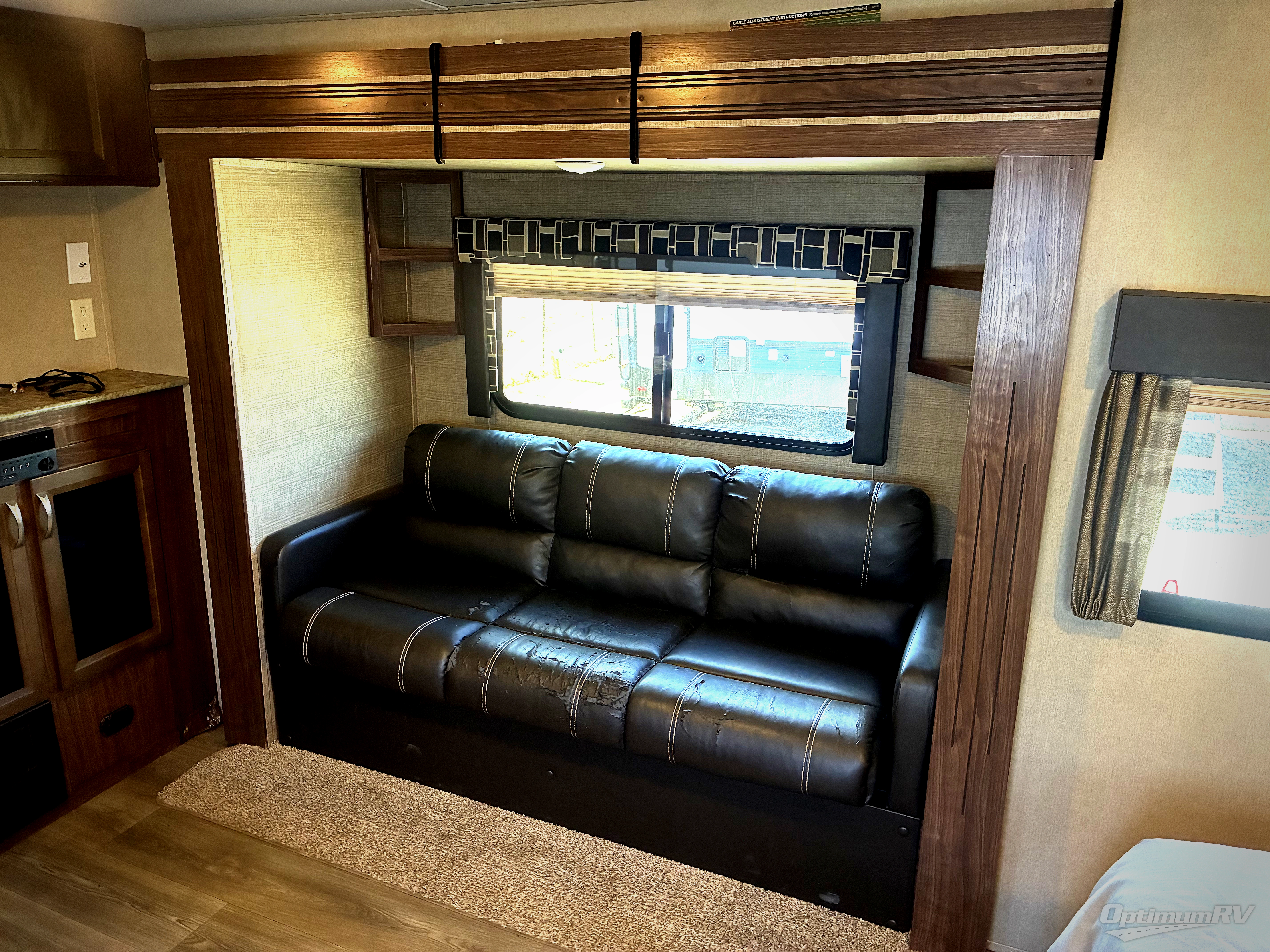 On the opposite side there is a slide out fold-down sofa with overhead storage for your books and such, plus an indoor/outdoor table. If you enjoy watching TV, a cabinet is next to the sofa.