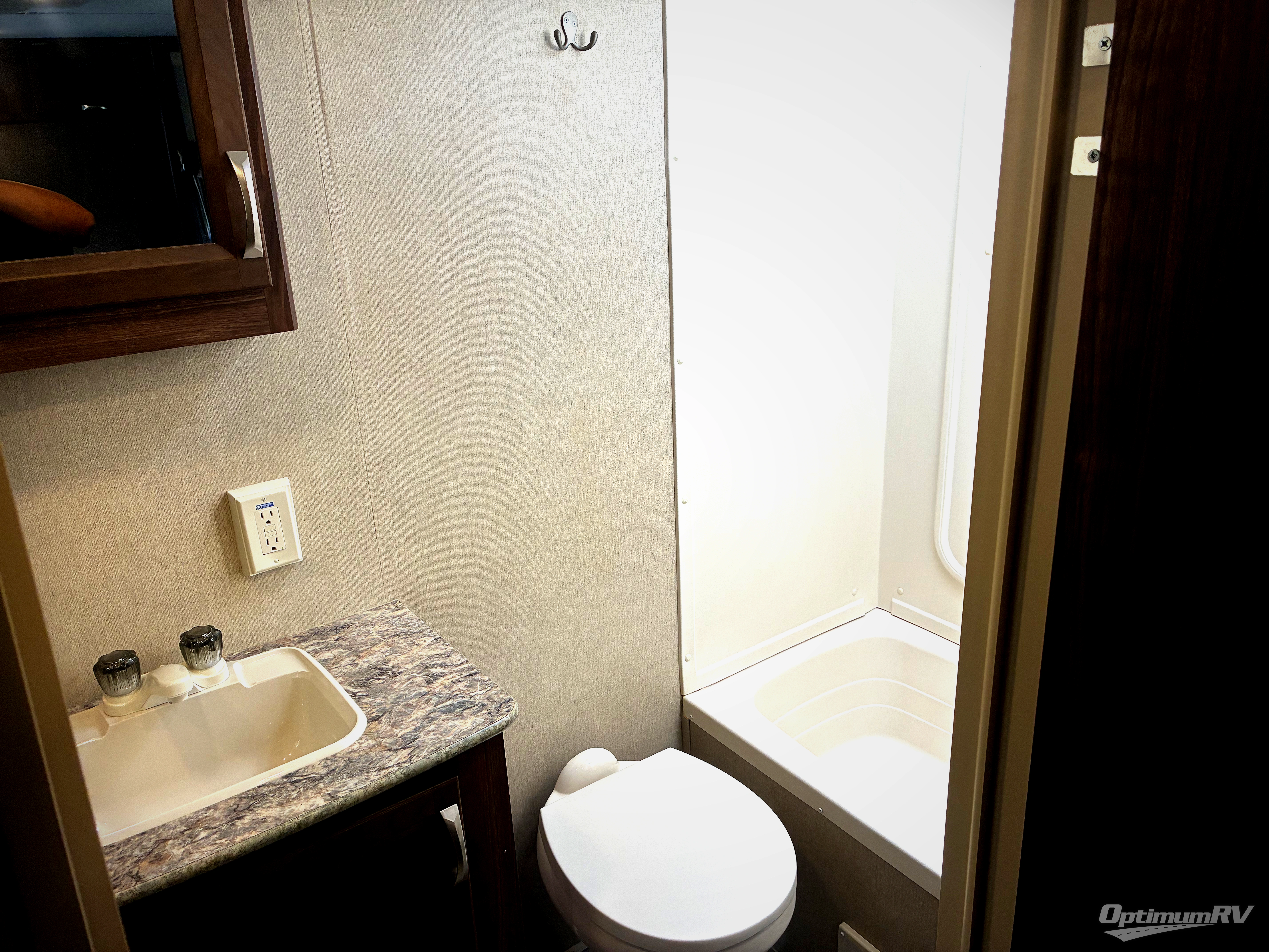 The full bathroom is in the rear of the trailer. There is a tub/shower, toilet, sink, and a wardrobe.