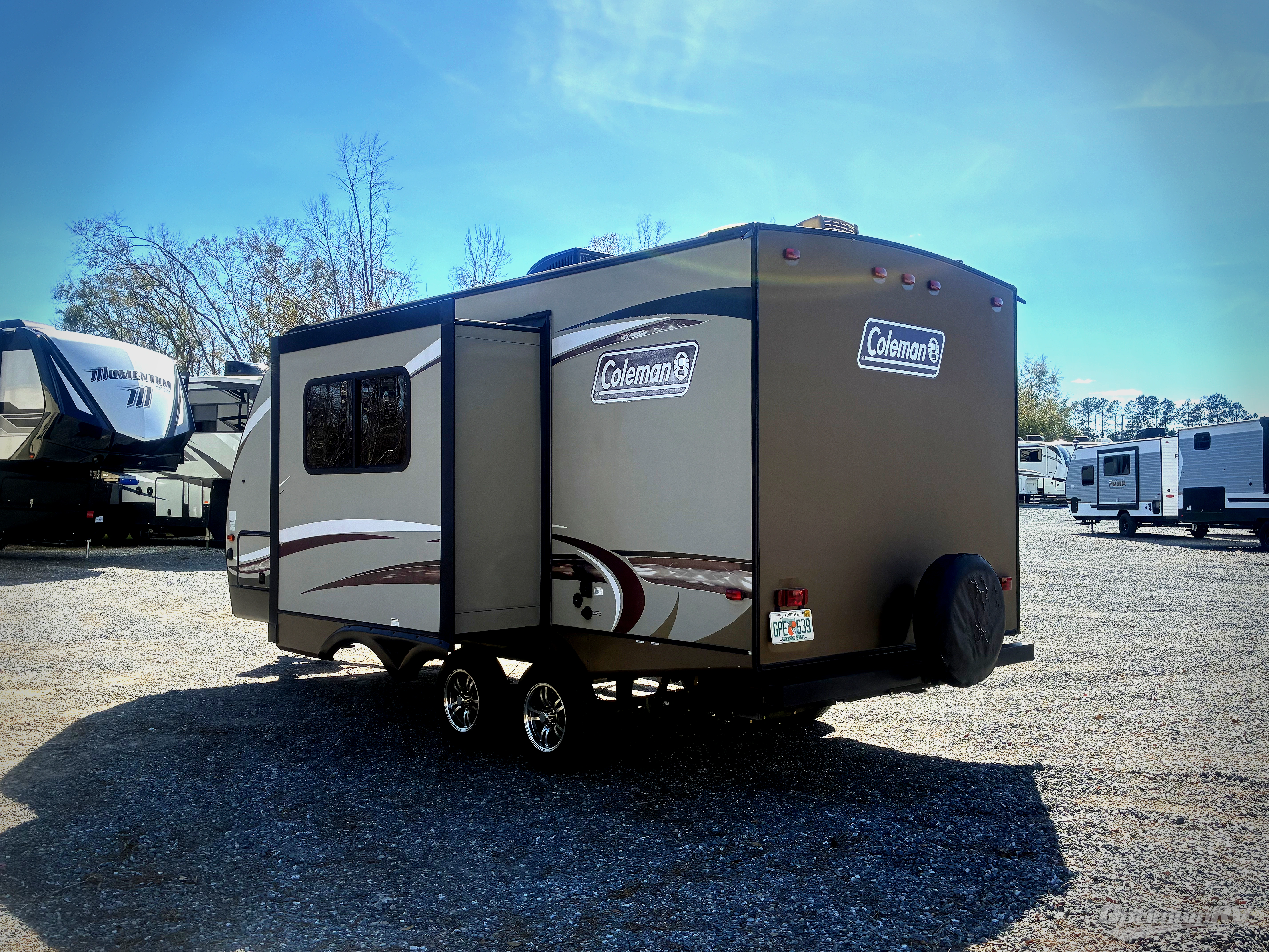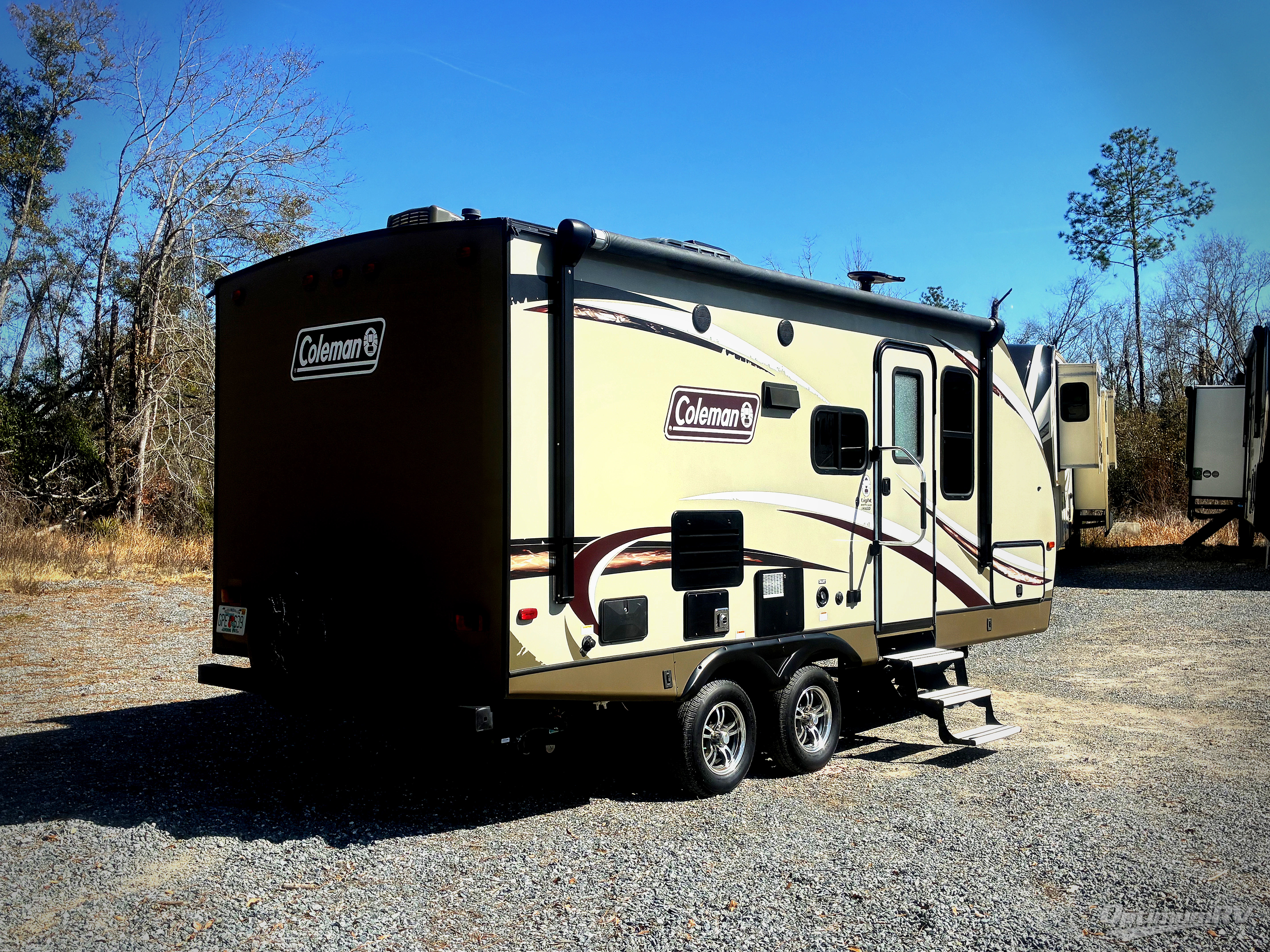 If you are looking for sleeping space for 4, a single slide out, and a full rear bath, plus a front queen bed then take a look at this Coleman Light 1805RB by Dutchmen RV.