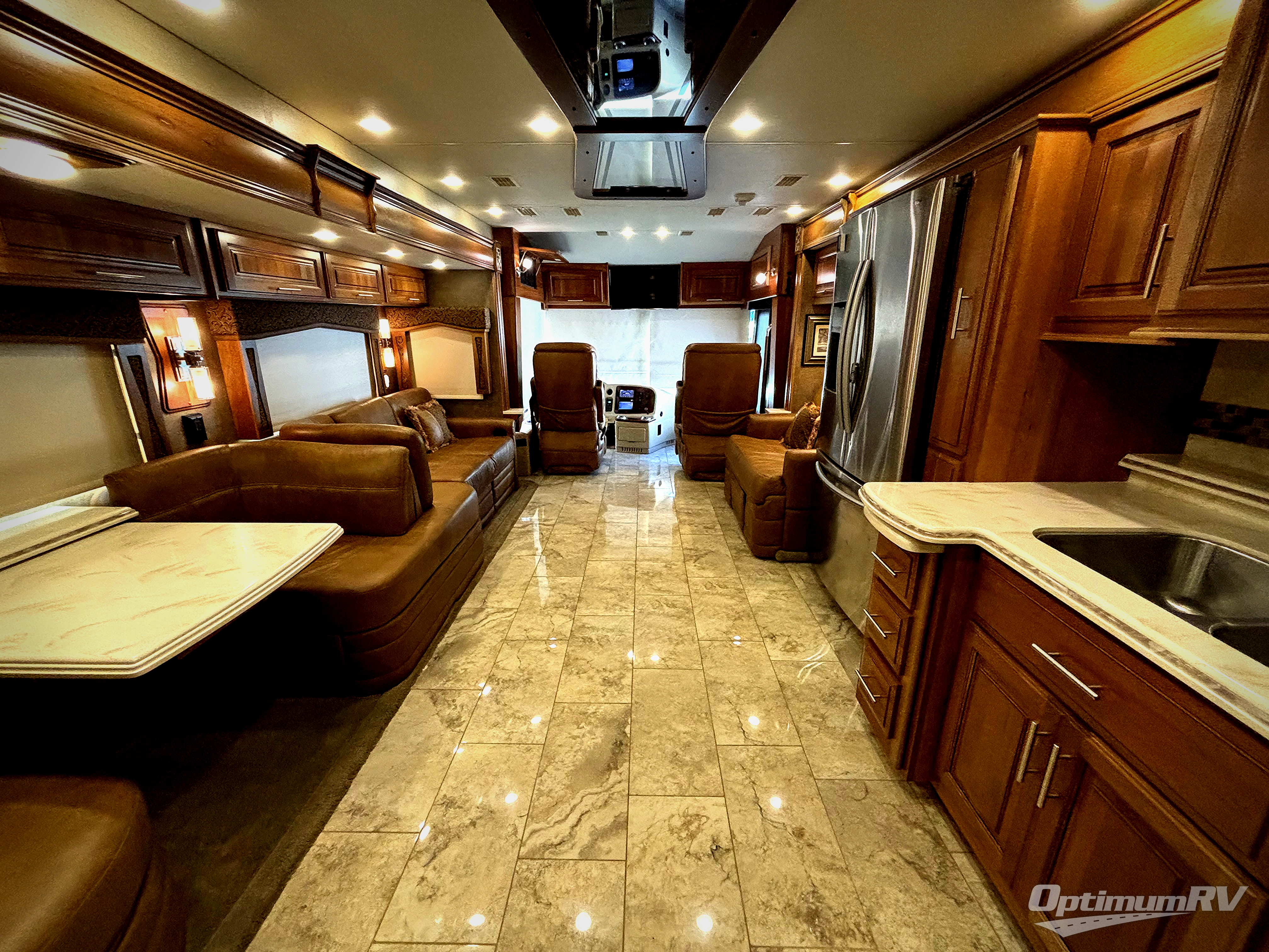 On the passenger side of the motor home, you will find a slide with a hide-a-bed sofa or an optional easy bed, a refrigerator, pantry, double kitchen sink, microwave, overhead cabinets, a shelf, and a two burner range. Next to the slide you will find a washer and dryer. The opposite side of the motor home has a slide with a sofa and dinette, or you can choose an optional free-standing table and desk with chairs plus a hide-a-bed. Next to the slide there is an entertainment center with a 48" LED TV, and a fireplace option.