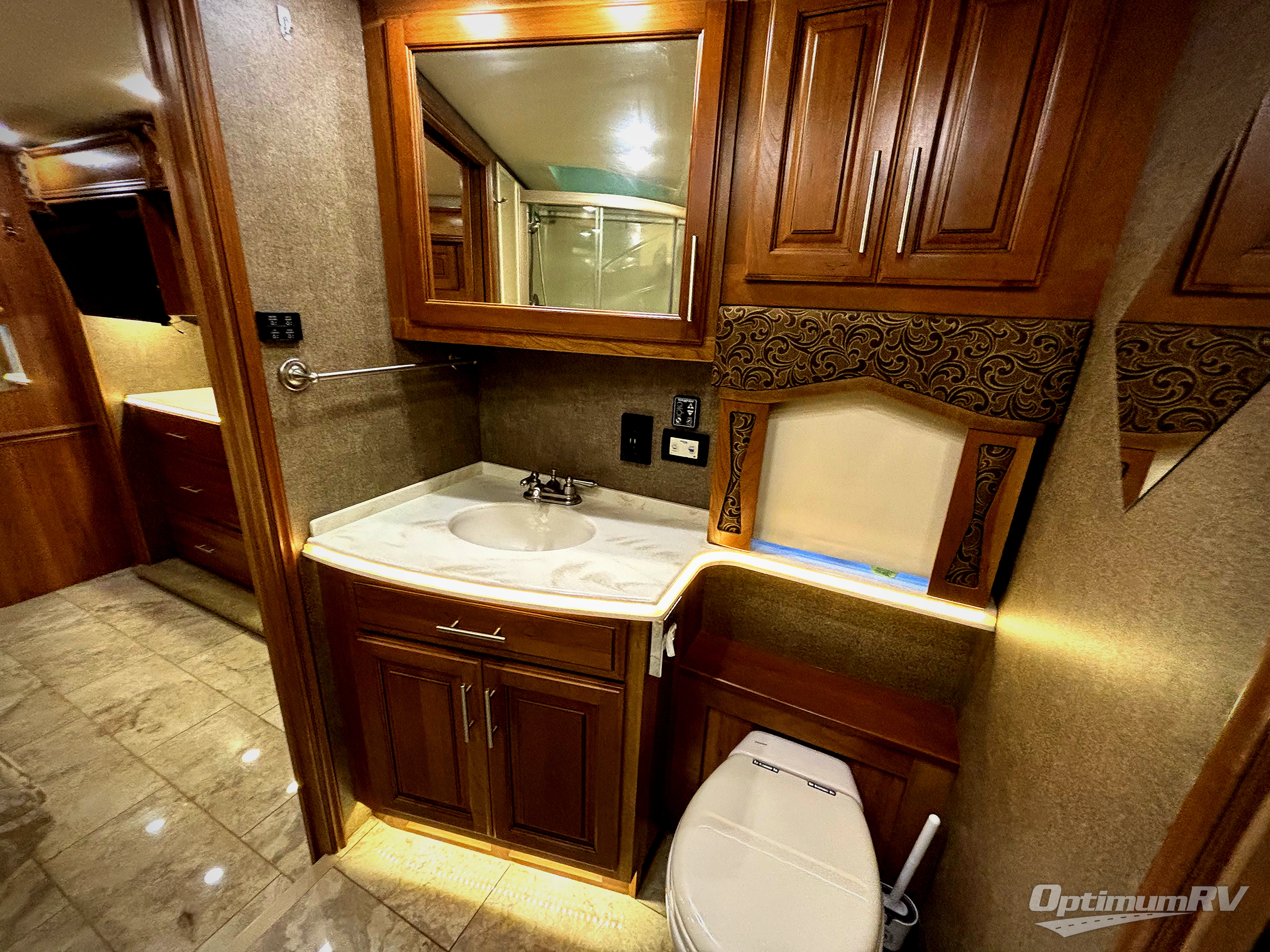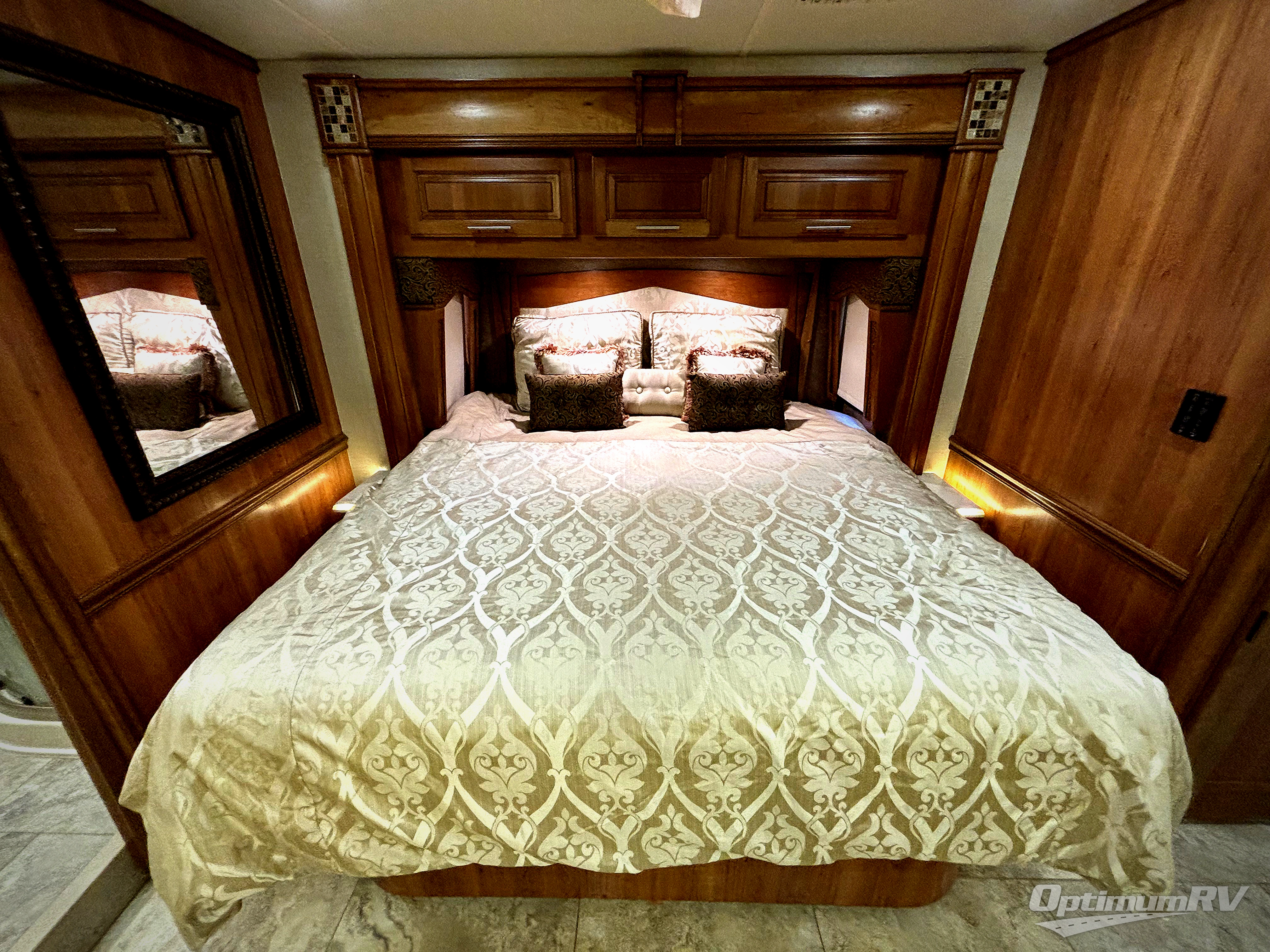 The bedroom offers a king bed slide with nightstands. Across from the bed there is a slide with a vanity and dresser, overhead cabinets, and a 32" LED TV. In the rear of the motor home you will find a master bath with a corner shower, linen cabinet, toilet, sink, and medicine cabinet. Along the full rear wall there is a wardrobe with sliding mirror doors.