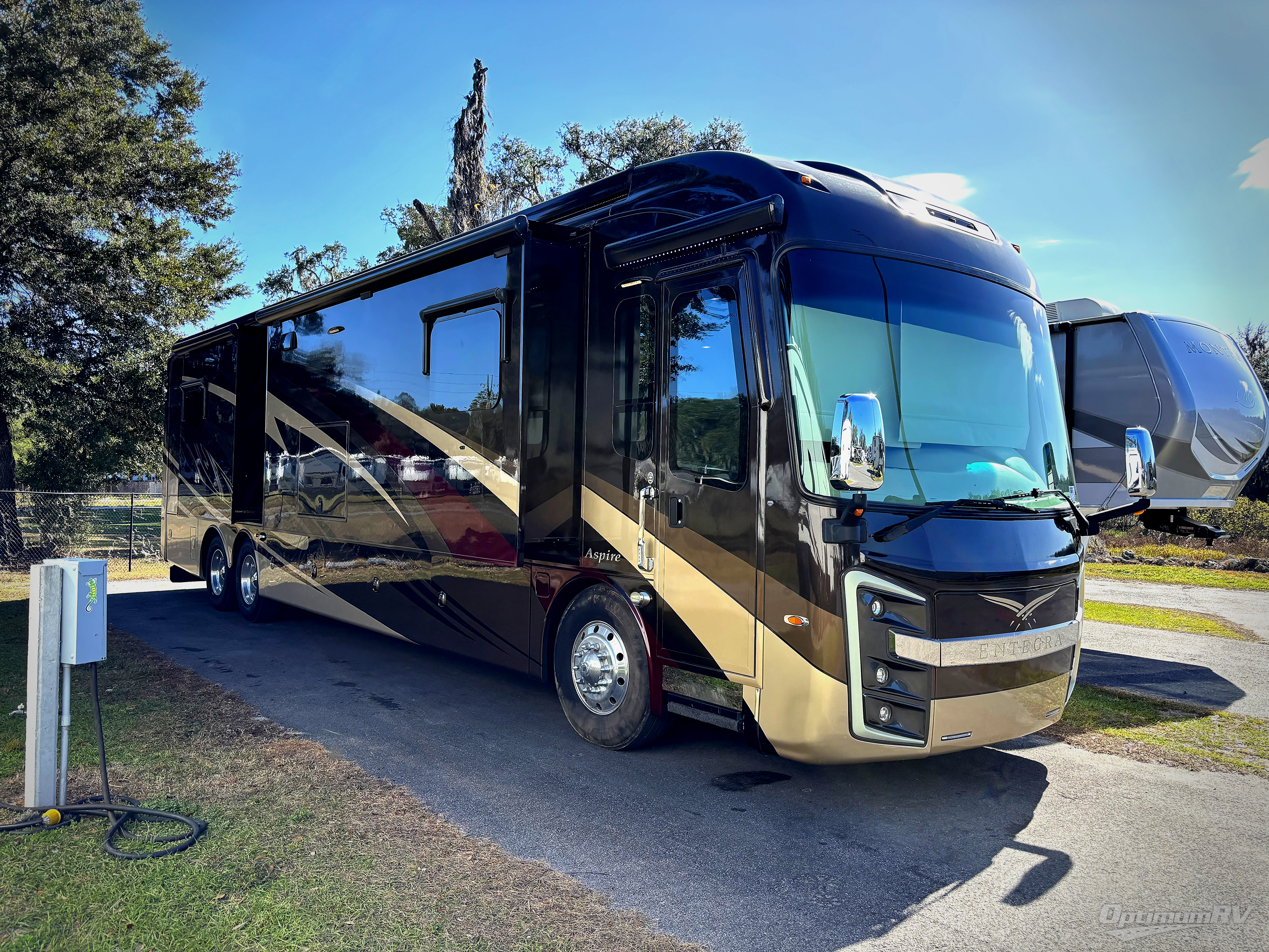 This Aspire 42RBQ class A diesel motor home by Entegra Coach offers quad slides for plenty of walking around room, a bath and a half, and an outside entertainment center with a 40" LED TV to watch your favorite shows in the great outdoors, plus more!