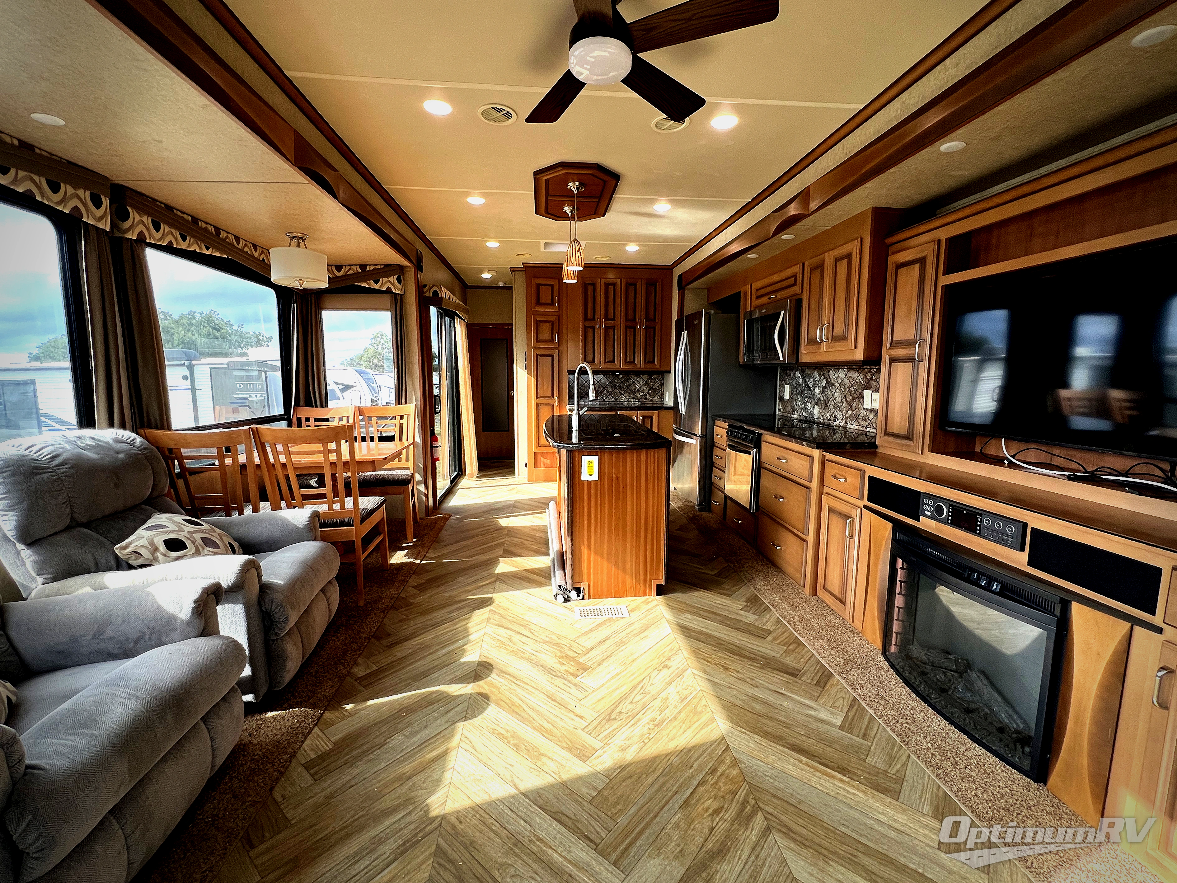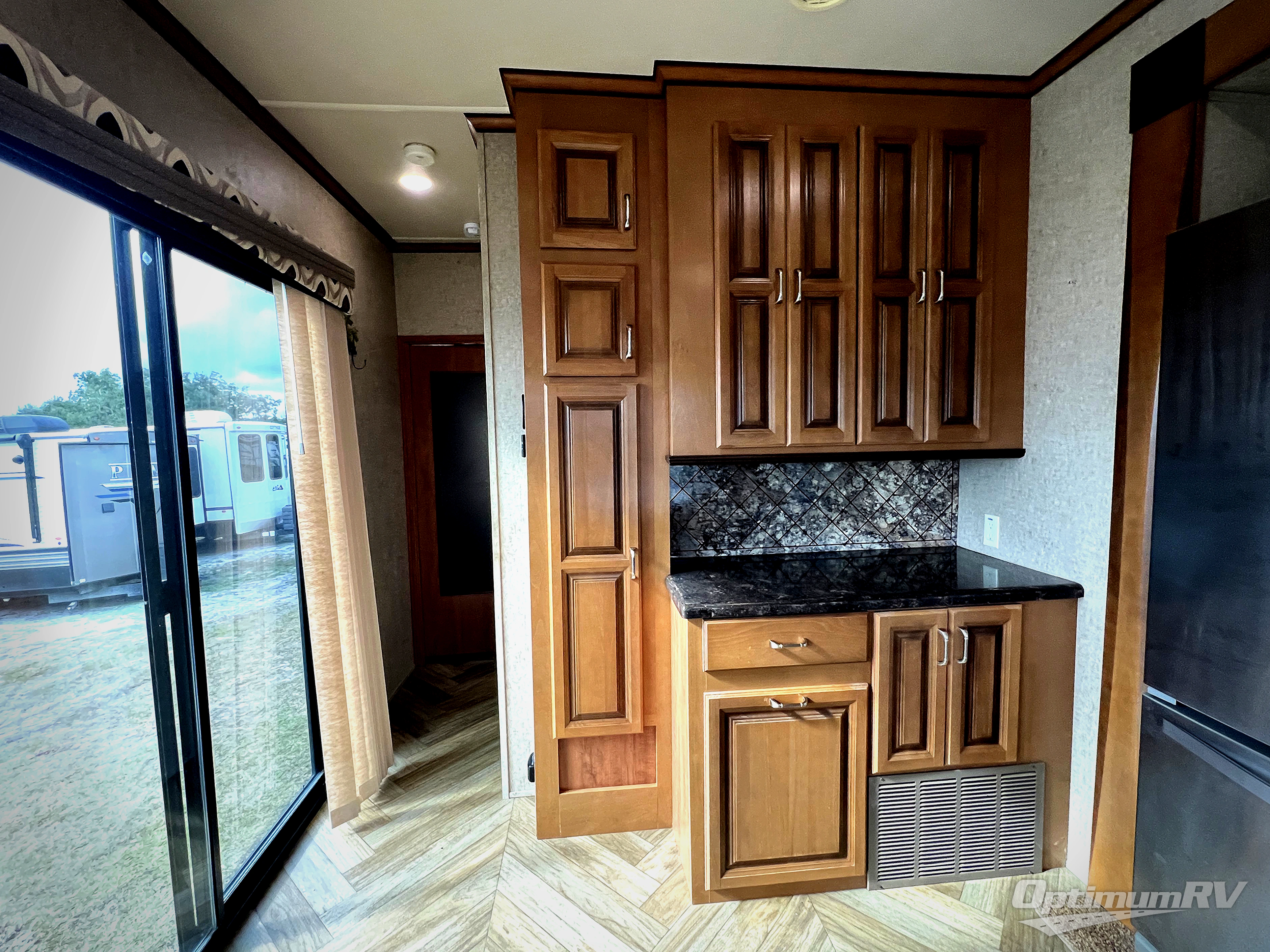 Inside the front main entrance you will find to the right a kitchen and living area. This space offers dual opposing slides which provides a wide open feel space. The first slide has a free-standing table and chairs along with two additional lounge chairs. In the front of the trailer, there is a sofa with end tables. The second slide offers a refrigerator, pantry, three burner range, microwave, and pantry with dressers below. You will also find an entertainment center with a fireplace below in this same slide out. Adjacent to the refrigerator there is extra counter space as well as an overhead cabinet. Meal prep is a bit easier with the center island. You will also find that the double kitchen sink is located in the island. To help with clean-up you can opt for a dishwasher.