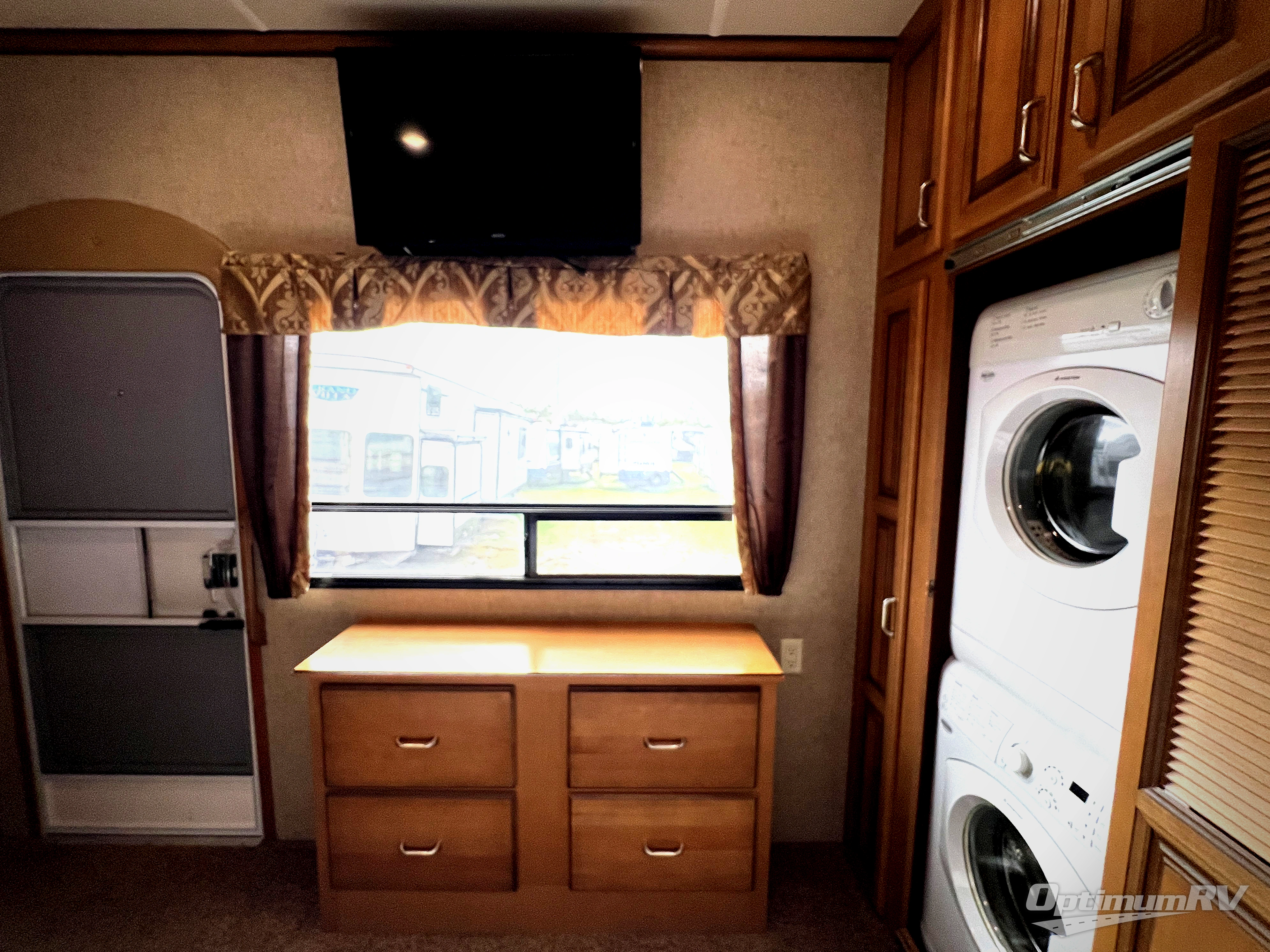 The rear bedroom provides a relaxing retreat where you can enjoy a queen bed slide with overhead cabinet, and shelves. Along the rear wall find a wardrobe, washer and dryer prepped area in case you wish to add the appliances for more convenience, and drawer space. You will also find a dresser opposite the bed for additional storage. There is a convenient second entry door into the bedroom.