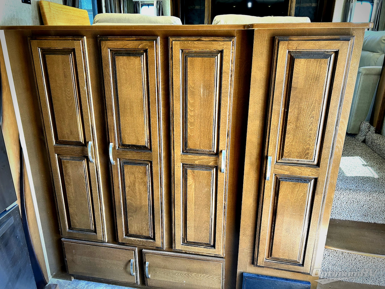 A sliding door at the end of the hall takes you into the rear master bedroom where again you will find a spacious room thanks to dual opposing slides. Along the curb side a slide out queen or king bed option, shelves, and an overhead storage cabinet for your things. On the opposite side of the room enjoy a slide out wardrobes with a TV in the center, and a space for a washer/dryer in the corner along the outer bathroom wall, plus so much more!