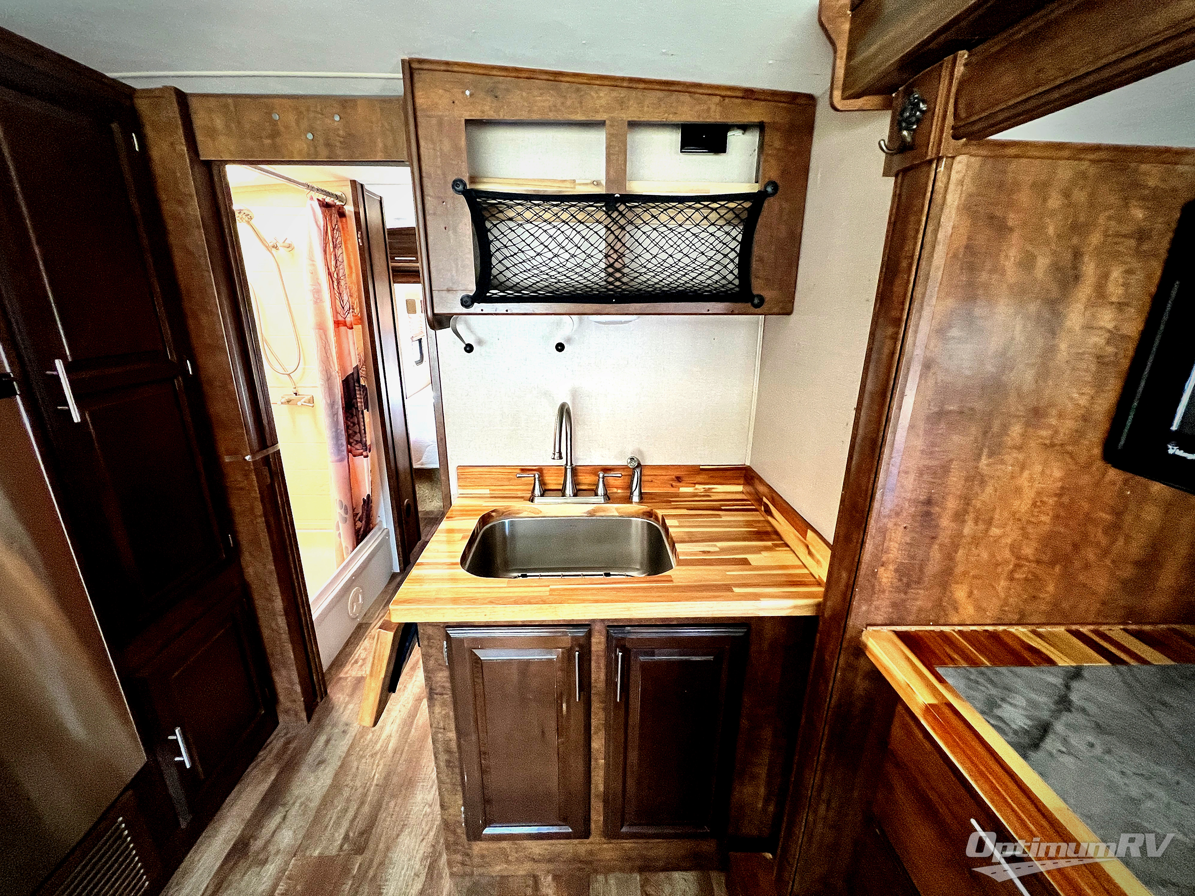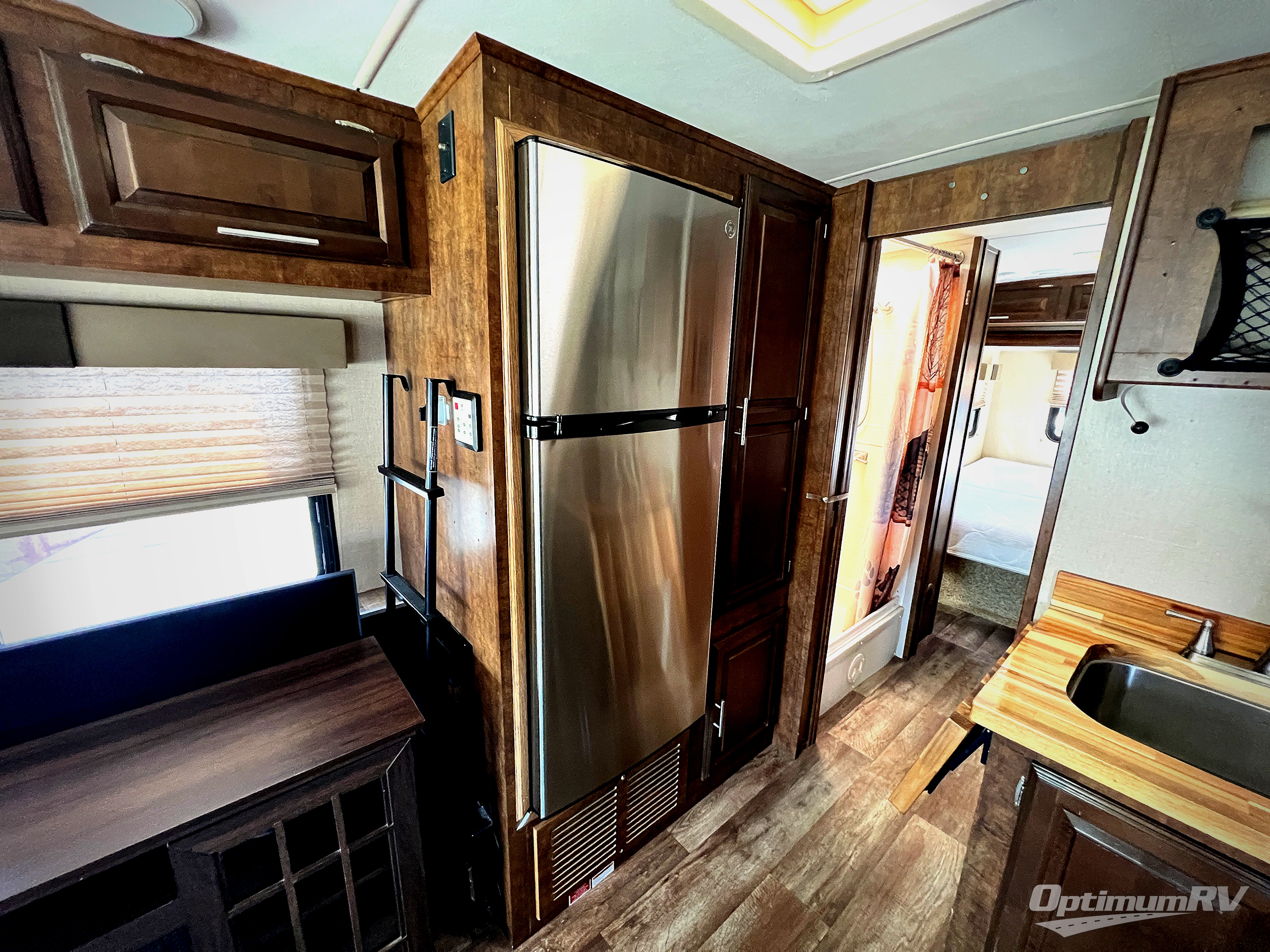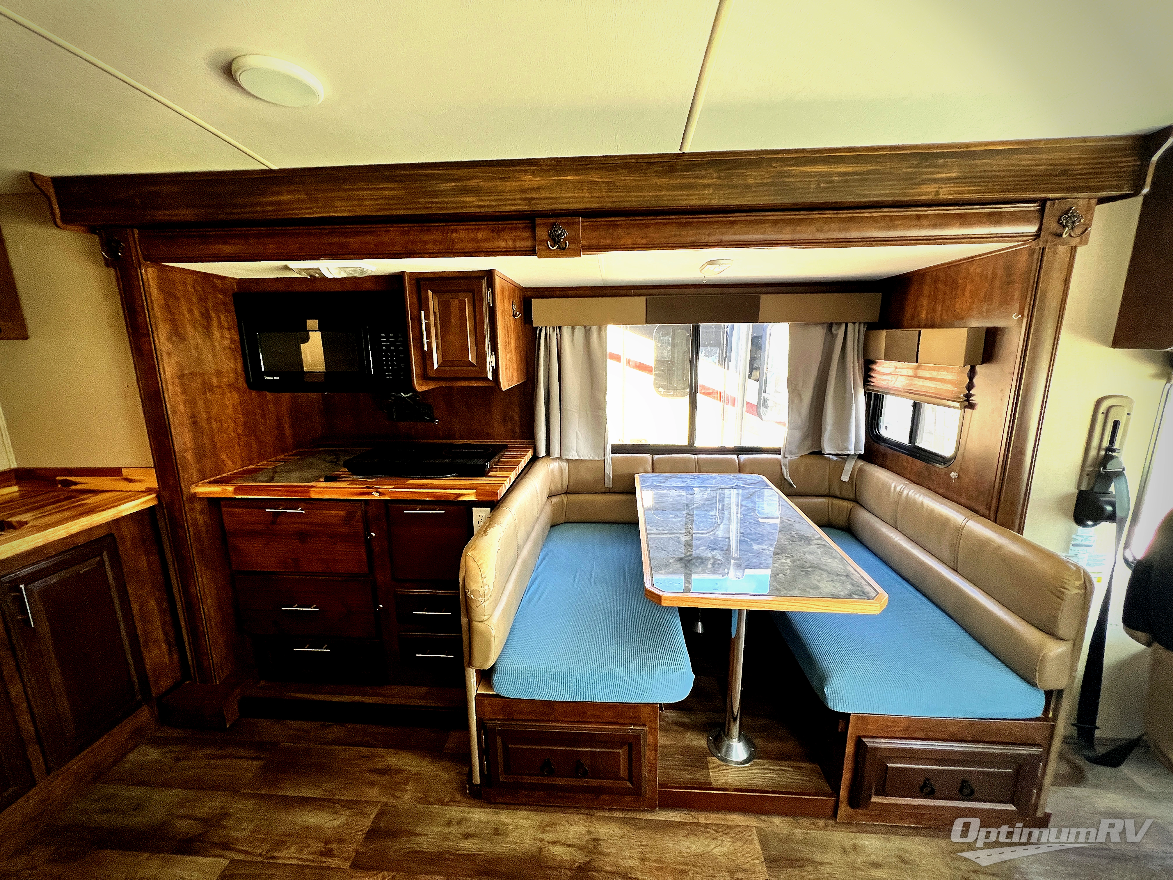 As you enter the motor home, on the left you will find a jackknife sofa with footrests, refrigerator, and a pantry. On the opposite side there is a slide out with a wrap-around booth dinette, residential microwave, and three burner range, plus a pullout countertop. Adjacent to the slide you will find a double kitchen sink, another pullout countertop extension, and a 32" LED TV.