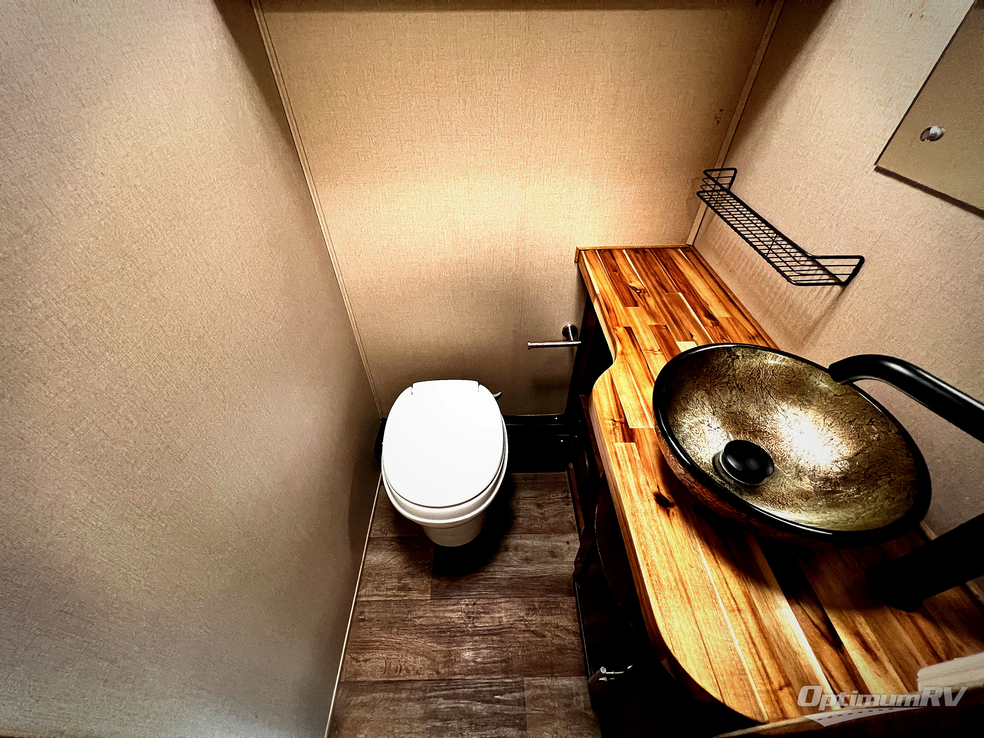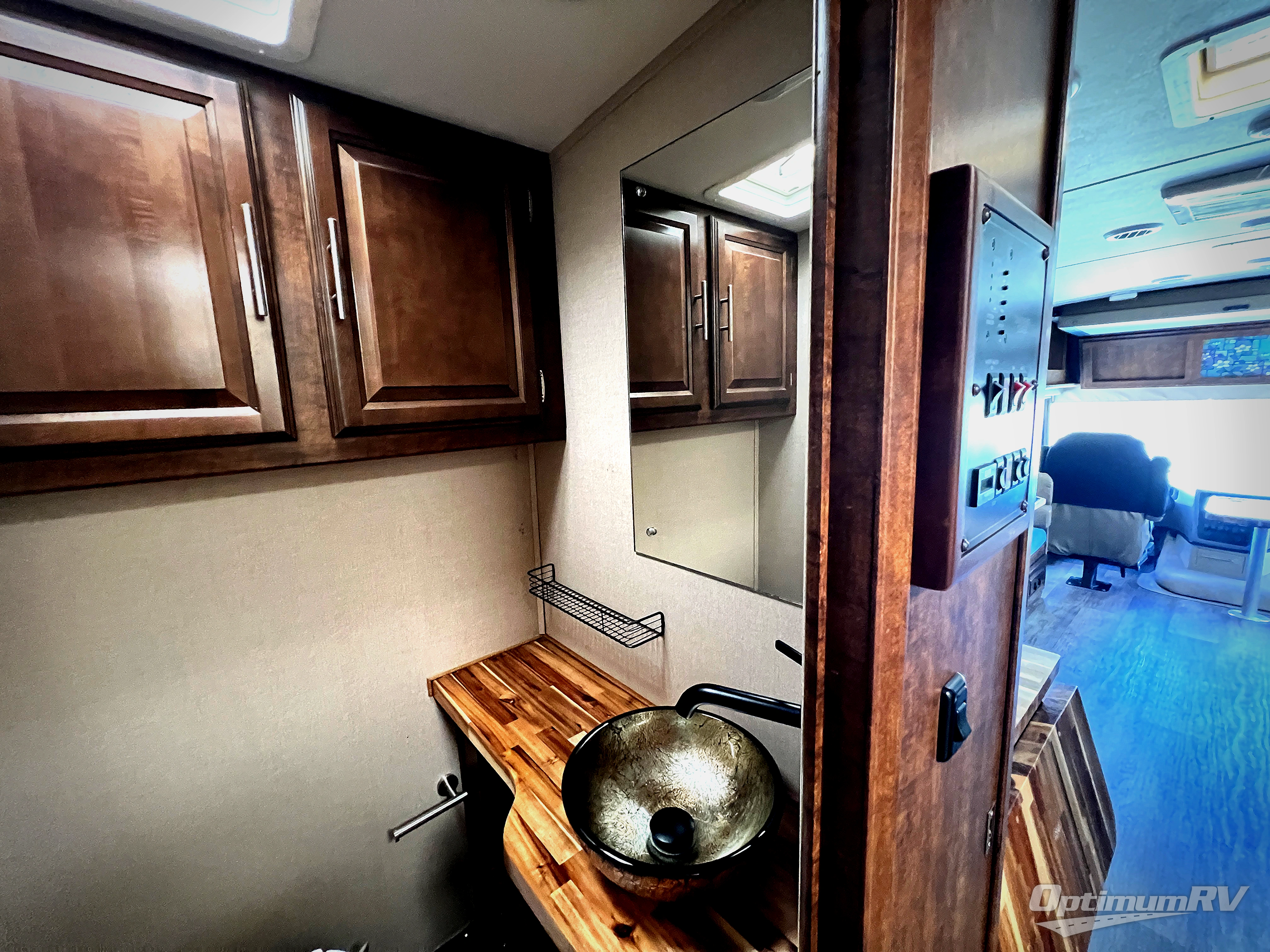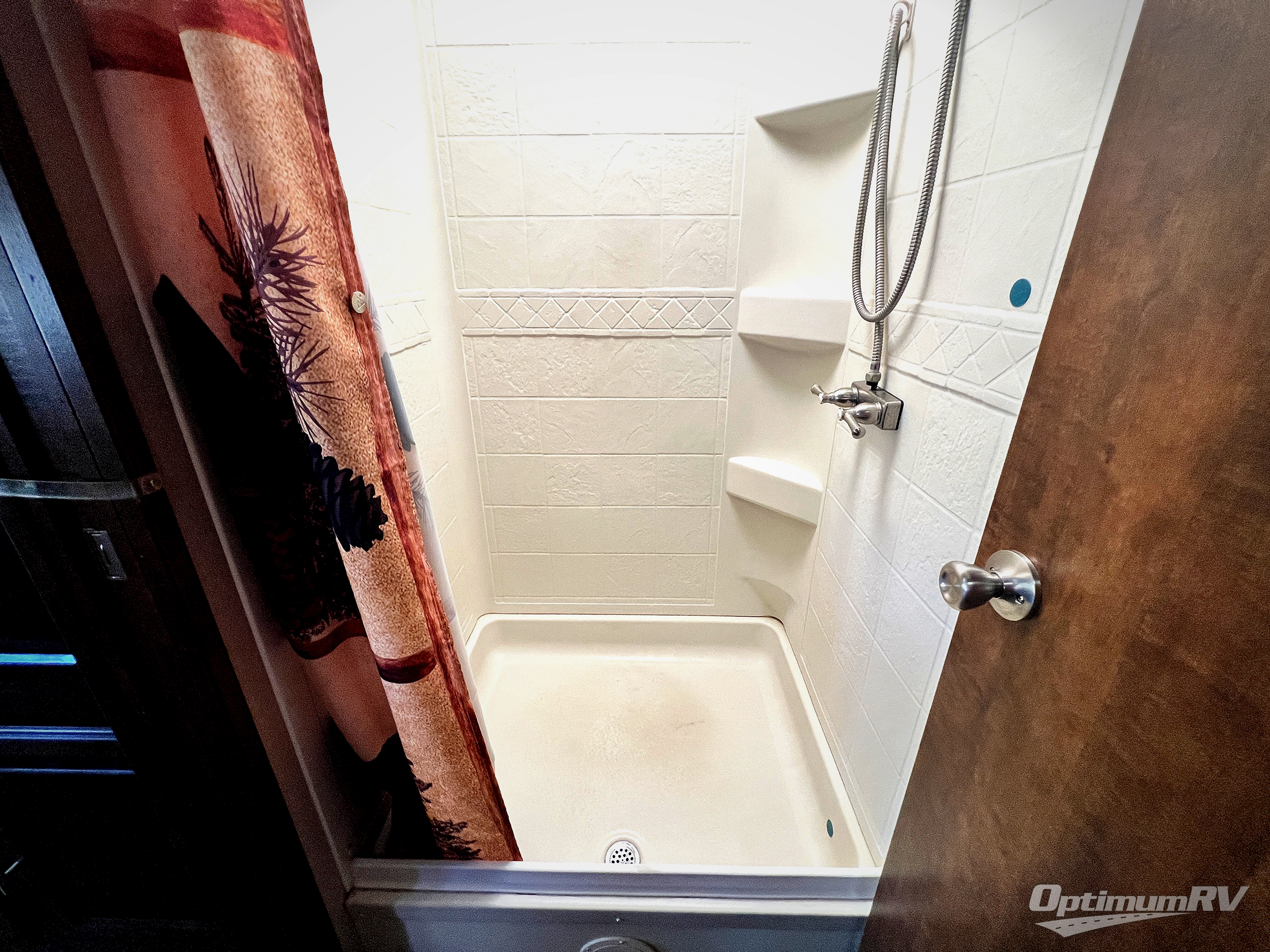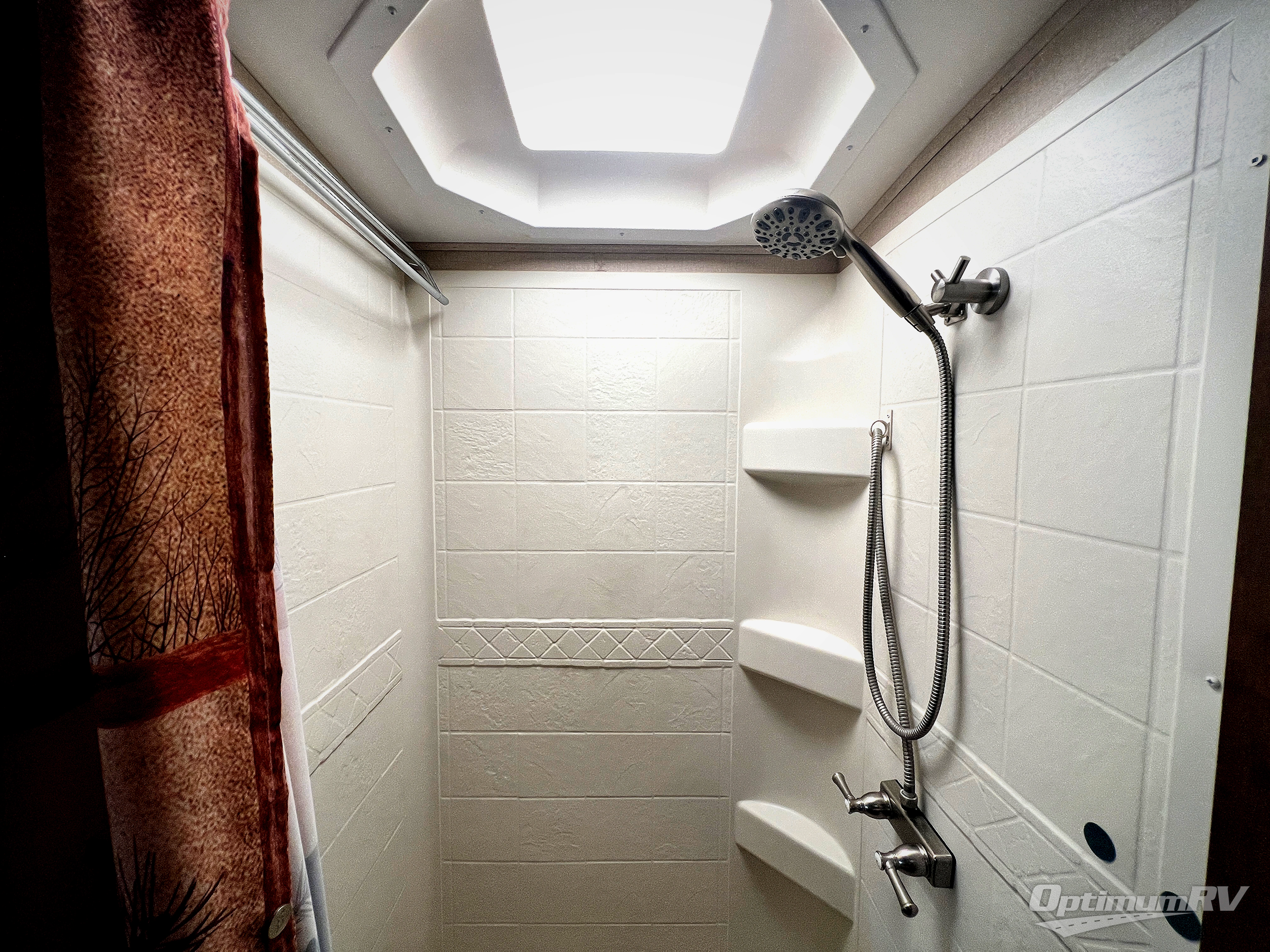 The walk-thru bathroom has a private toilet area with a sink on one side of the motor home and a shower on the other side as well as sliding doors to close off the whole bath area.