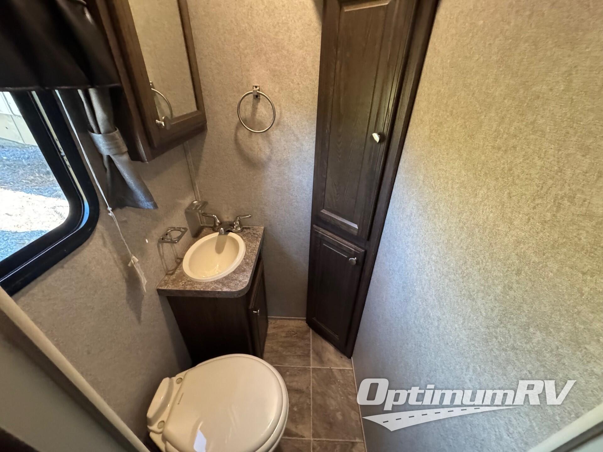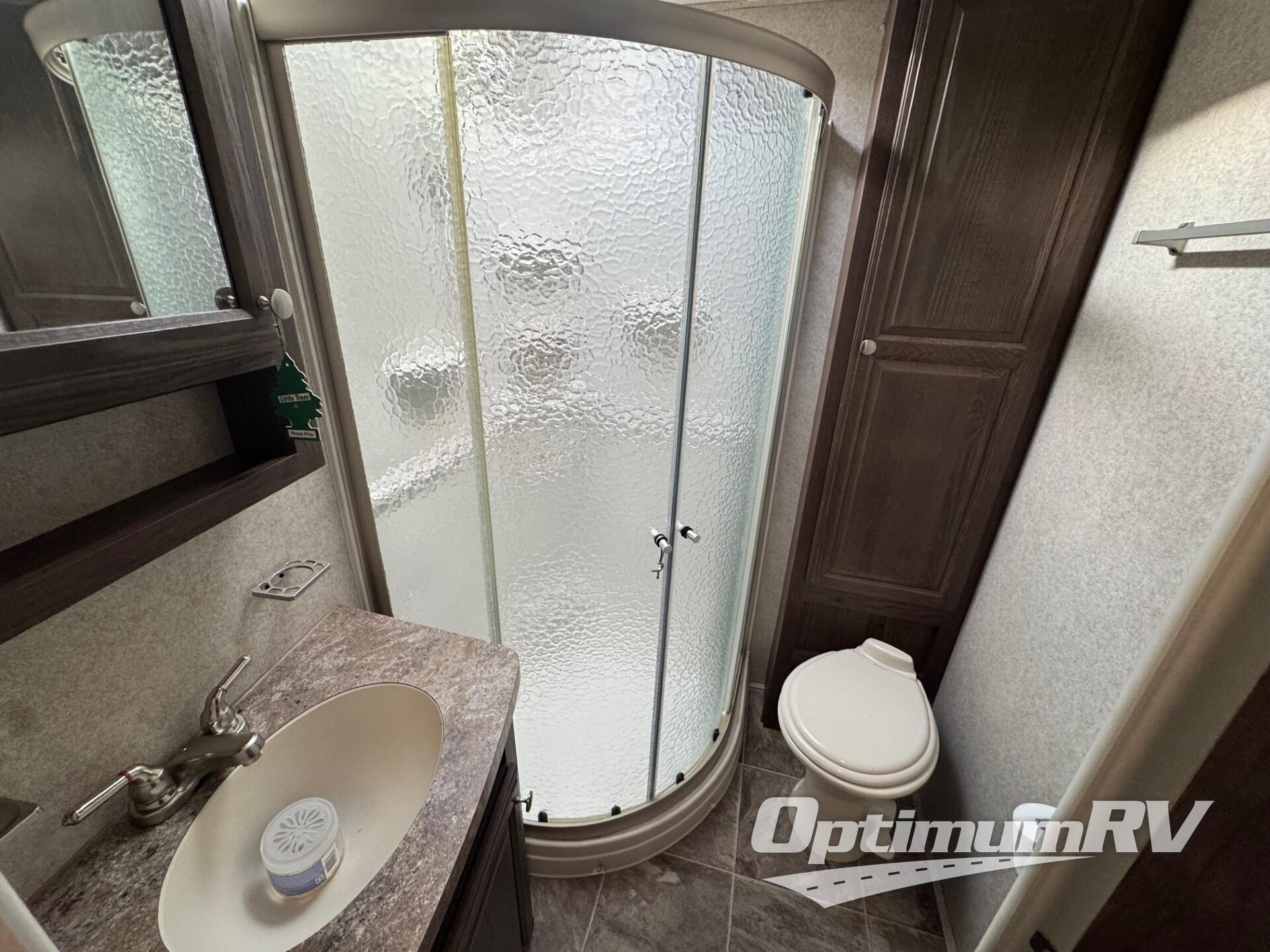 As you proceed toward the front of the fifth wheel, and step up the stairs, the bathroom is on the right. Inside the bath you will find a toilet, linen cabinet, radius front shower, sink, and handy medicine cabinet.