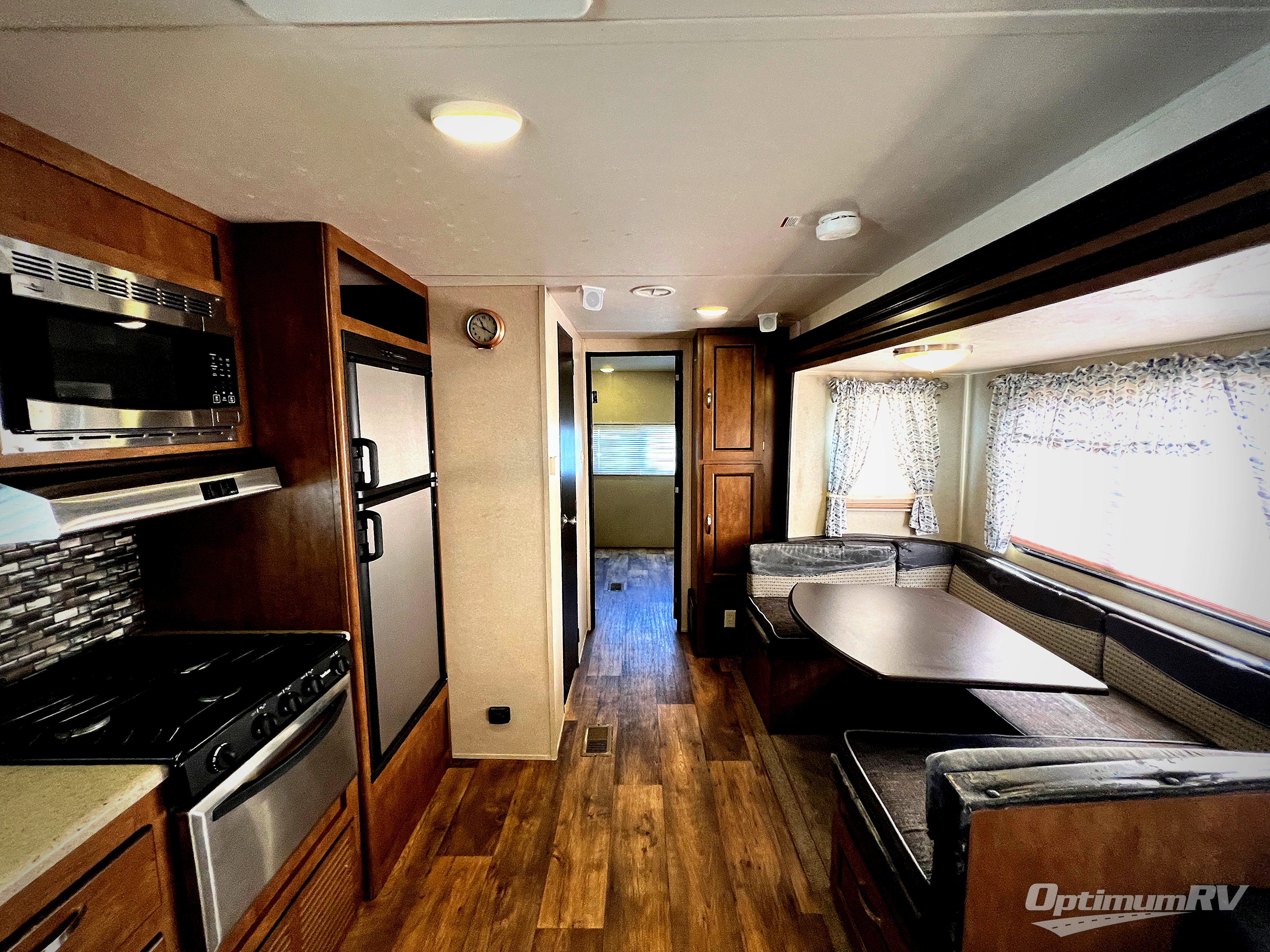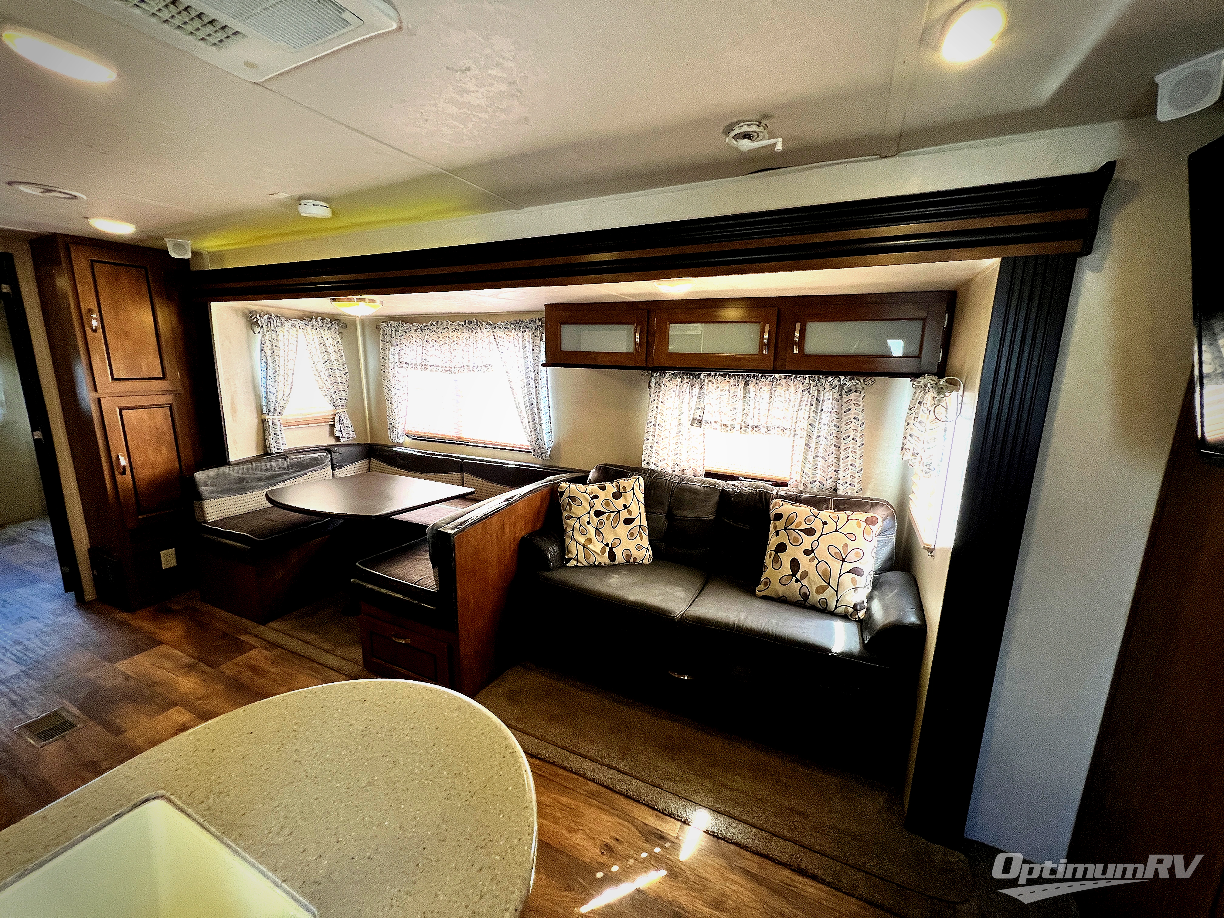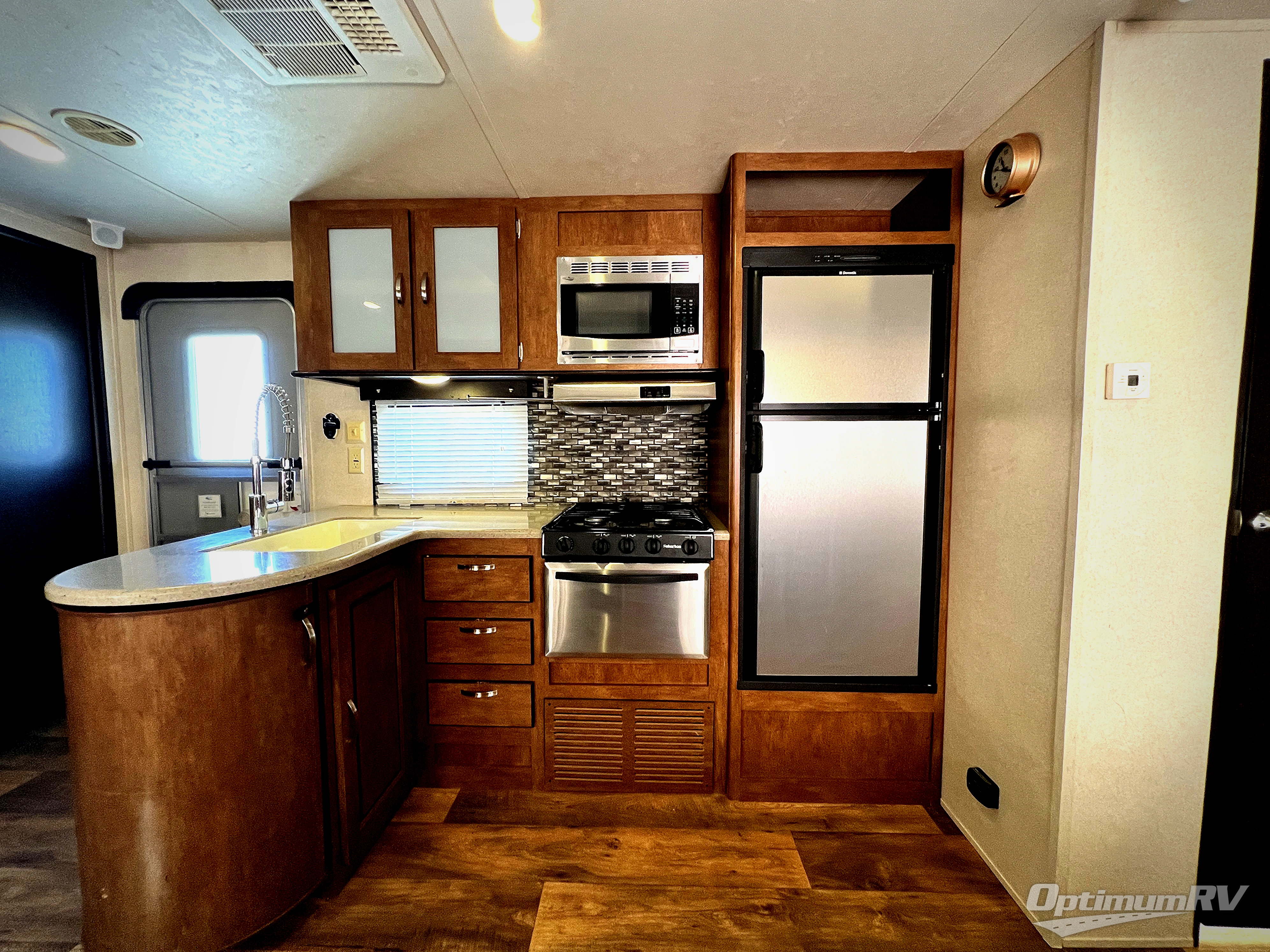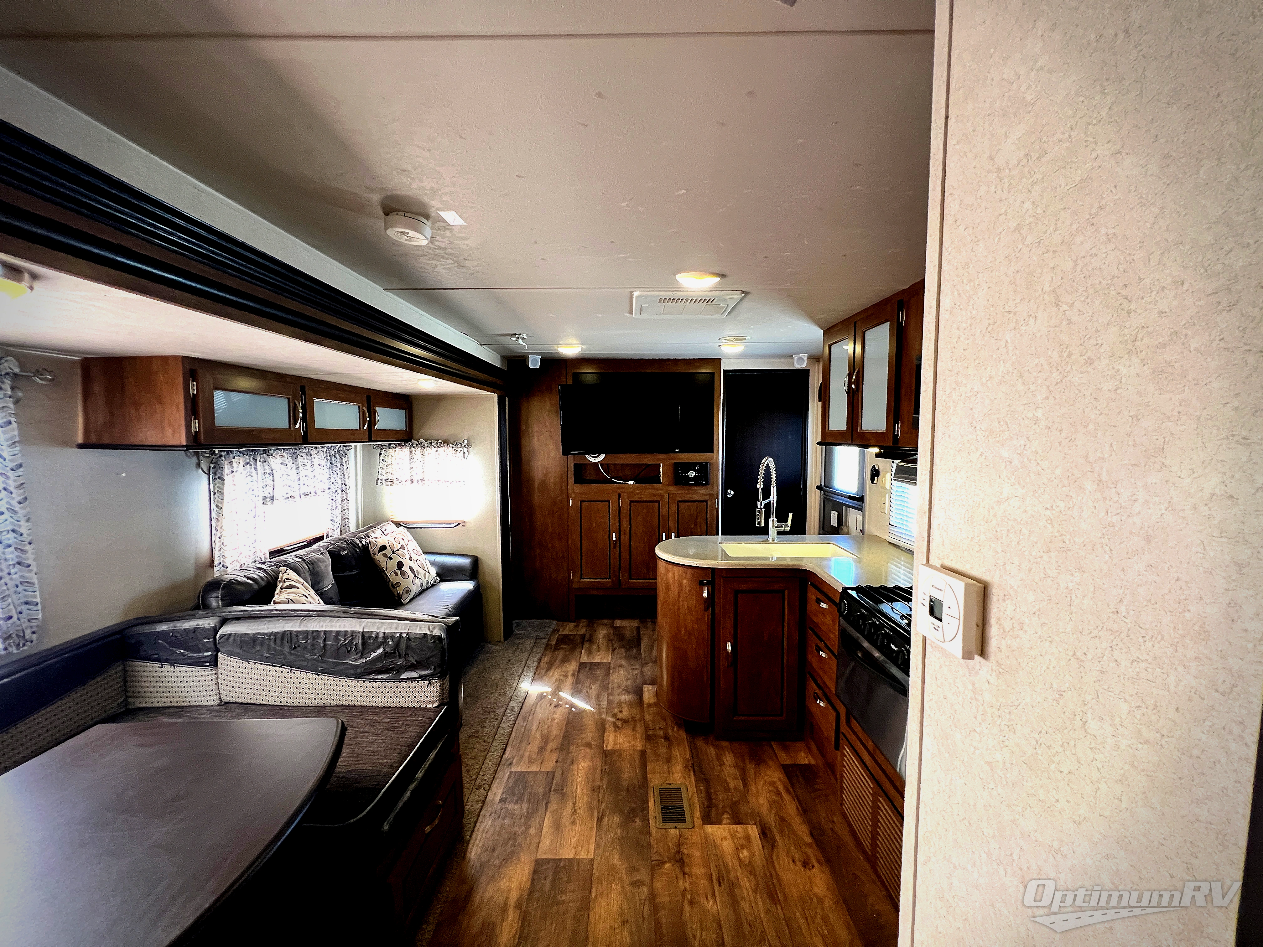 The main living area includes a road side slide out with a u-shaped dinette, and a sofa with overhead storage. Adjacent is an entertainment center for your inside enjoyment. Along the curb side wall you will find the kitchen amenities. There is a l-shaped counter with a double kitchen sink, three burner range with overhead microwave, and a refrigerator. A pantry for your non-perishables is next to the u-dinette.