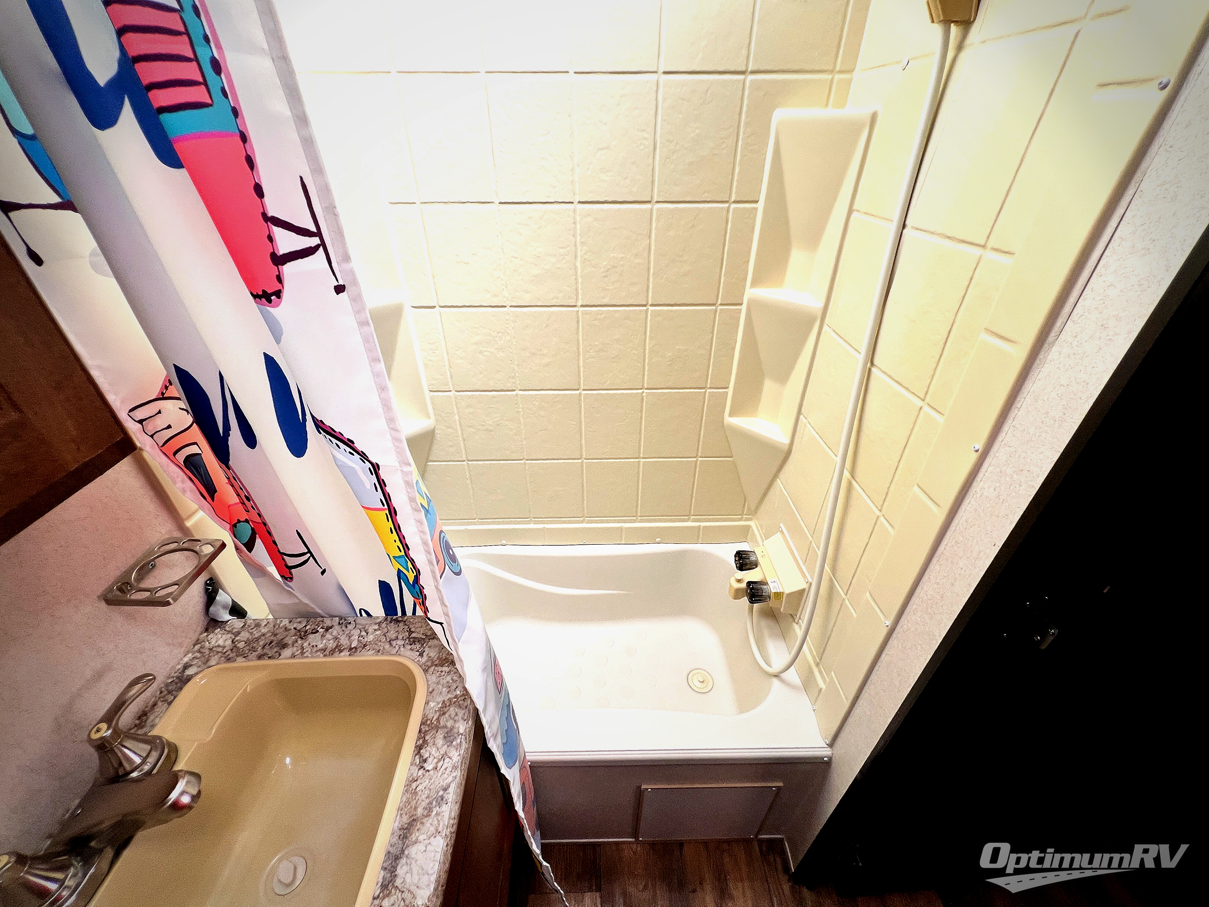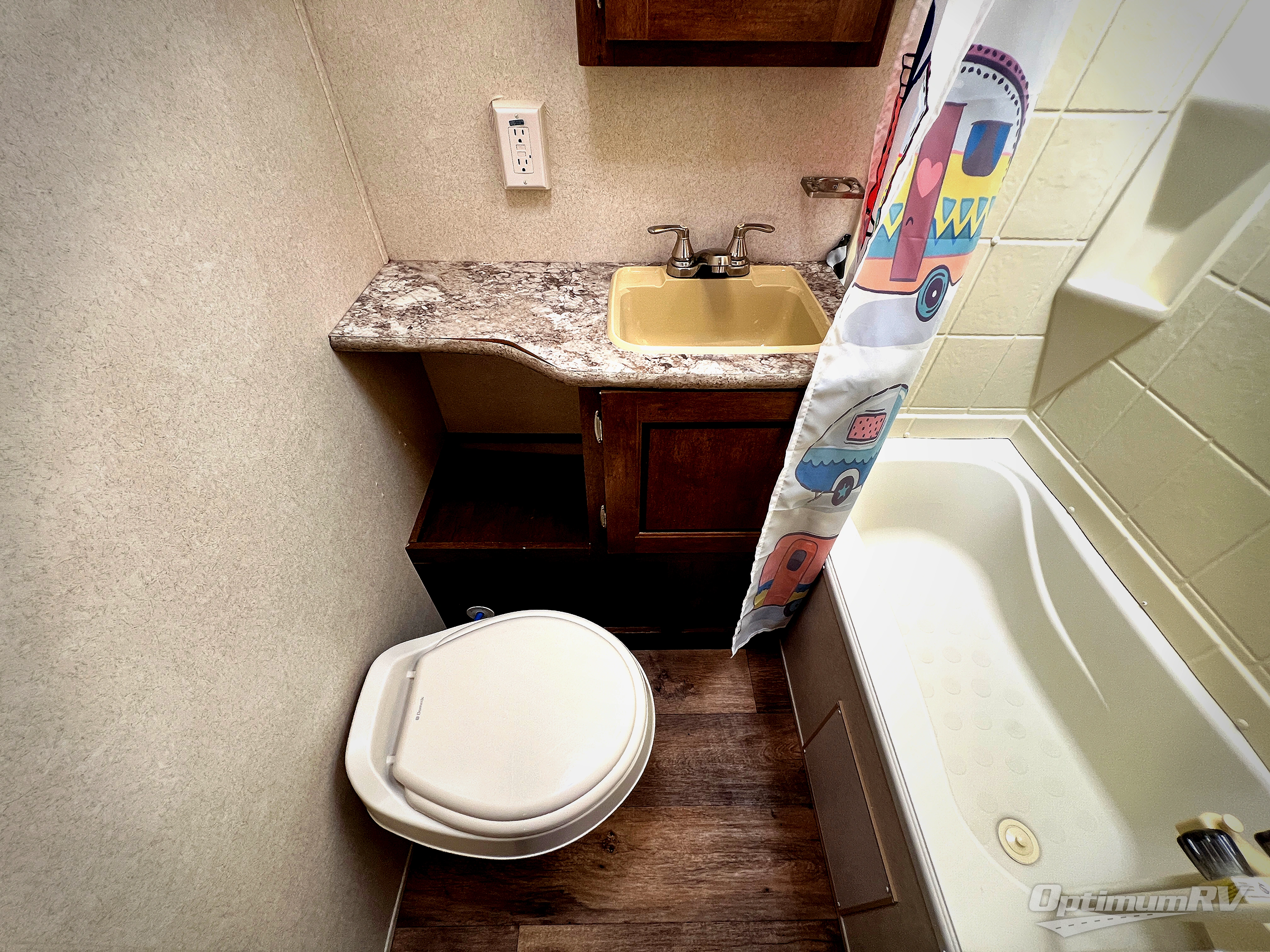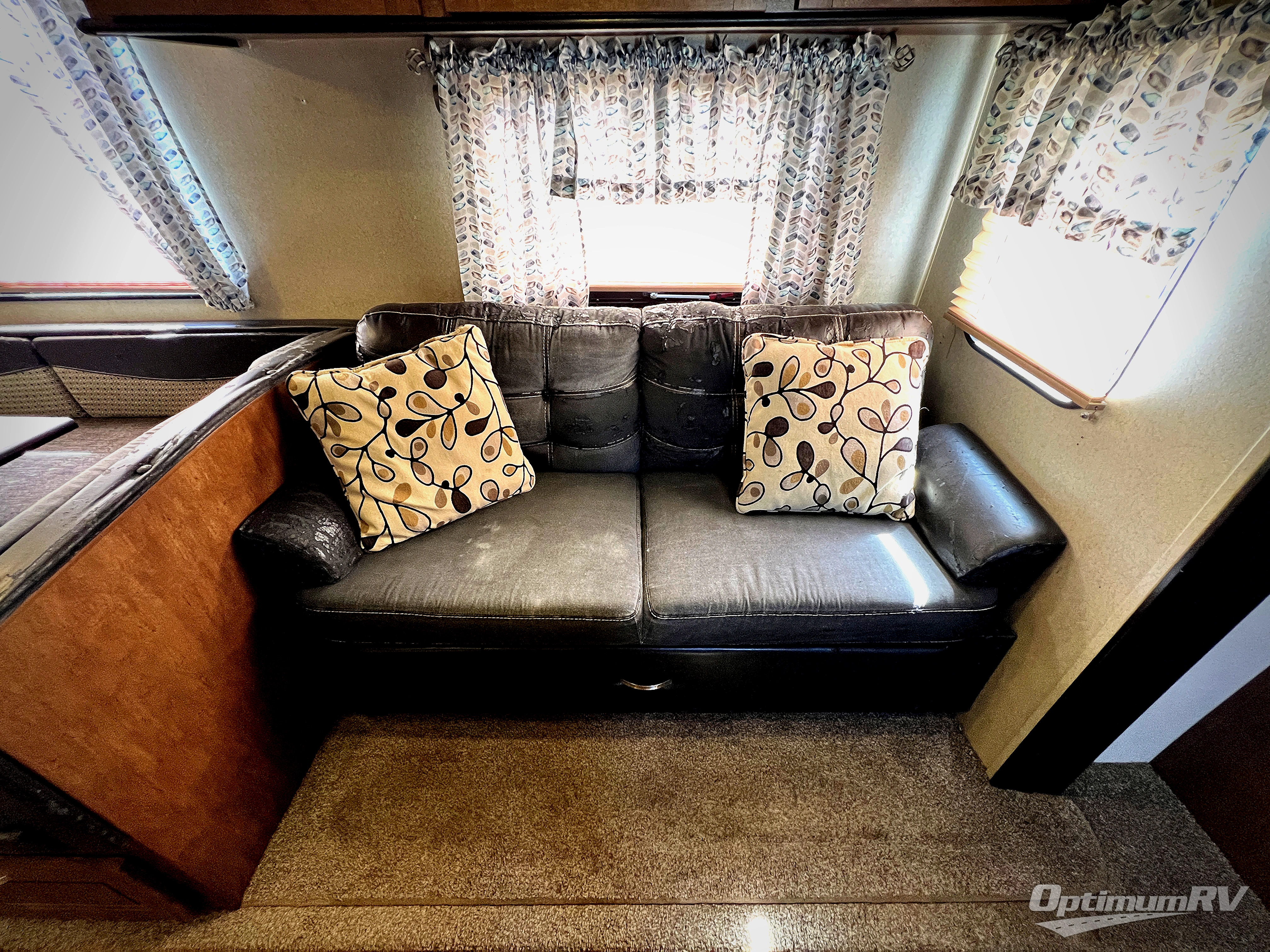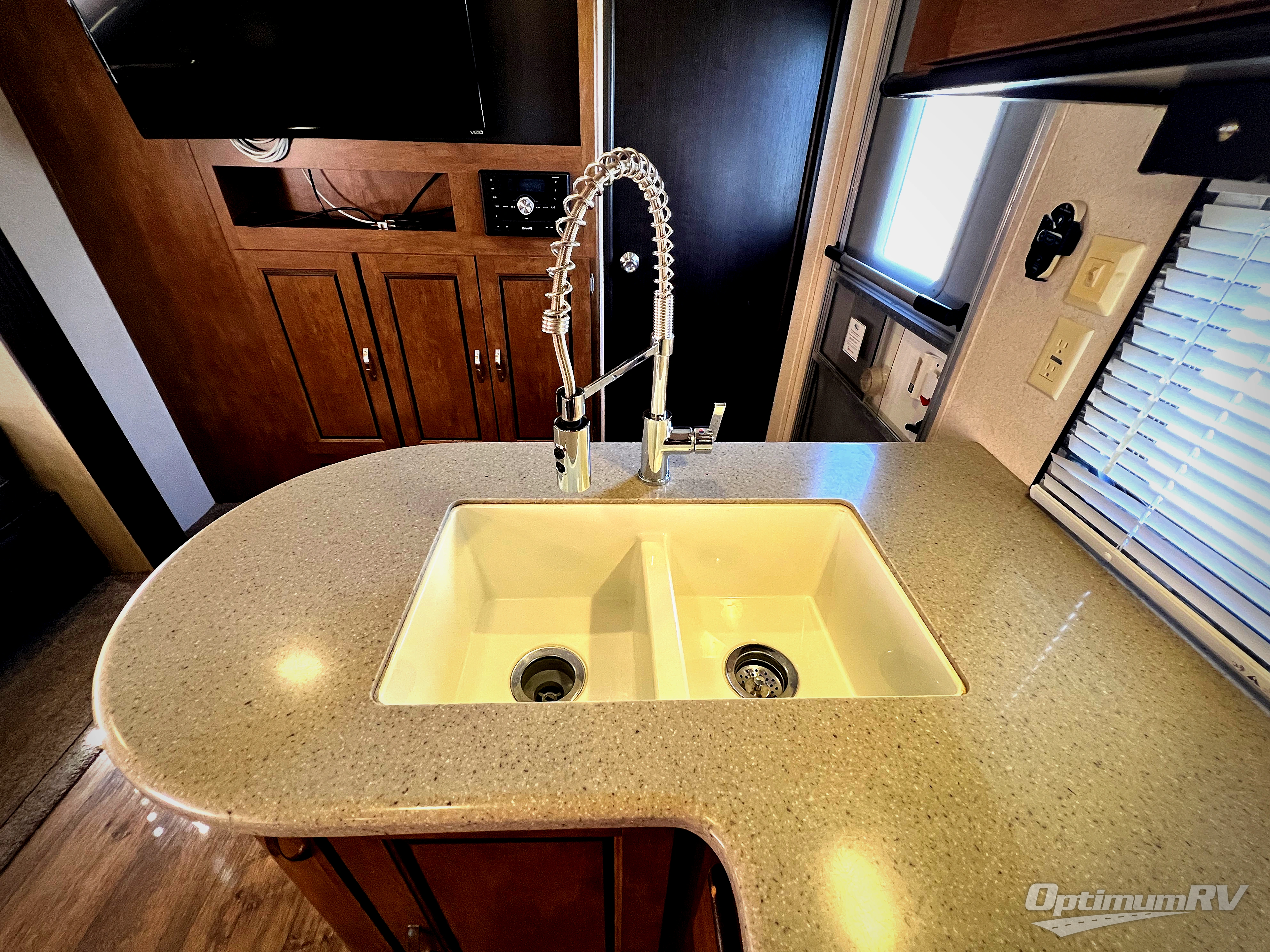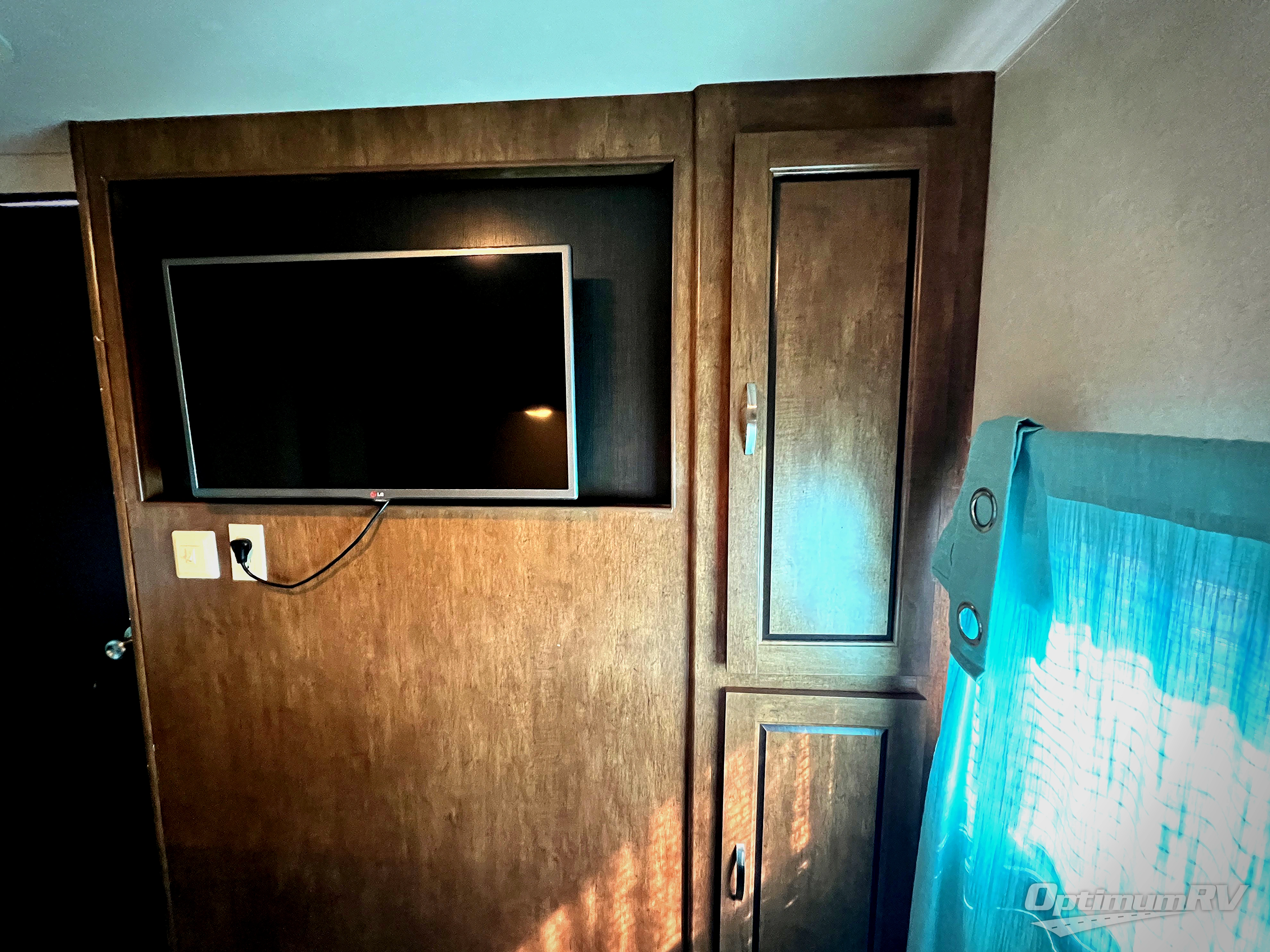 The main living area includes a road side slide out with a u-shaped dinette, and a sofa with overhead storage. Adjacent is an entertainment center for your inside enjoyment. Along the curb side wall you will find the kitchen amenities. There is a l-shaped counter with a double kitchen sink, three burner range with overhead microwave, and a refrigerator. A pantry for your non-perishables is next to the u-dinette.