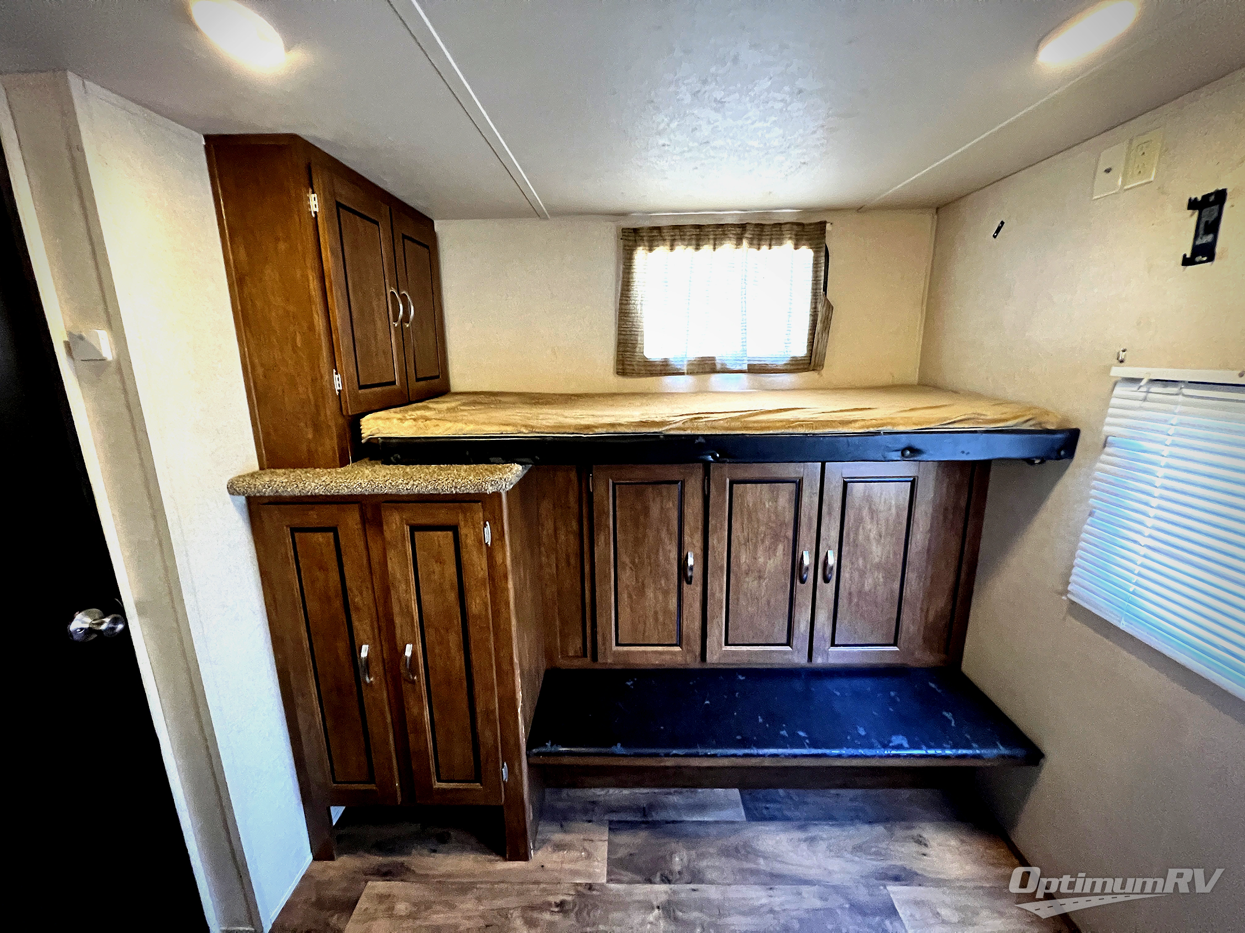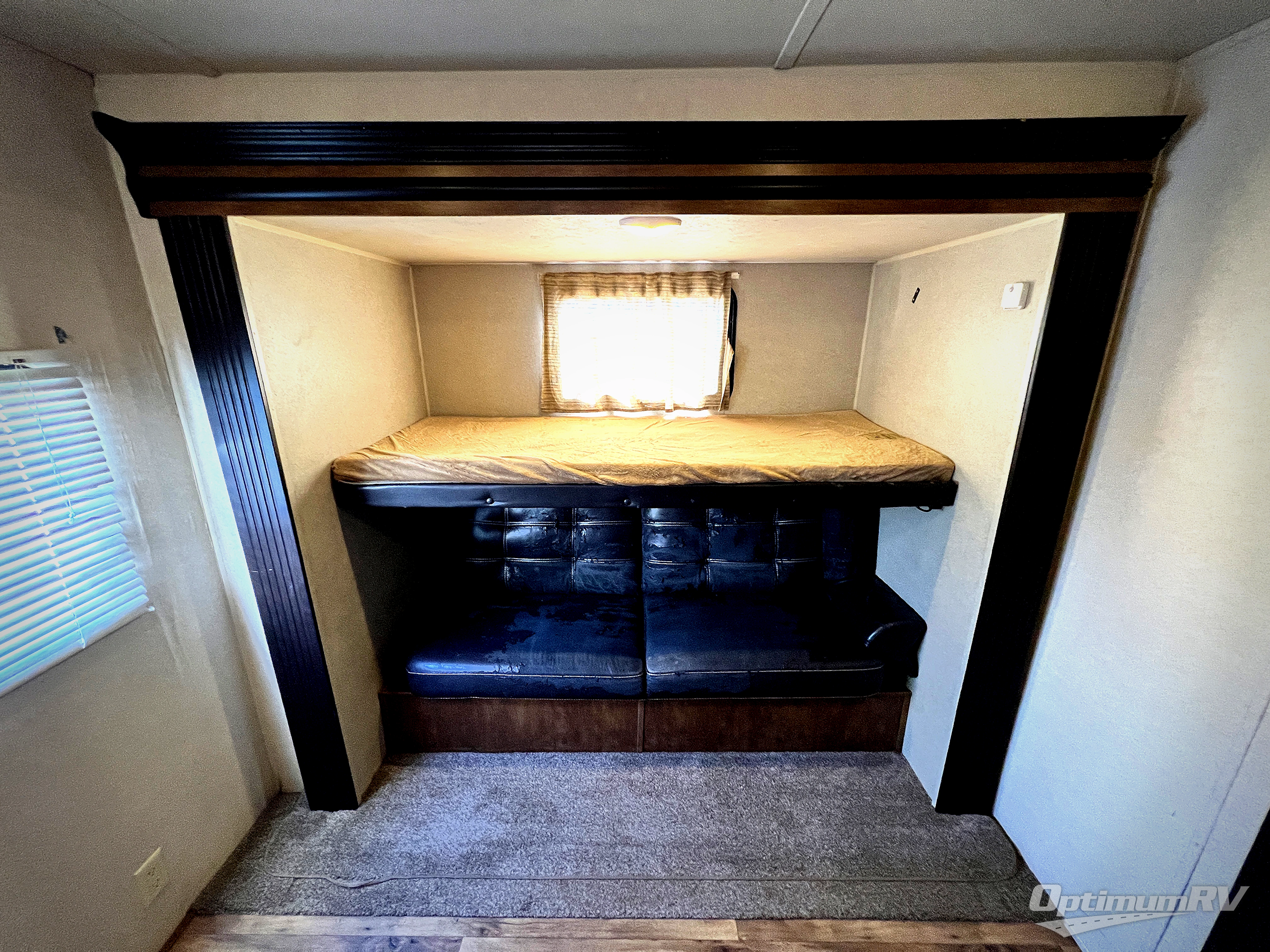 The private rear bunkhouse is where you will find the kiddos. There is a set of bunks inside the road side slide out. Along the opposite side there is a hinged bunk bed above a bench and wardrobe. Plus you will find additional storage in the side cabinet.