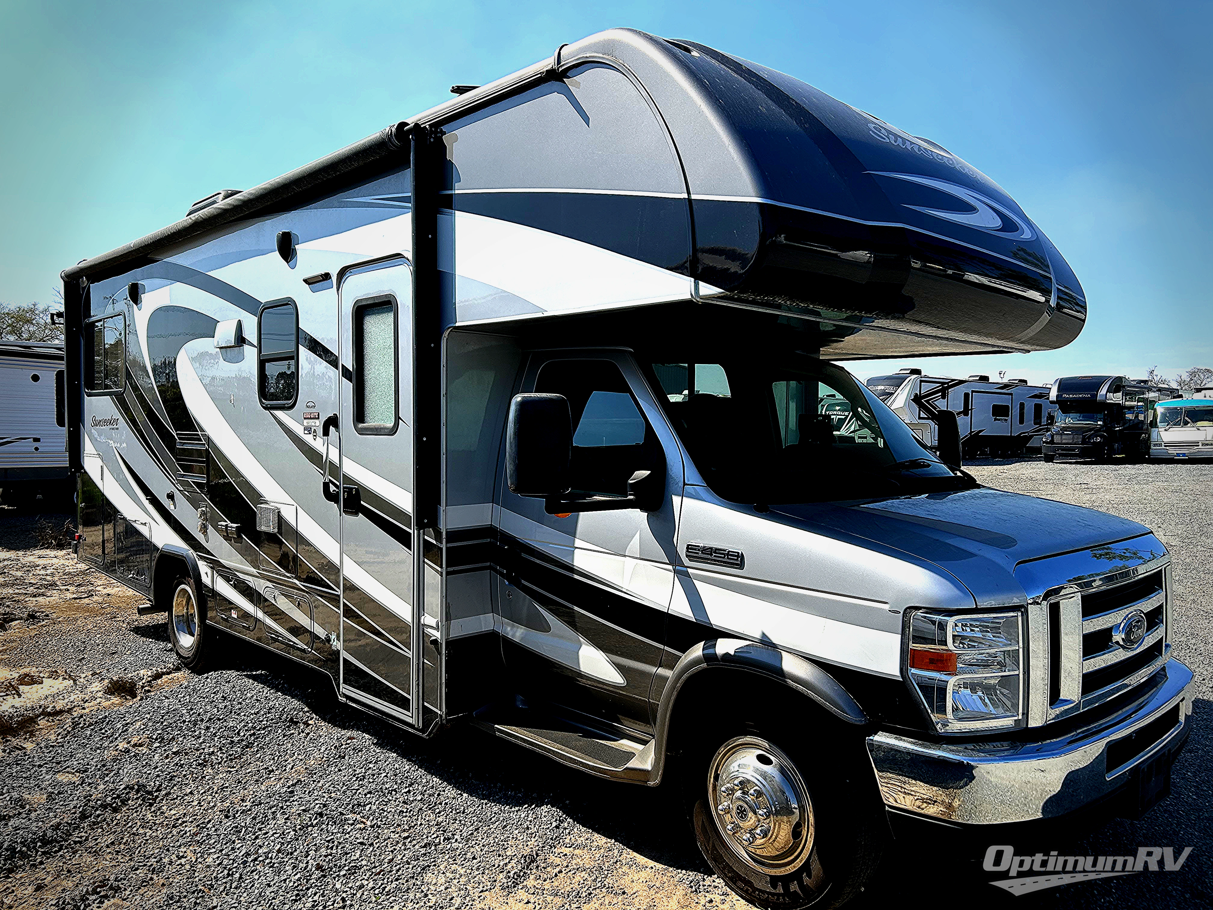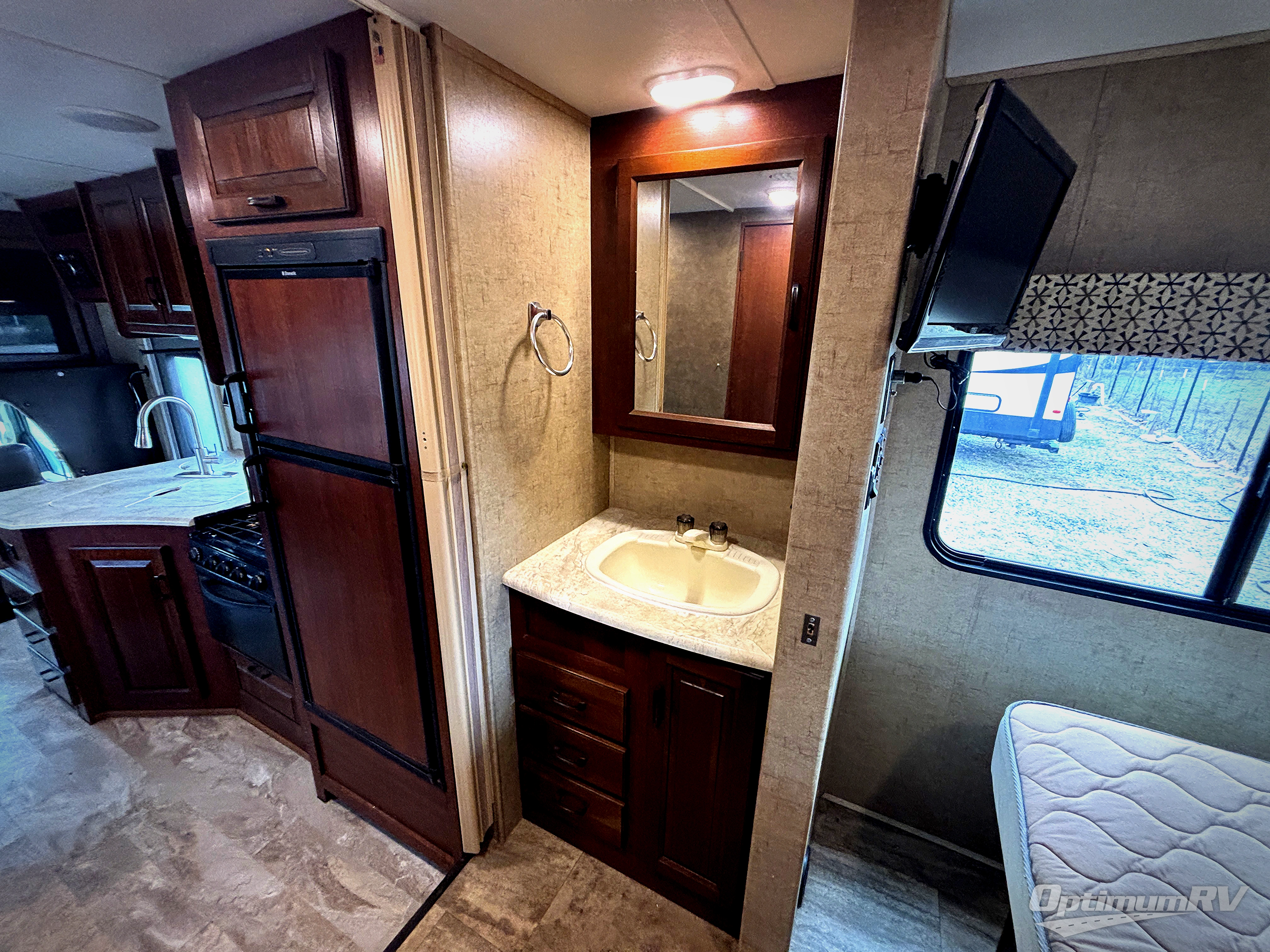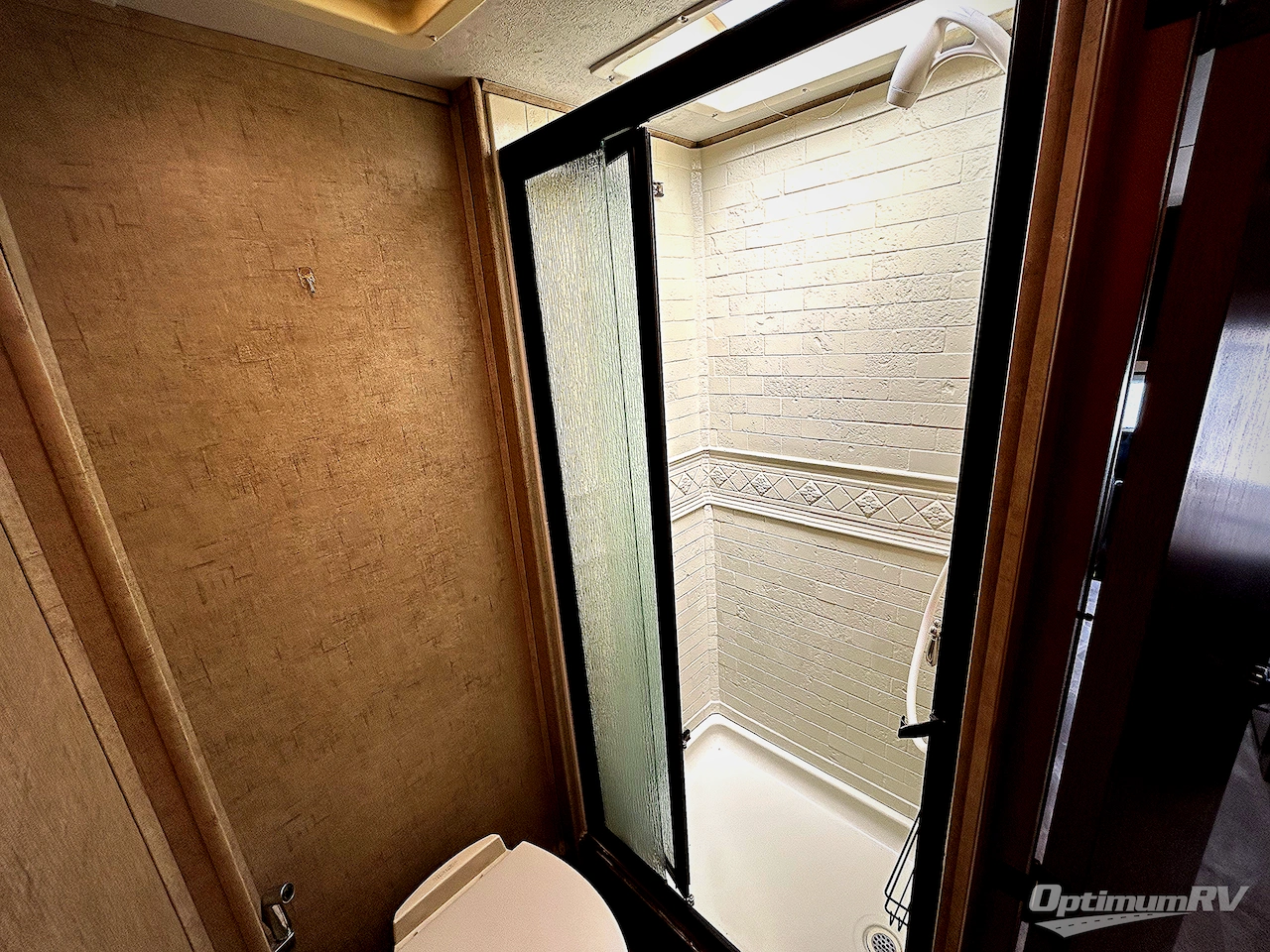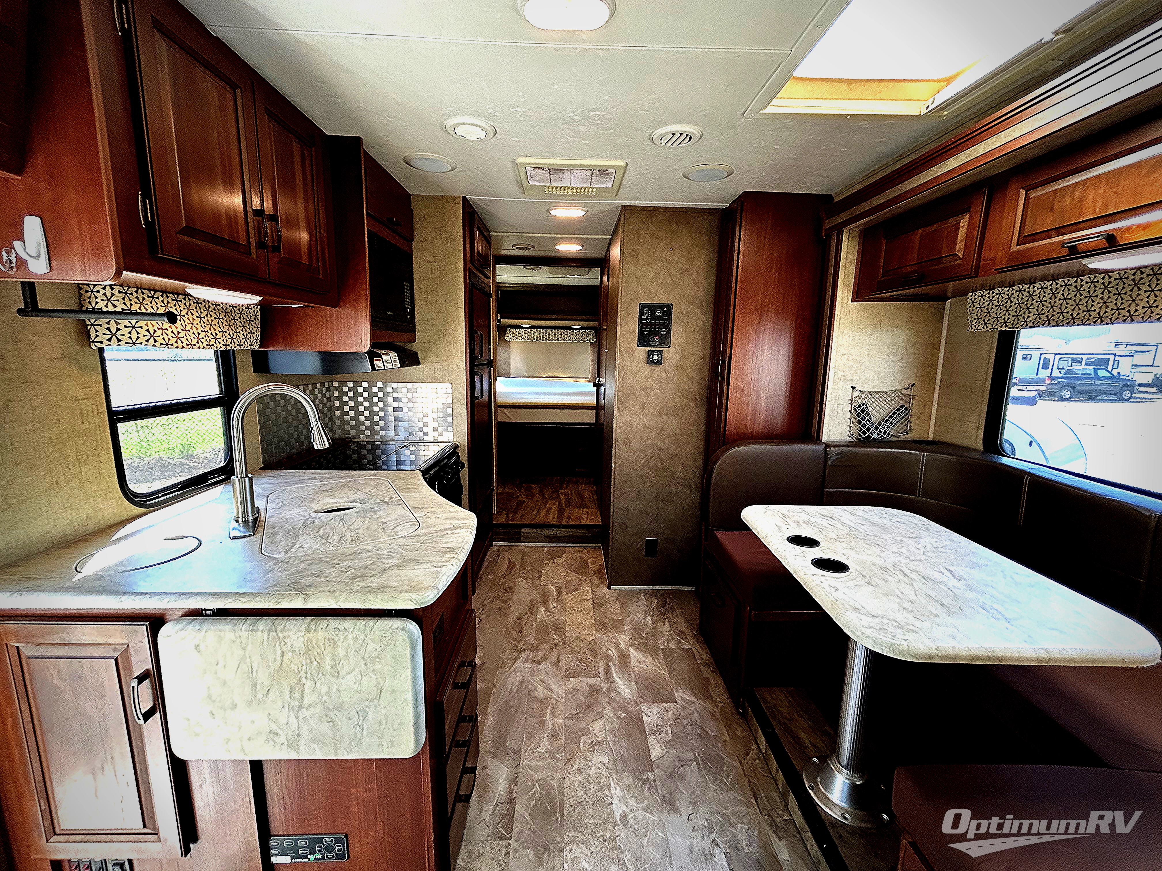 As you enter this class C motorhome, there is a 60" x 80" over the cab bunk, or you can choose optional cabinets with 42" TV or optional 32" TV with twin beds. Continuing along the driver's side, a u-shaped dinette is within a slide out. Or in place of the dinette you can choose an optional booth dinette, or a sofa with table. Next to the slide there is a pantry as well as a private toilet area with a shower. A vanity sink is located across the motorhome.