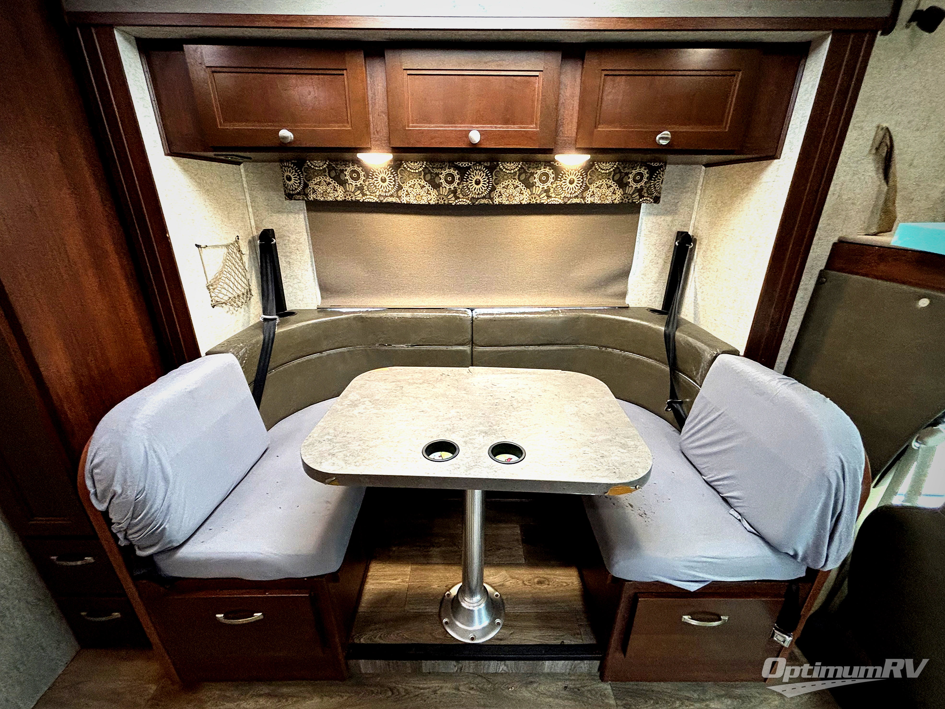 As you enter this class C motorhome, there is a 60" x 80" over the cab bunk, or you can choose optional cabinets with 42" TV or optional 32" TV with twin beds. Continuing along the driver's side, a u-shaped dinette is within a slide out. Or in place of the dinette you can choose an optional booth dinette, or a sofa with table. Next to the slide there is a pantry as well as a private toilet area with a shower. A vanity sink is located across the motorhome.