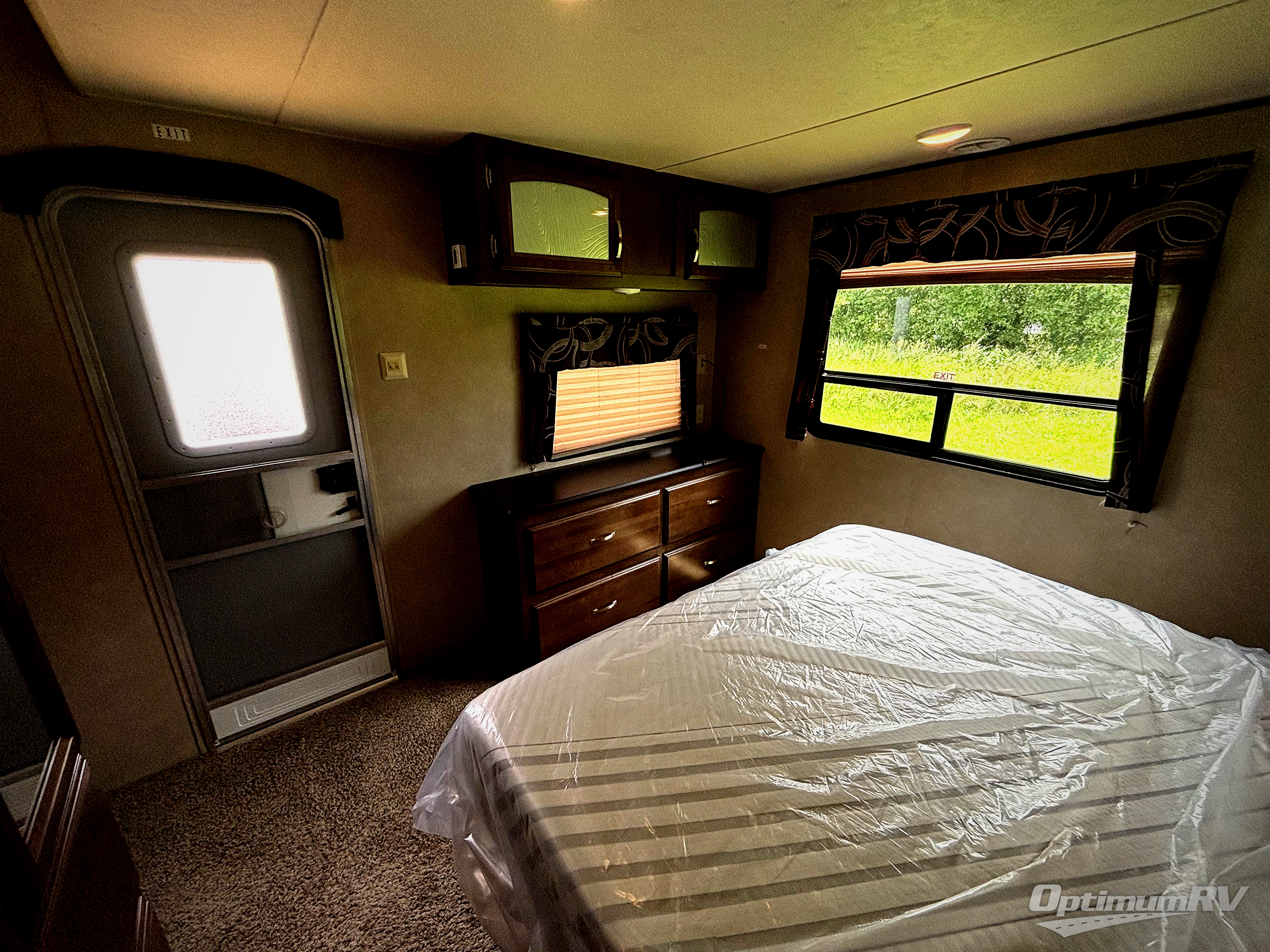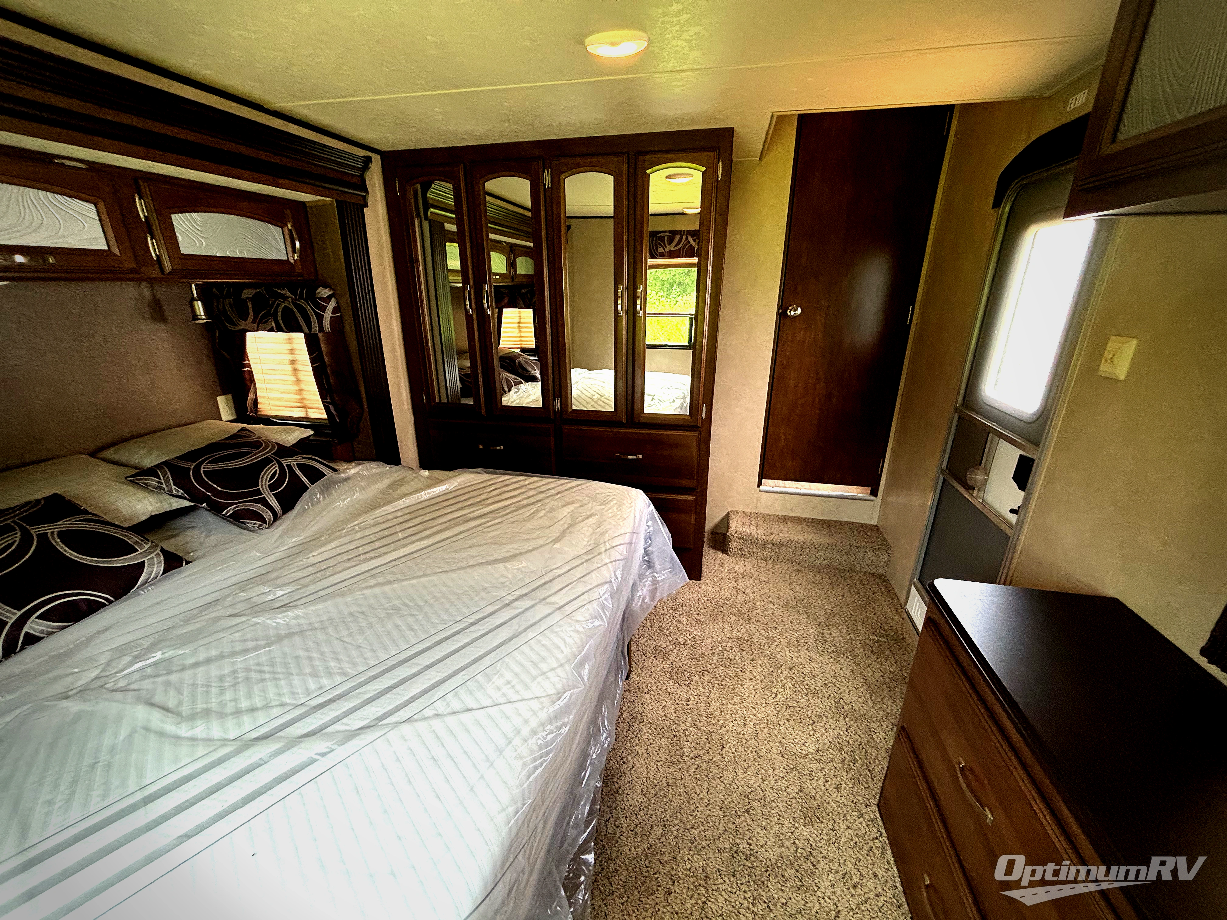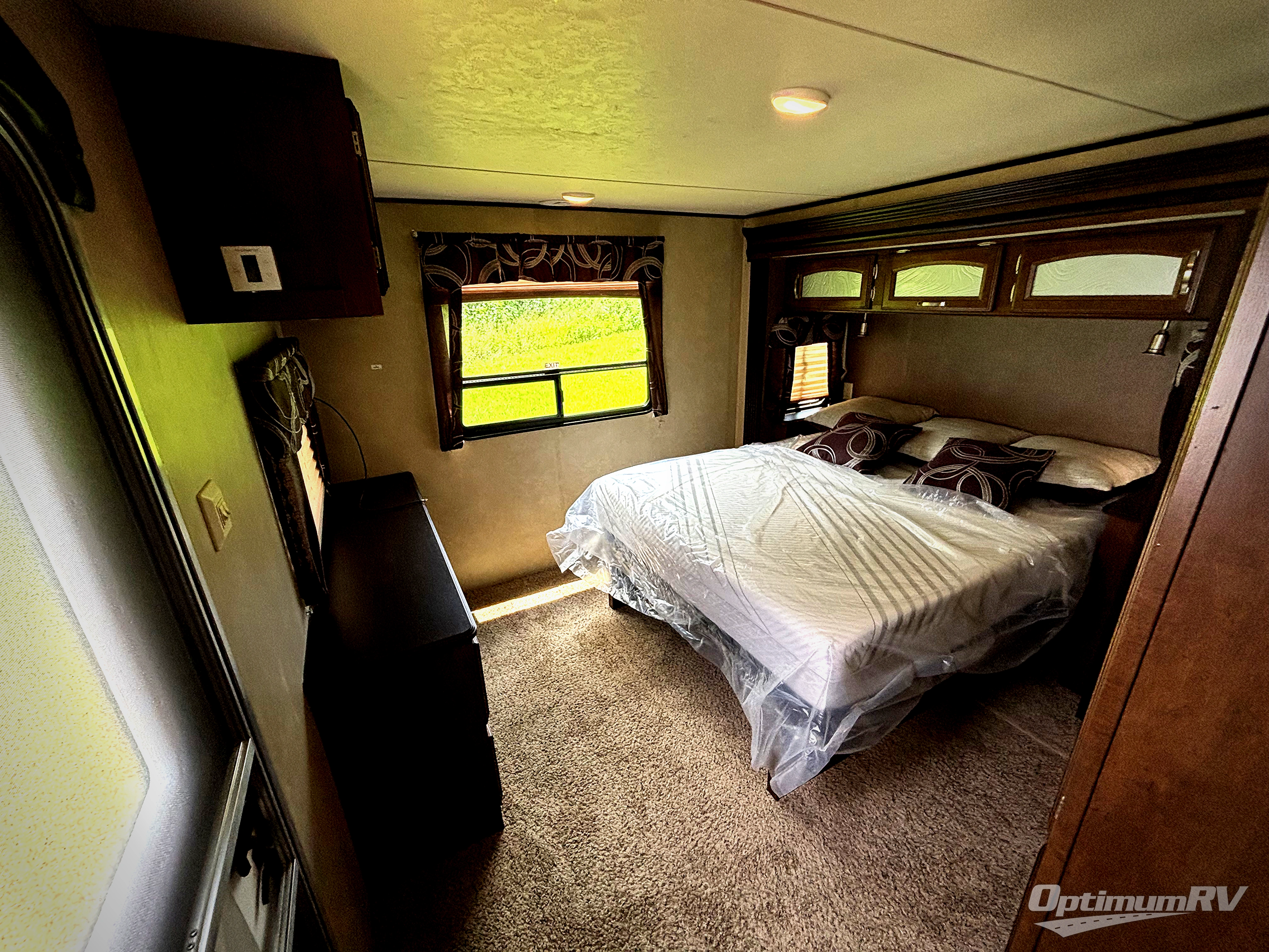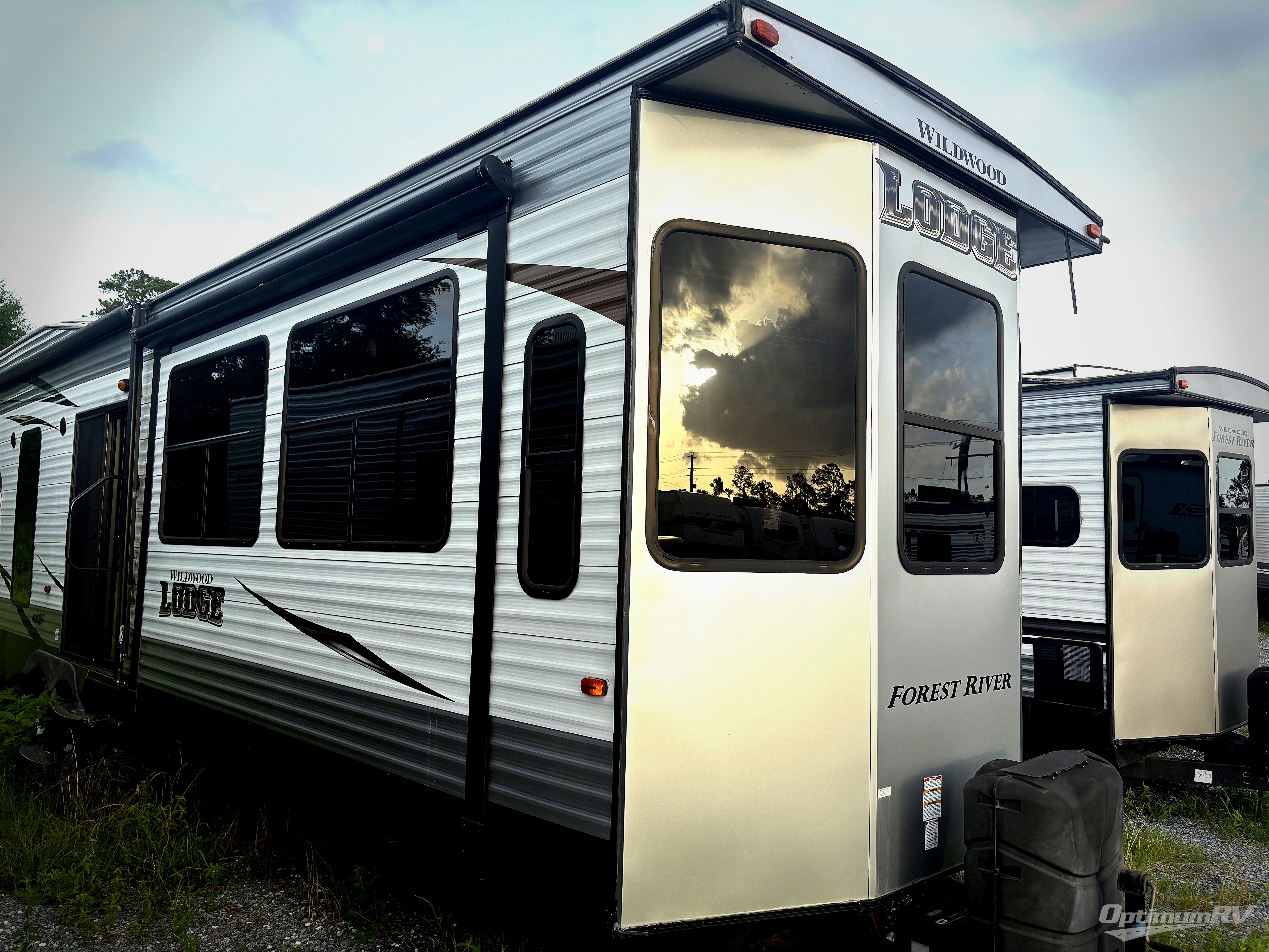 As you enter the rear entrance of the Wildwood Lodge 4092BFL destination trailer by Forest River, you will be in the rear bedroom. Along one wall there is a dresser, the opposite side of the trailer has a slide out with a queen bed. There is also a wardrobe and an optional washer/dryer along the interior wall.