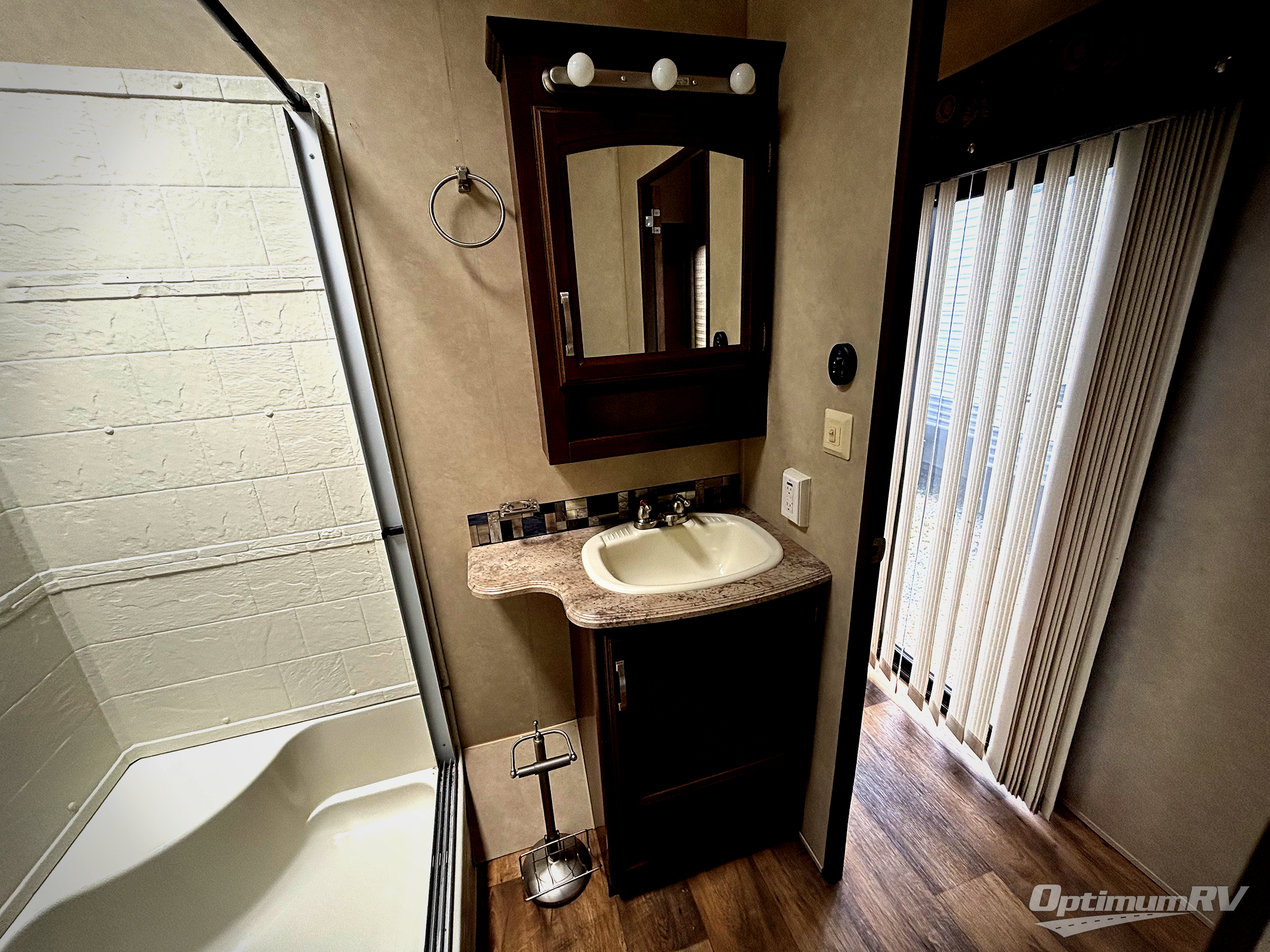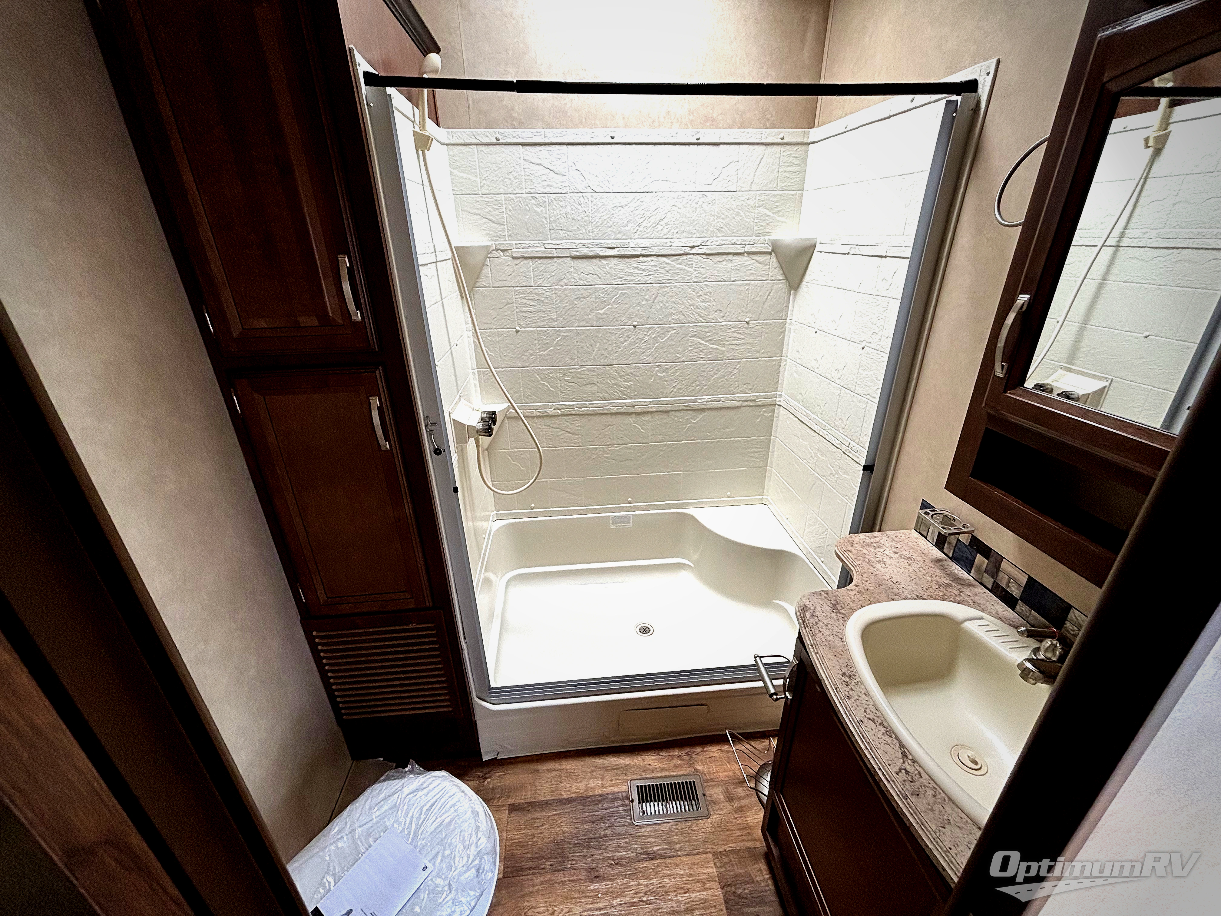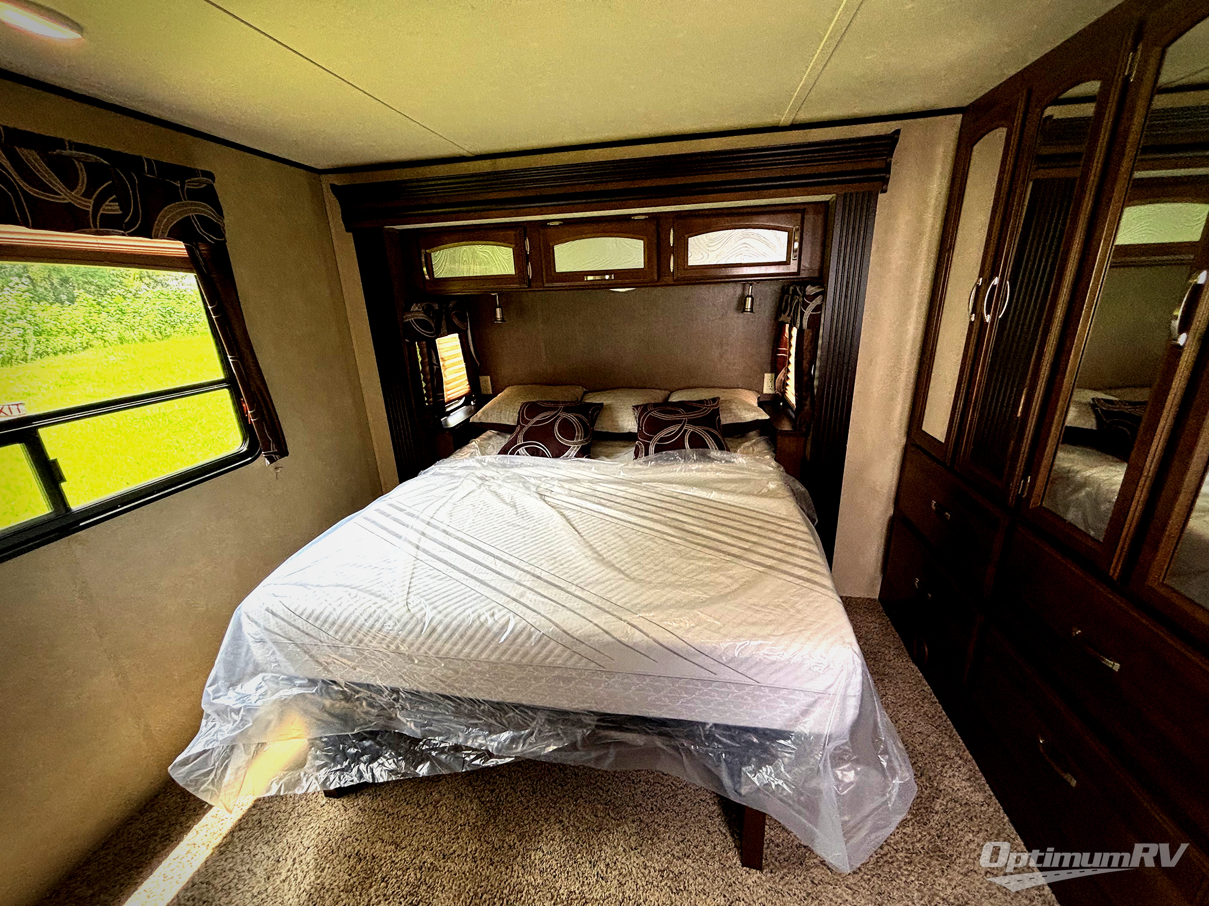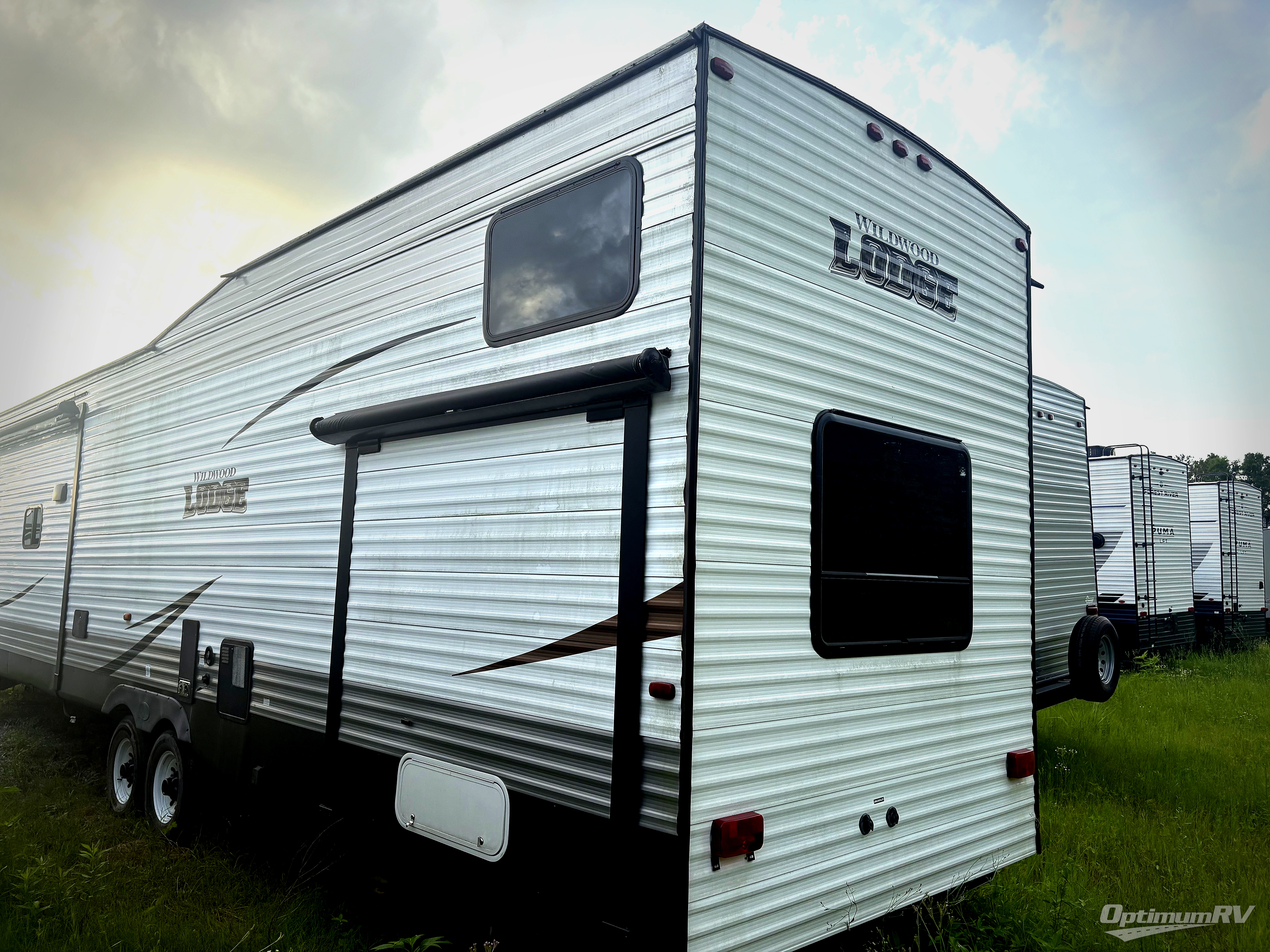 As you enter the rear entrance of the Wildwood Lodge 4092BFL destination trailer by Forest River, you will be in the rear bedroom. Along one wall there is a dresser, the opposite side of the trailer has a slide out with a queen bed. There is also a wardrobe and an optional washer/dryer along the interior wall.