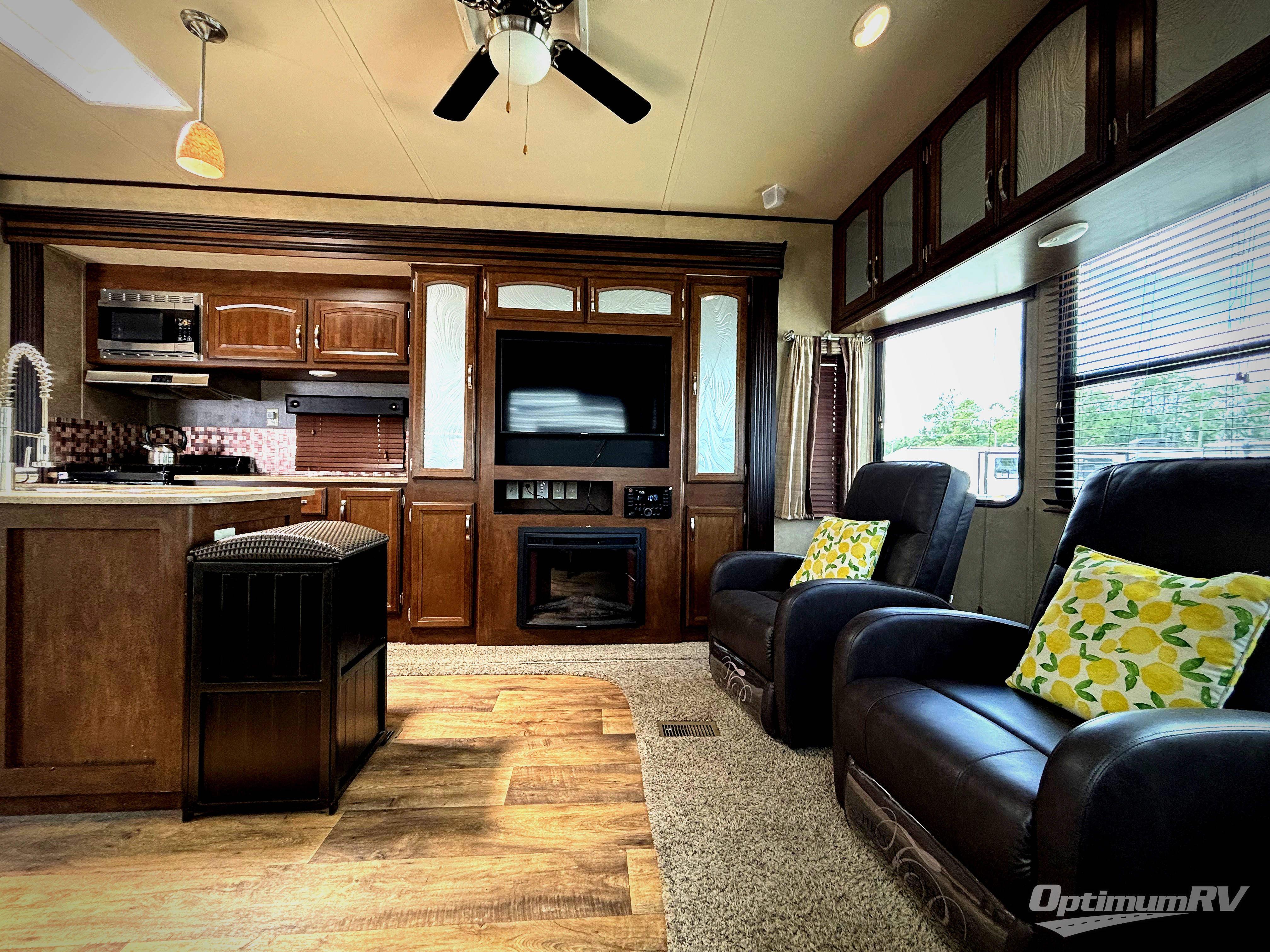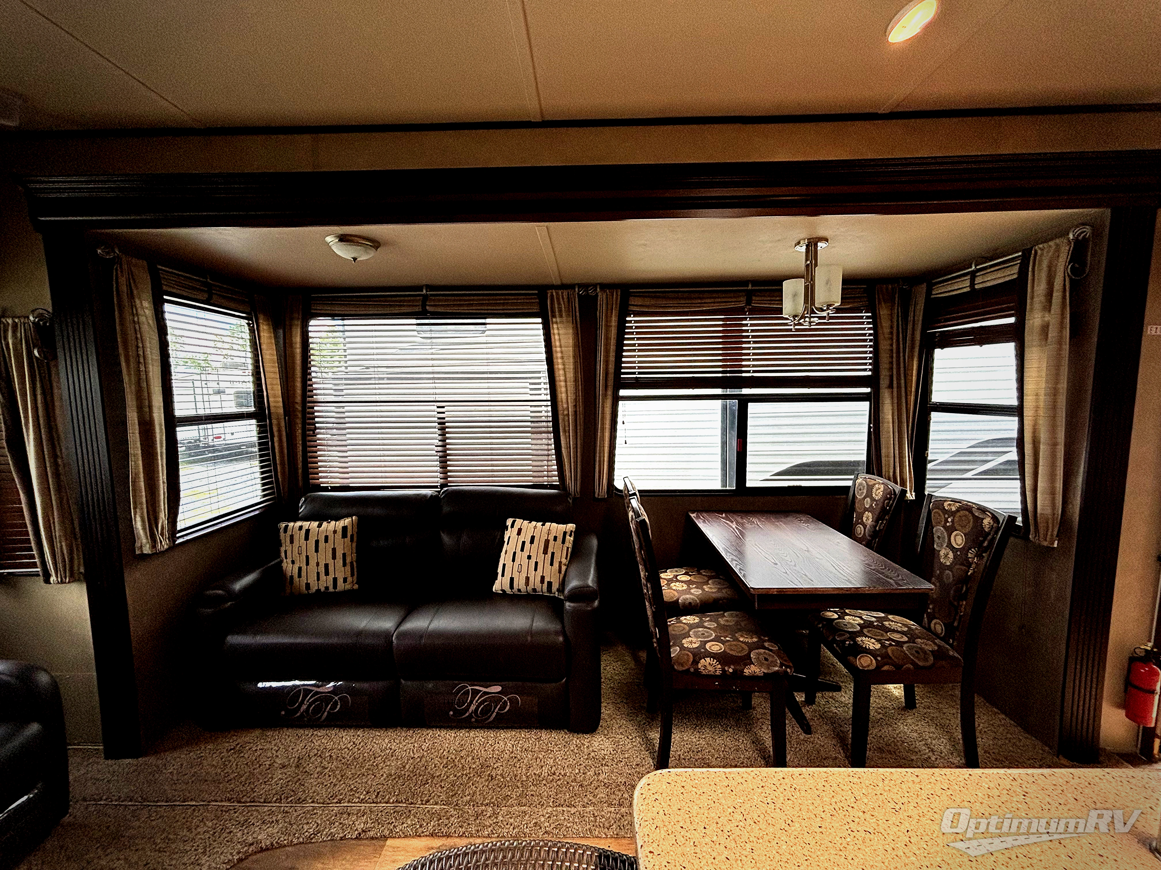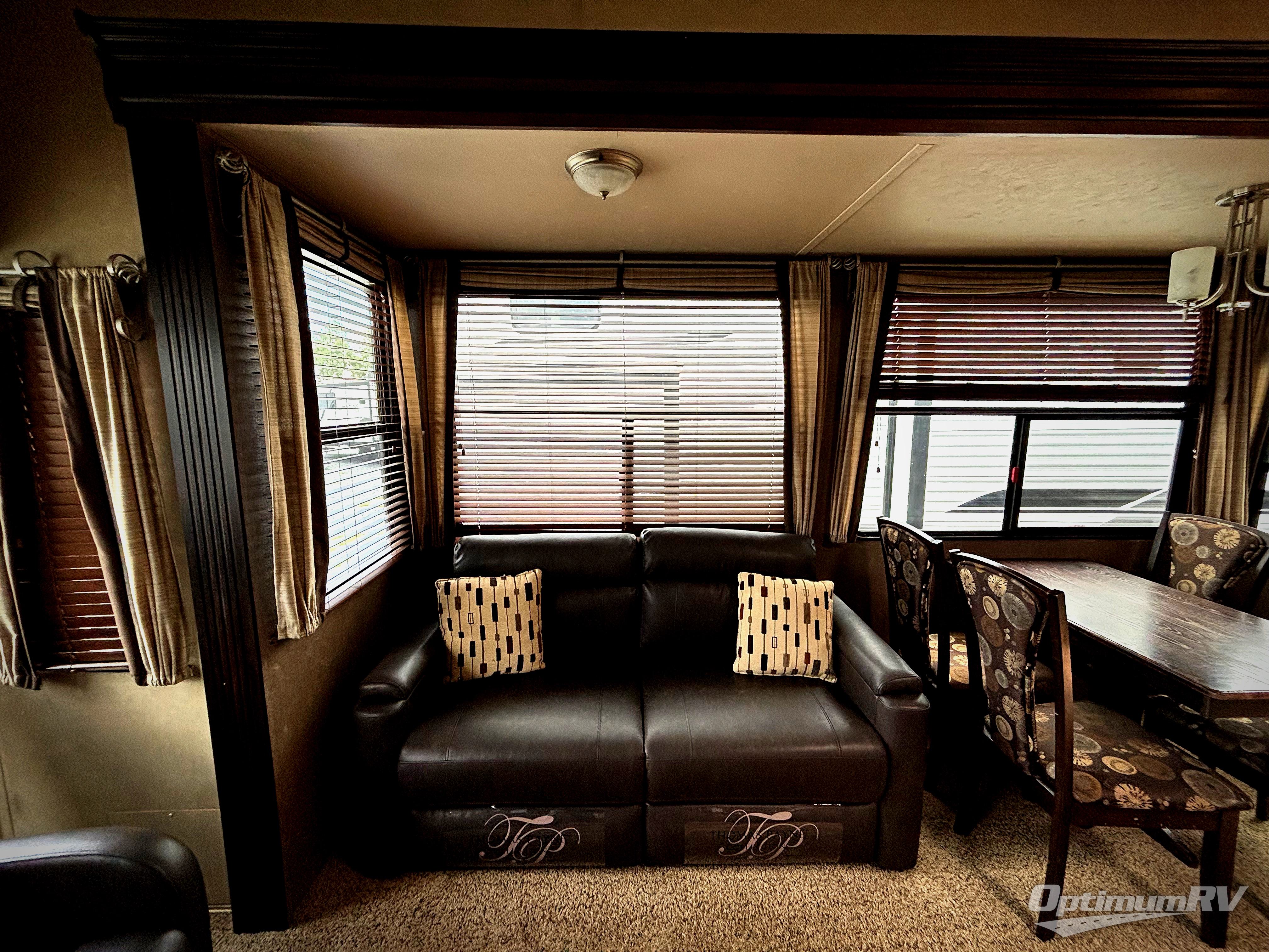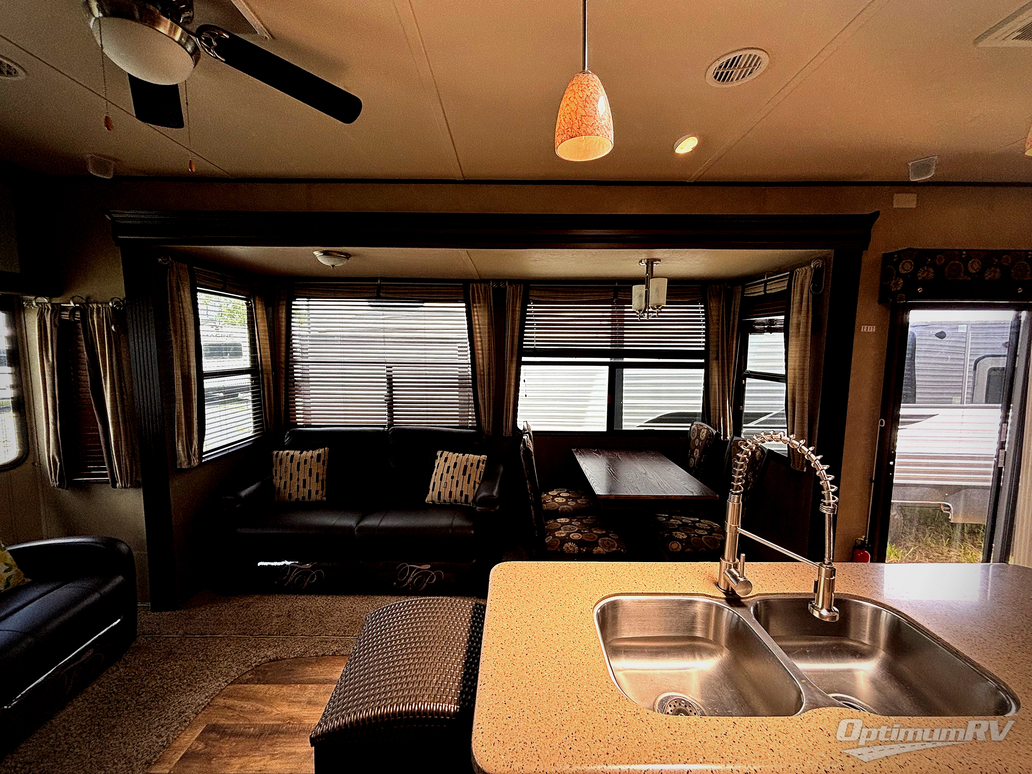 The kitchen and main living area have a refrigerator and pantry along the interior wall. The slide out along the road side offers a four burner range, microwave, and entertainment center. The slide out opposite has a free-standing table and a sofa. Along the front wall there are two lounge chairs. In the middle of the kitchen you will find a kitchen island with a double kitchen sink, plus more!