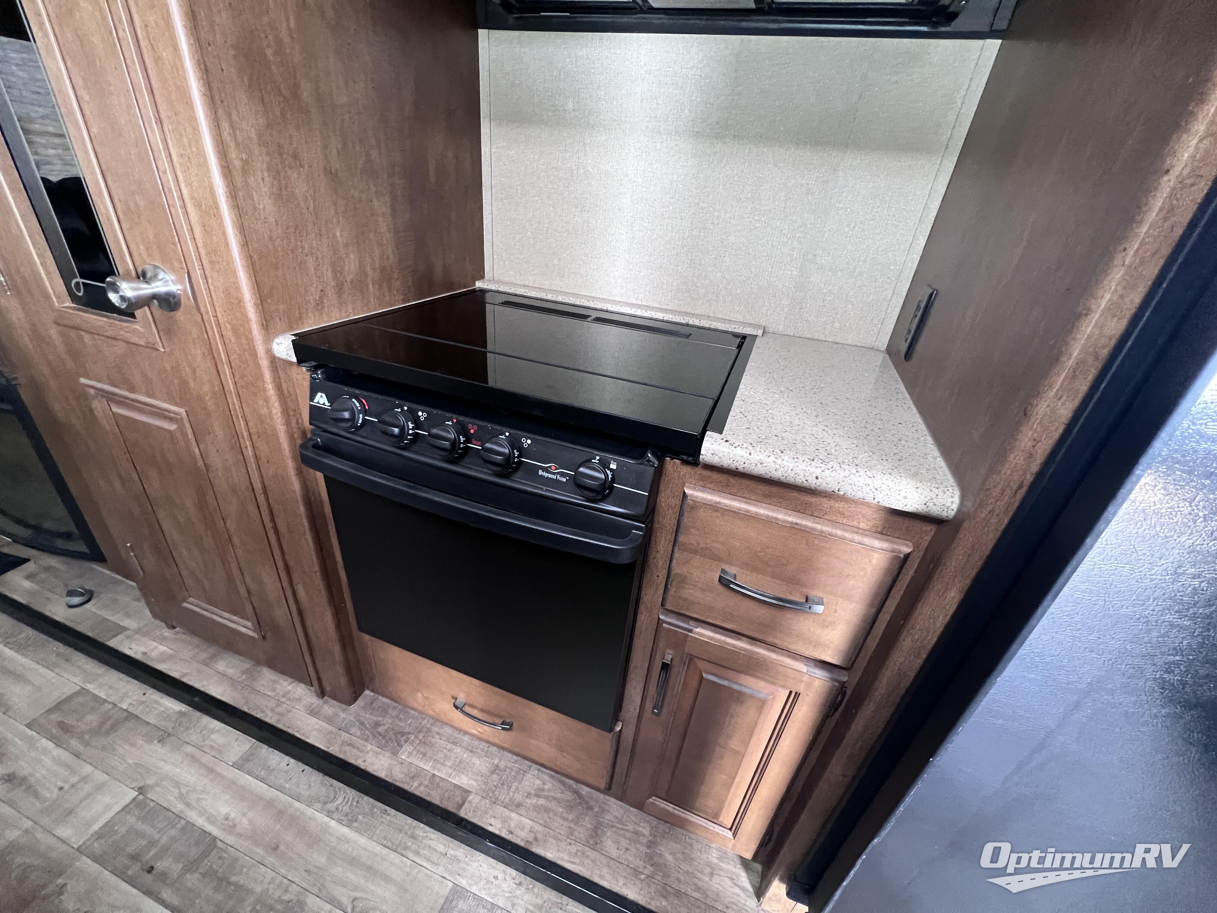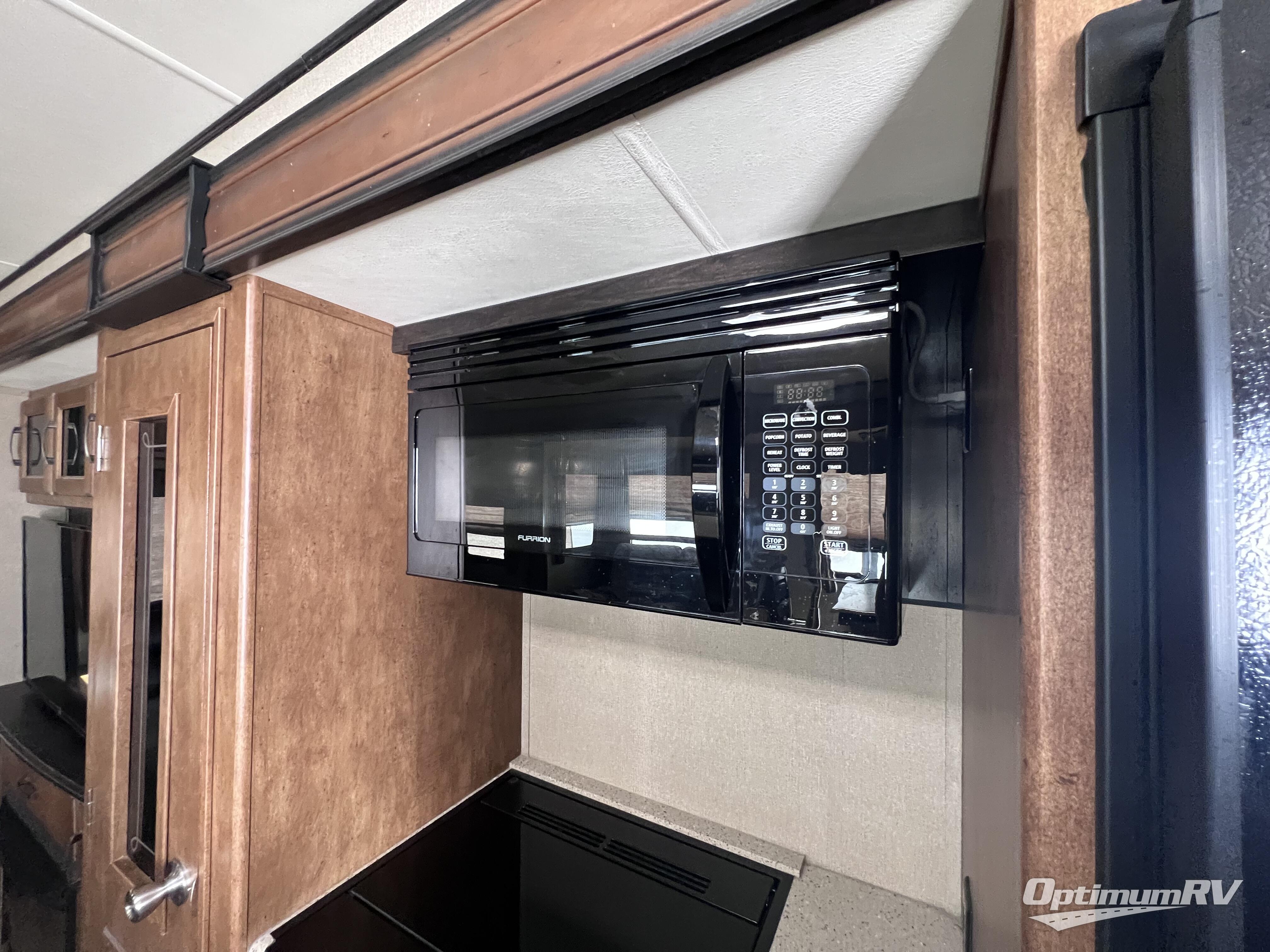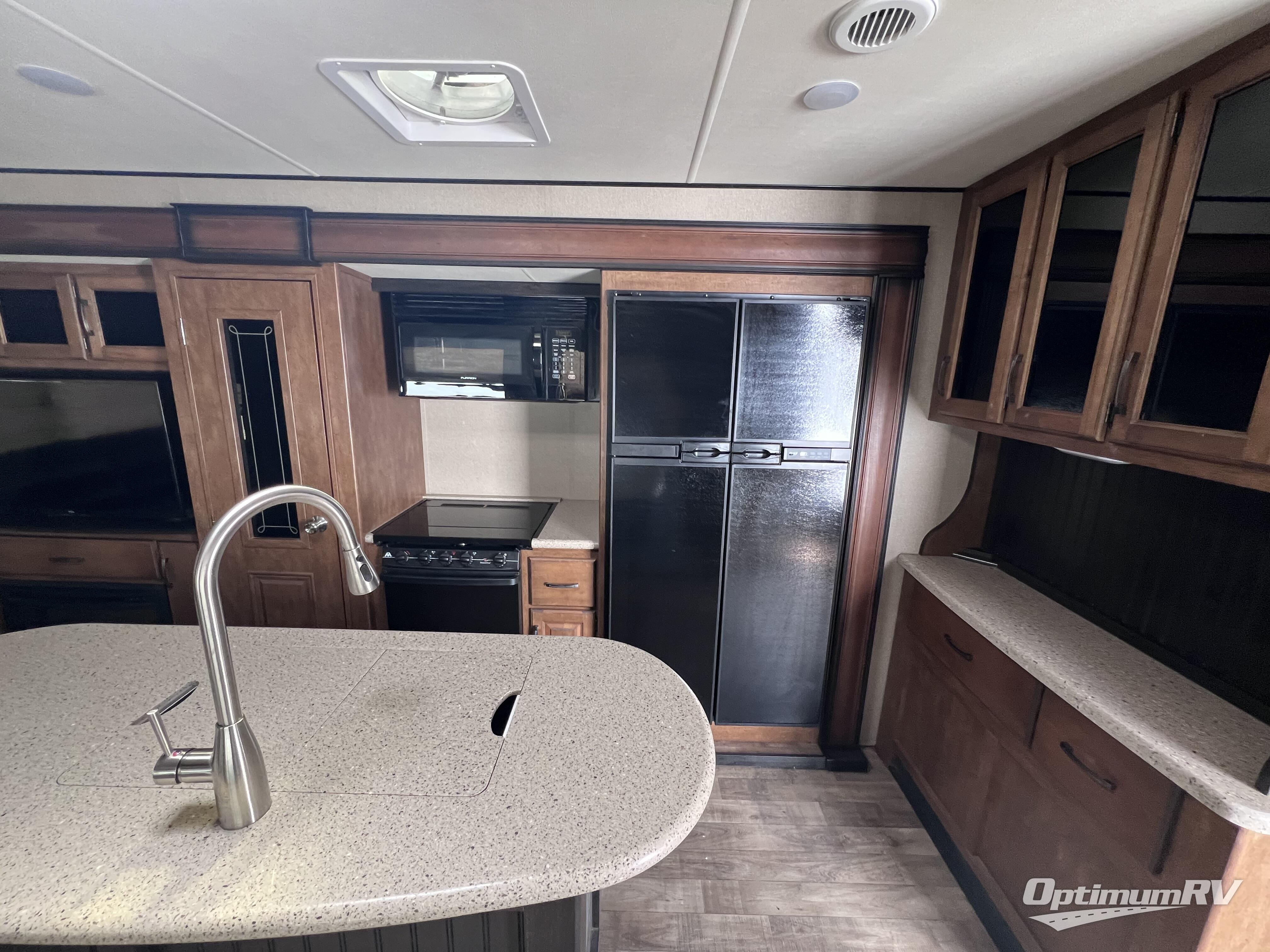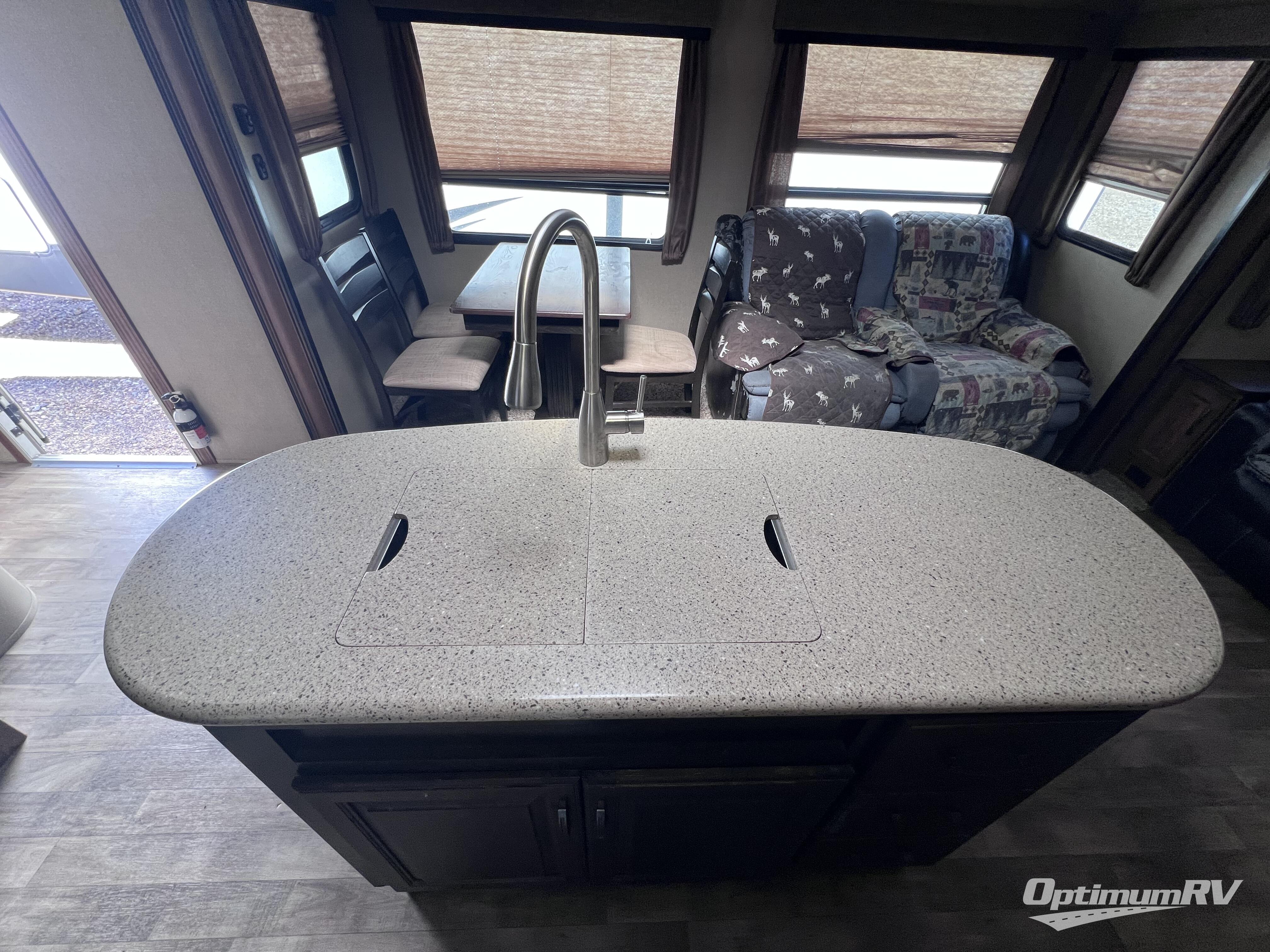 As you enter you will find a combined kitchen and living room with dual opposing slides. The slide to your left features a dinette (with free standing table and chairs option shown), and theater seats for two including cup holders. Along the rear wall adjacent to the theater seats you will find a tri-fold sofa with storage overhead for plenty of seating and added sleeping space for overnight guests. A nearby entertainment center with a 40" TV and fireplace are found in the slide along the road side that also contains the kitchen appliances.