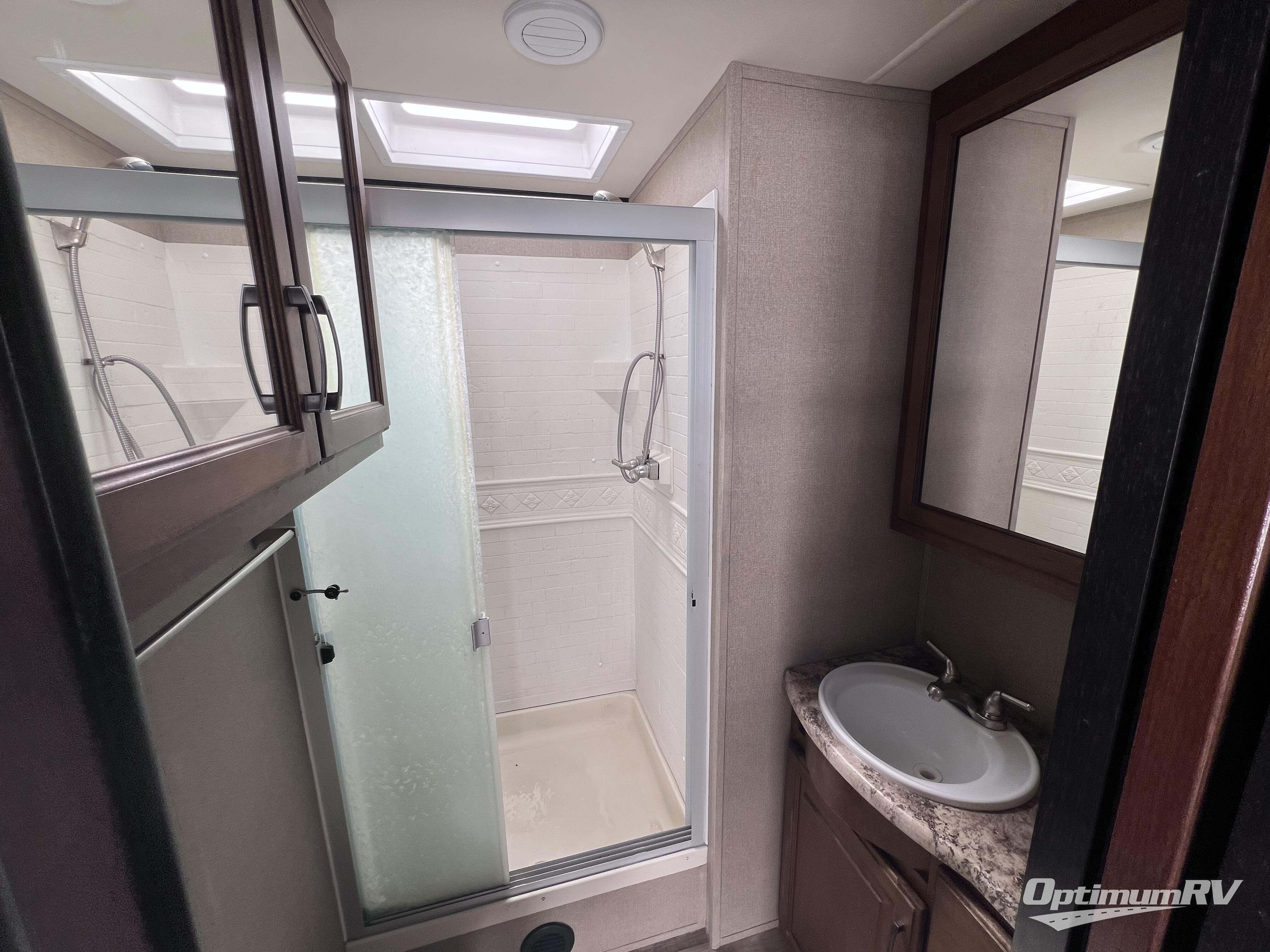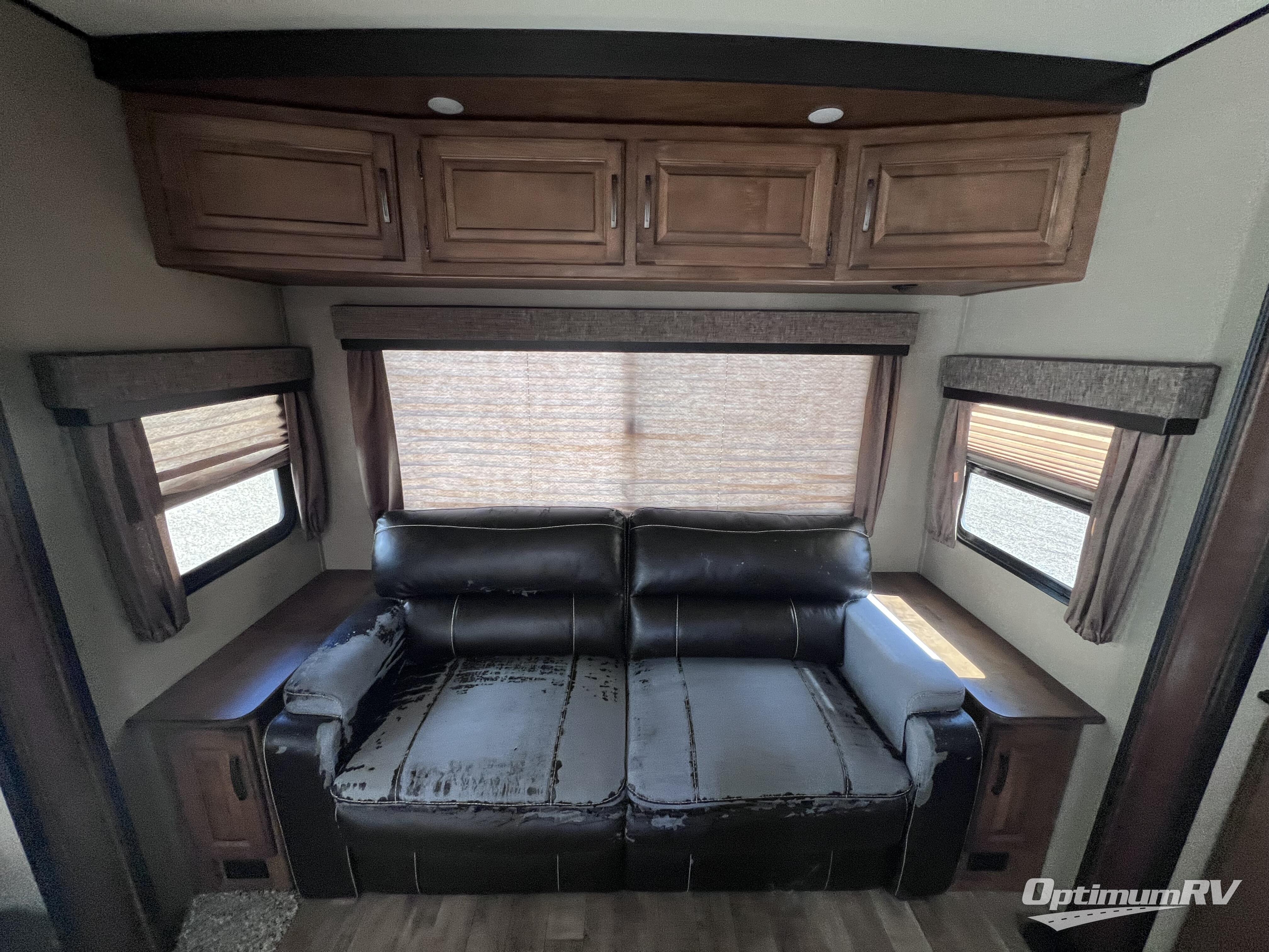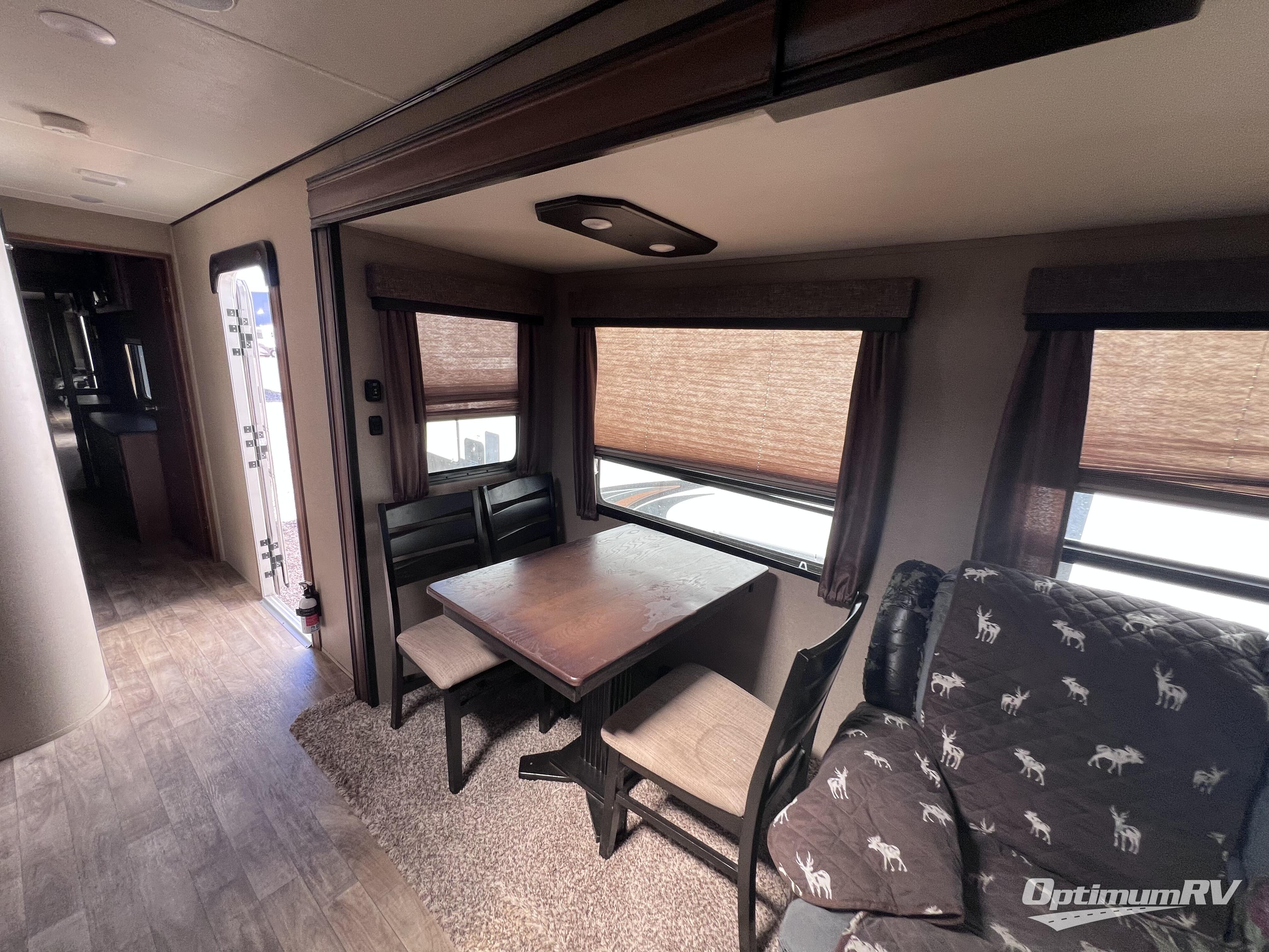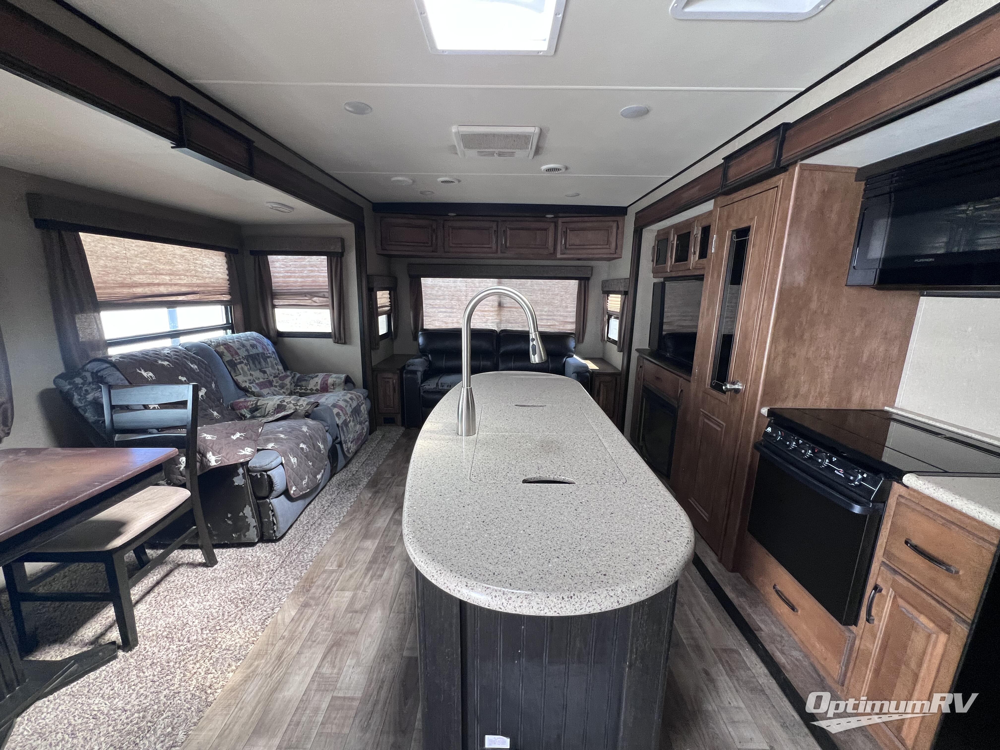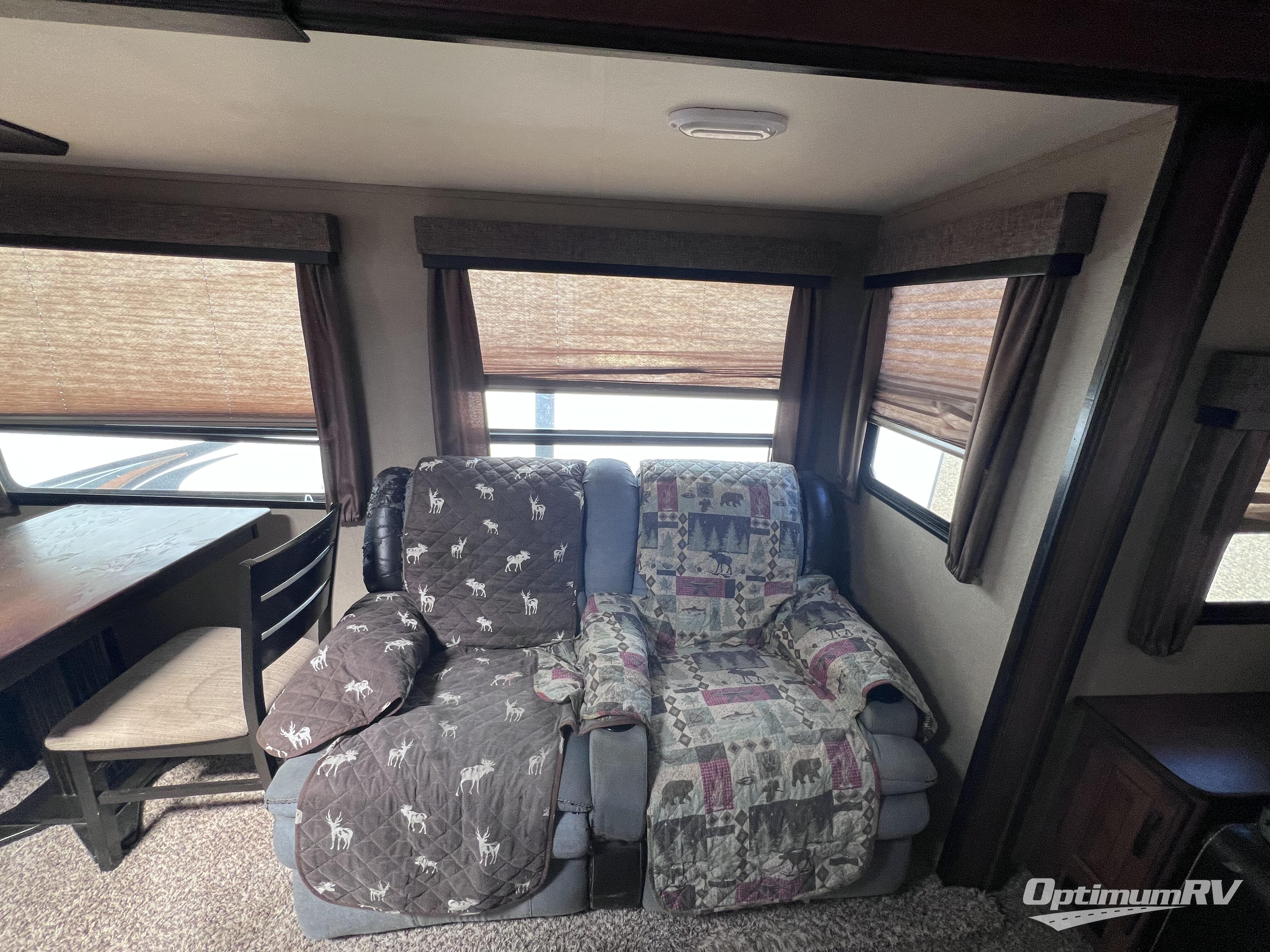 As you enter you will find a combined kitchen and living room with dual opposing slides. The slide to your left features a dinette (with free standing table and chairs option shown), and theater seats for two including cup holders. Along the rear wall adjacent to the theater seats you will find a tri-fold sofa with storage overhead for plenty of seating and added sleeping space for overnight guests. A nearby entertainment center with a 40" TV and fireplace are found in the slide along the road side that also contains the kitchen appliances.