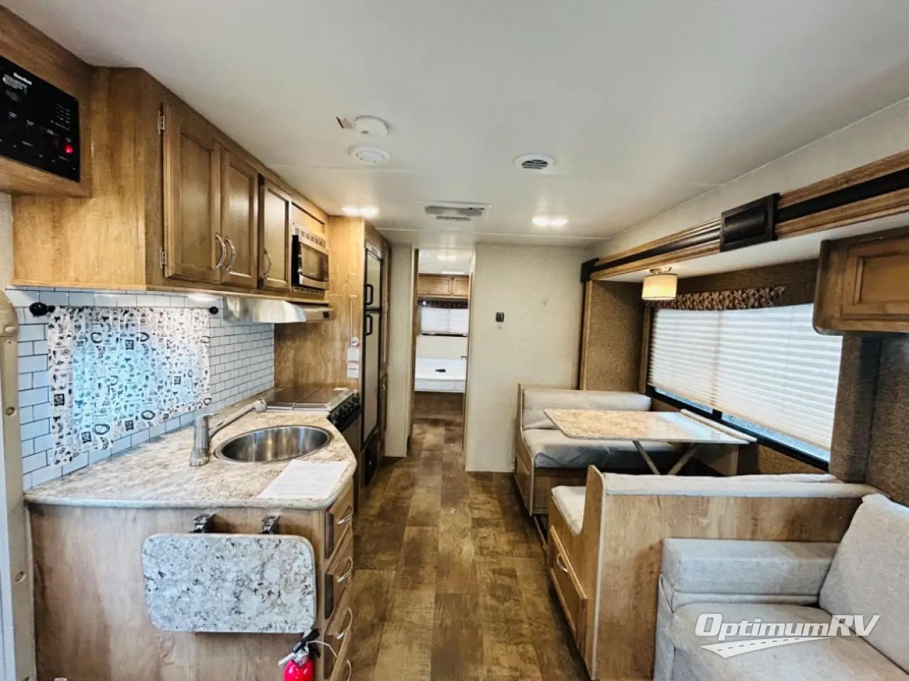 As you enter to your right there is a lounge chair with overhead storage, a bunk above the cab with optional storage, and an optional TV with a swing arm. Straight inside the door there is a jackknife sofa and booth dinette slide allowing more floor space in the living and kitchen combined area. Along the curb side is an angled countertop with a double kitchen sink, three burner range, microwave, refrigerator, and a pantry for your dry goods.
