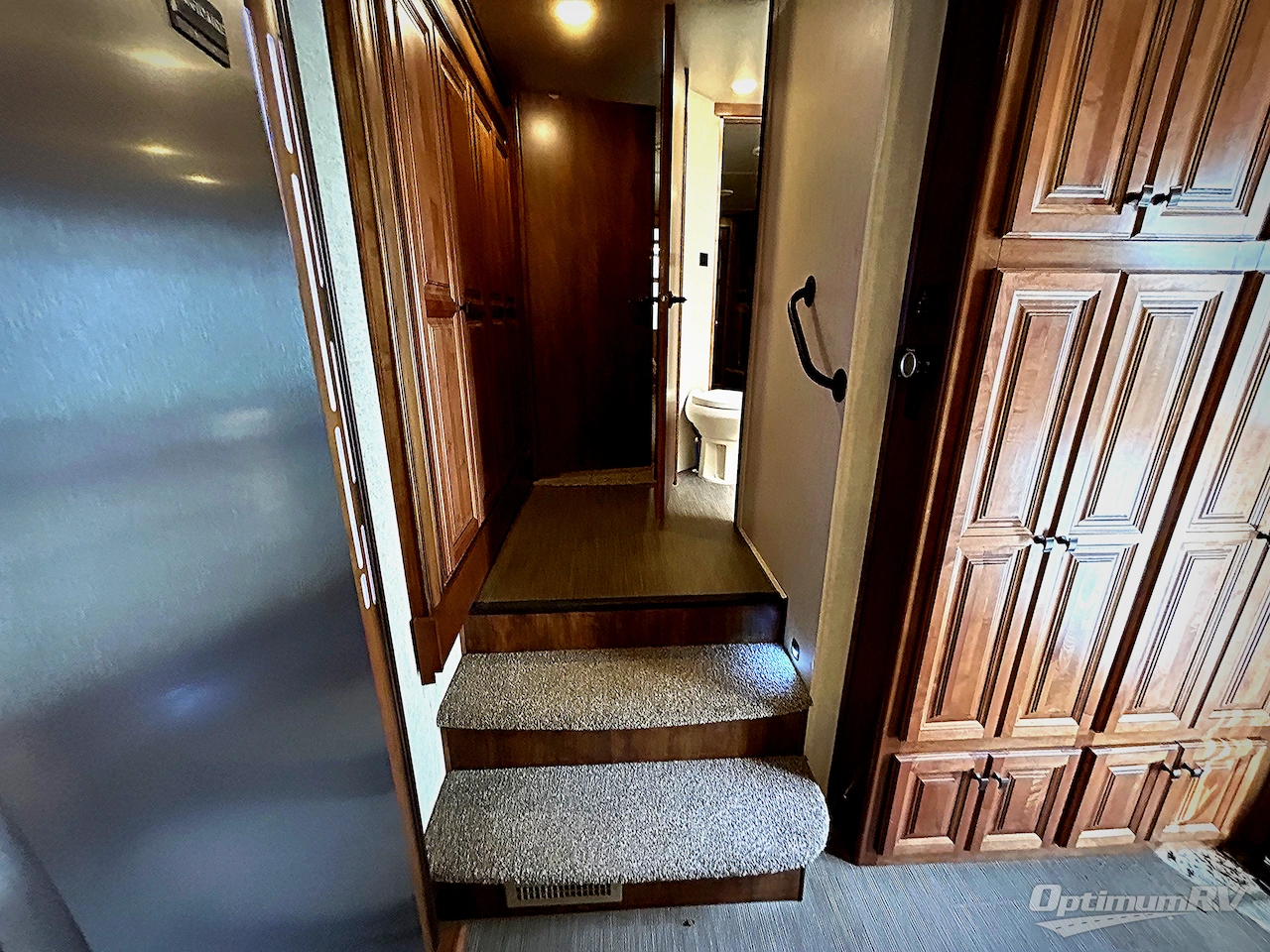 Head up the steps to a side aisle bath. The bath is on your right at the top of the stairs featuring a shower with seat, toilet, vessel sink, medicine cabinet, and linen storage. Along the road side wall there is a slide out beginning in the hallway with a large closet/wardrobe.