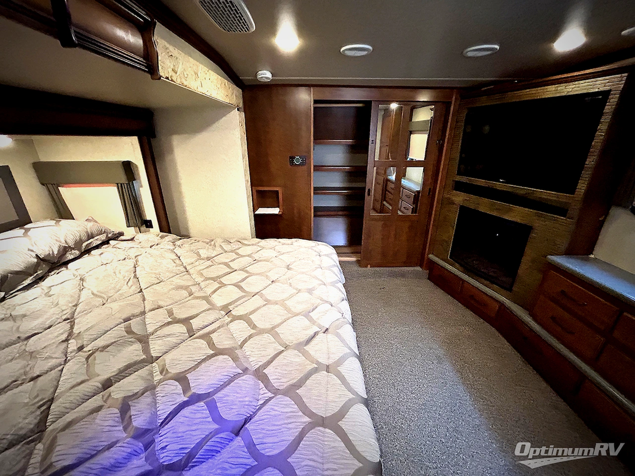 The slide out continues into the bedroom with a nightstand, and another slide out within the hallway slide allowing the king size bed to be pushed out further for more walking around room. You may choose an optional queen bed instead as well. The front full wall closet has sliding doors, storage drawers, and space to hang your clothes which comes in handy on those longer stay vacations. There is also a dresser opposite the bed along with a storage closet and drawers, plus a location for an optional TV and fireplace along the curb side wall allowing plenty of room for all your camping clothes, plus so much more!