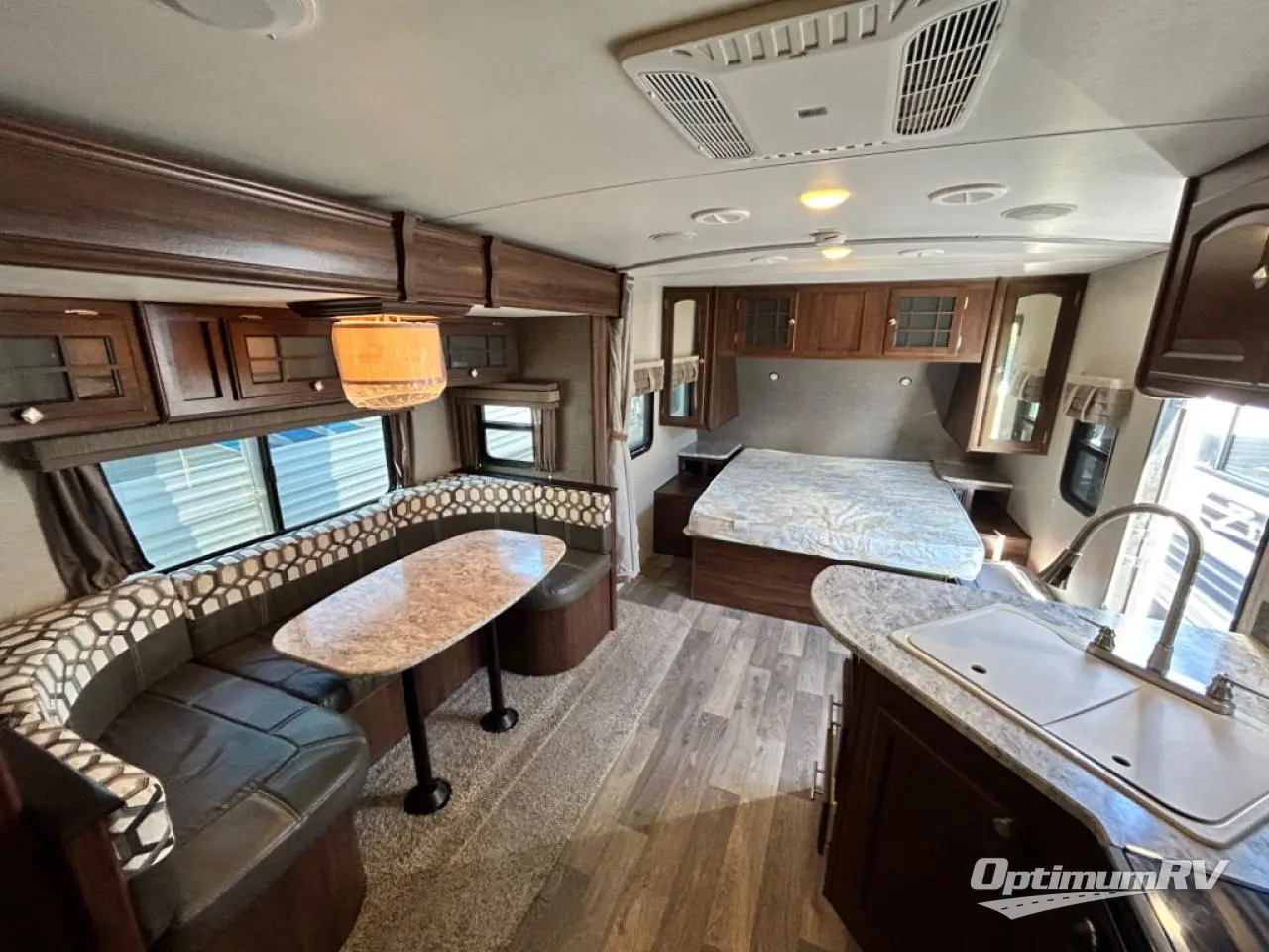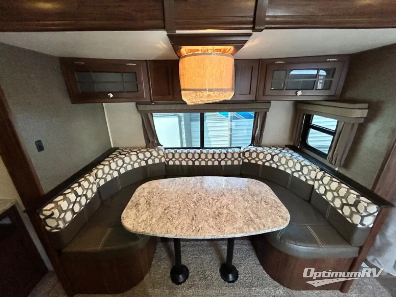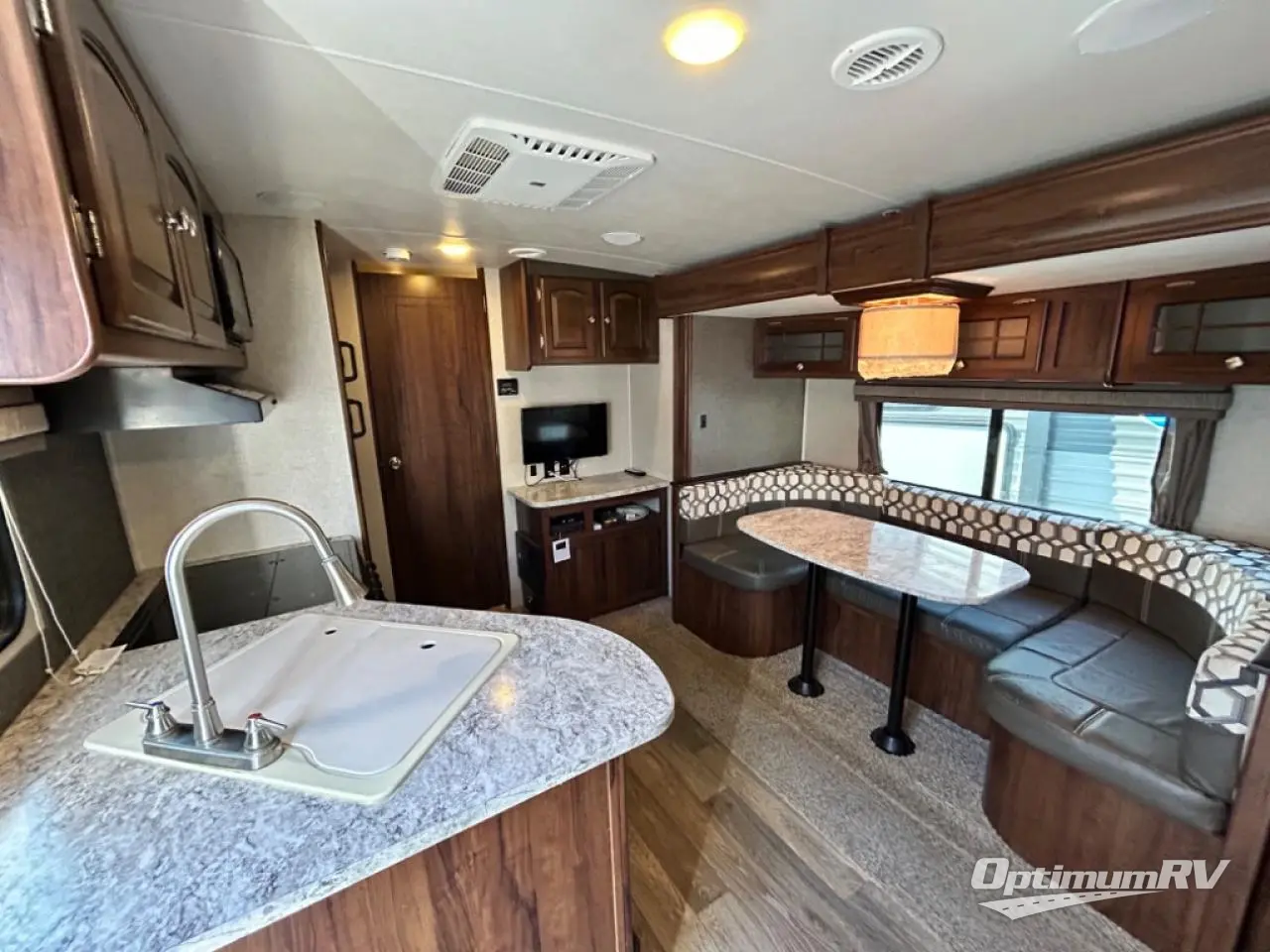 Enjoy plenty of floor space with the u-shaped dinette fully extended providing even more interior space to move about. There is an overhead storage cabinet above the dinette for storing your things, and you can easily view the optional flat screen TV that is along the exterior wall of the rear bathroom.