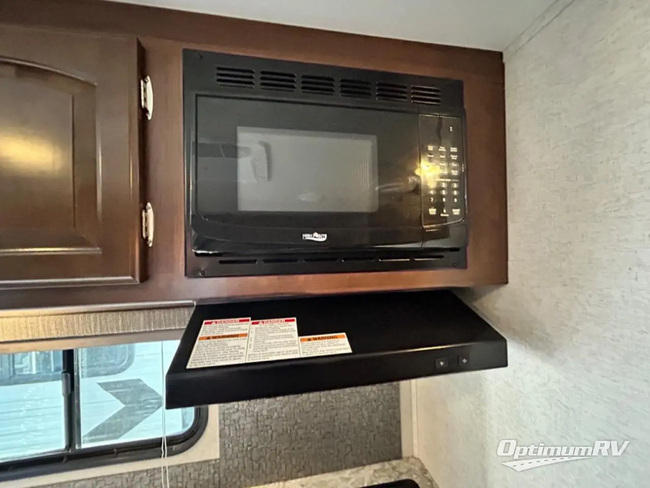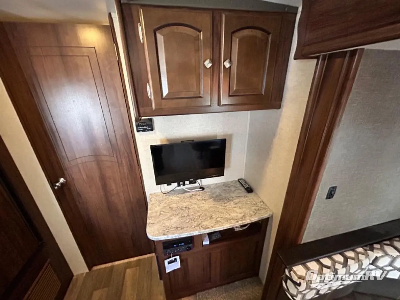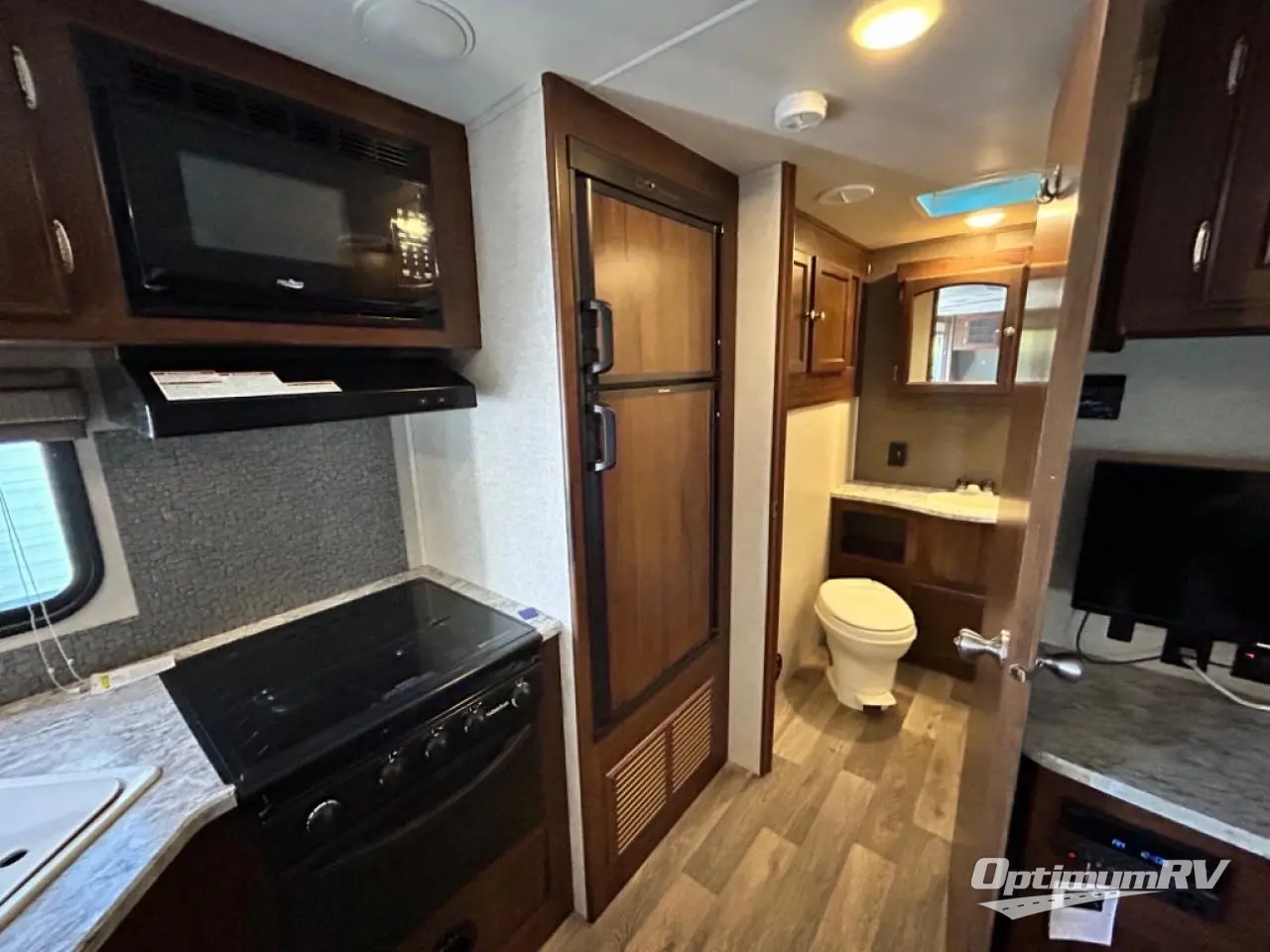 Enjoy plenty of floor space with the u-shaped dinette fully extended providing even more interior space to move about. There is an overhead storage cabinet above the dinette for storing your things, and you can easily view the optional flat screen TV that is along the exterior wall of the rear bathroom.