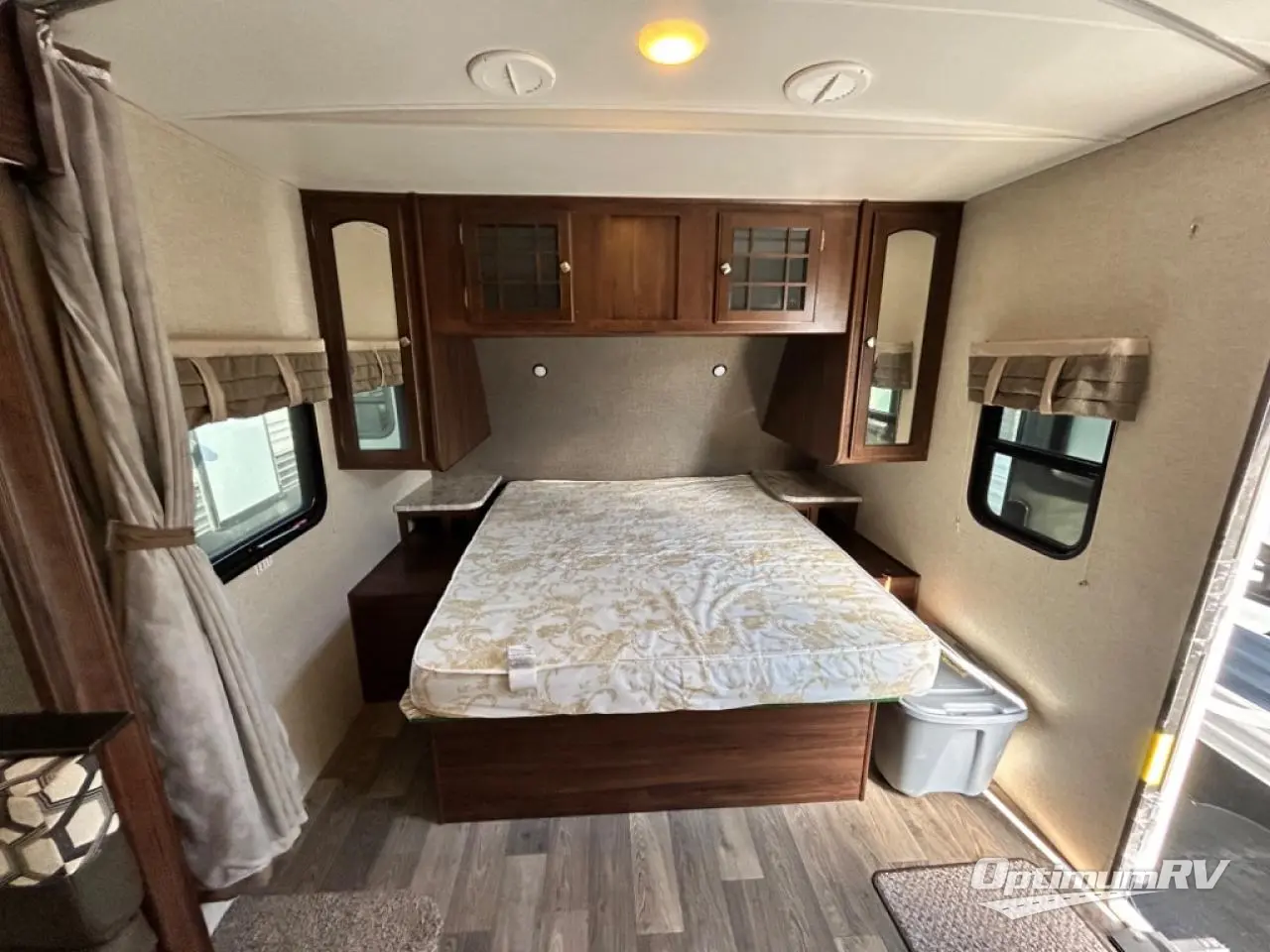 Step inside and see a comfortable front queen bed with storage along both sides including overhead storage as well. There is a privacy curtain to separate the living and bedroom space if needed.