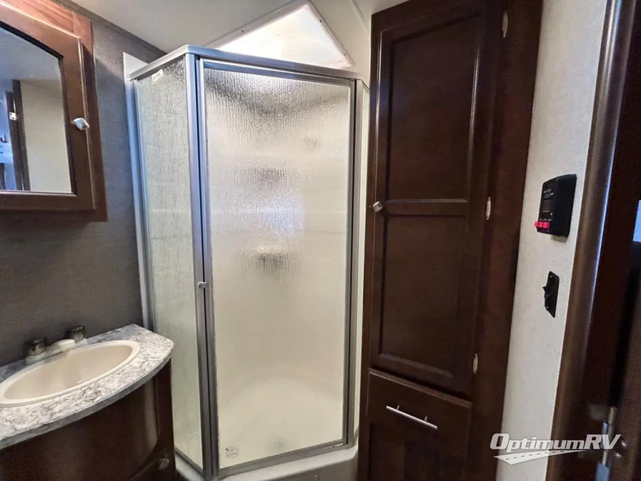 The rear bath features a toilet, vanity with sink and overhead cabinet, an angled shower, plus a linen cabinet for towels and toiletries.