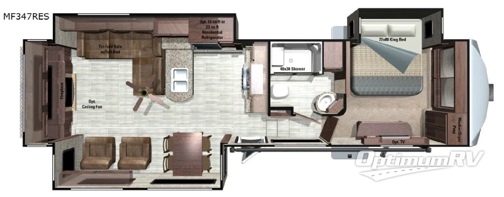 This Mesa Ridge fifth wheel model MF347RES features a rear entertainment layout, triple slides for added interior space, and a king size bed in the master suite!