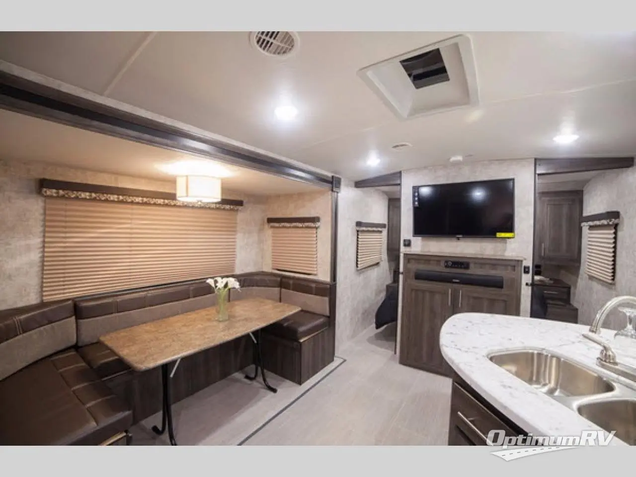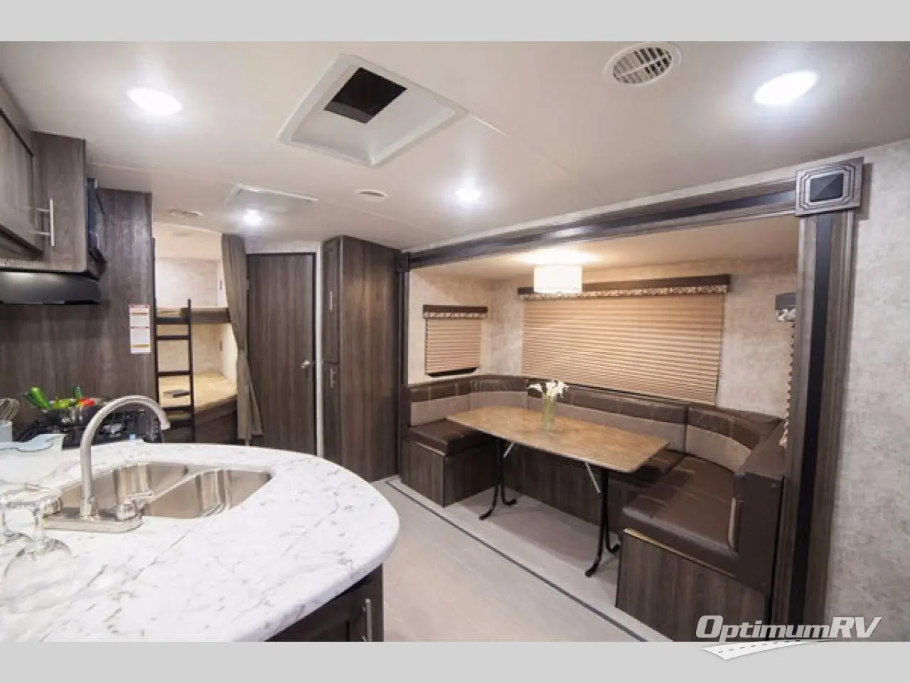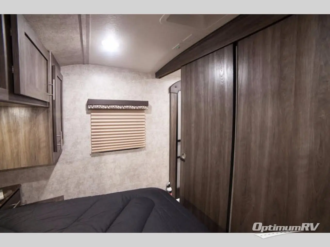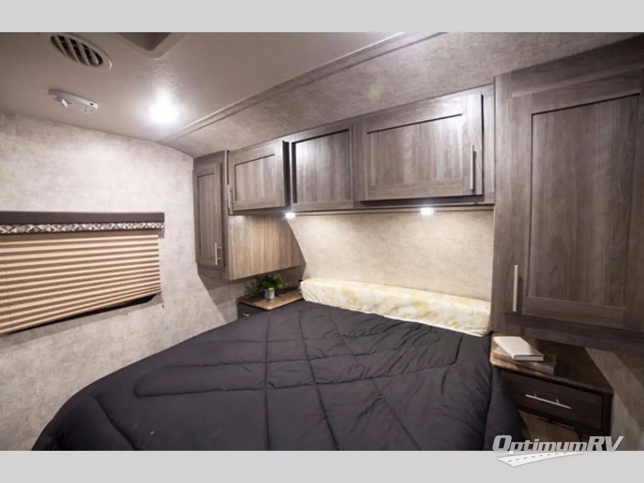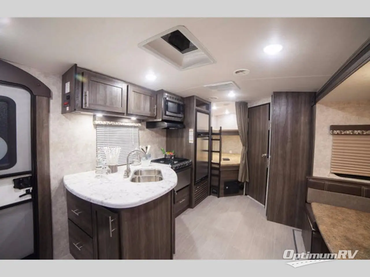 Step inside the main curb side entry and notice how open and spacious the combined dining and living area is. Enter the bedroom in front through sliding doors on either side of the entertainment center located on the interior wall in the living area. Inside the bedroom you will find a convertible queen bed with extension, dual bedside wardrobes and nightstands, plus overhead cabinetry as well.