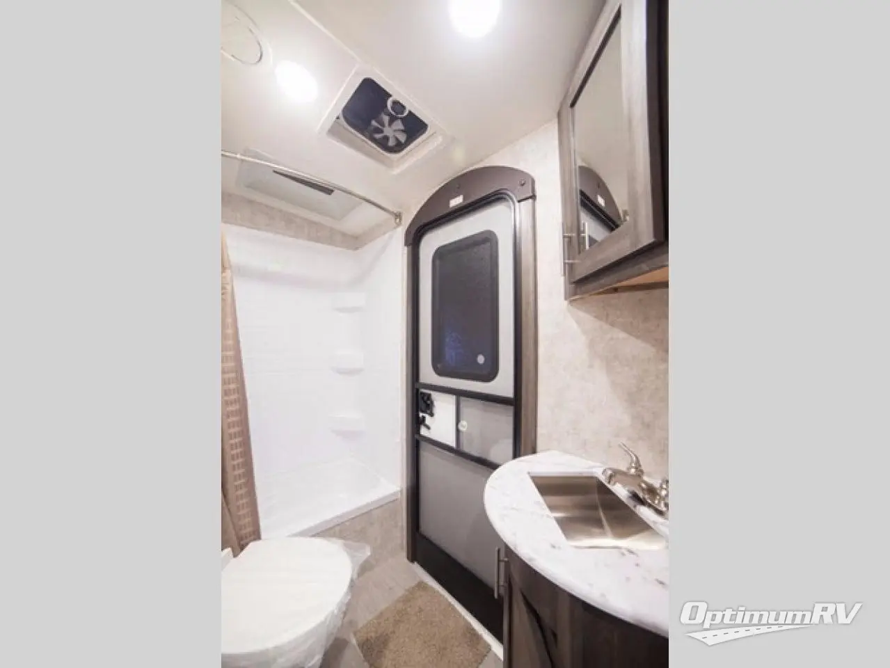 The rear right corner features a convenient bathroom with a private entry to the outside on the road side wall. This is great when spending time outdoors, giving you easy access when you need it. The bath includes a shower, toilet, and vanity with sink.