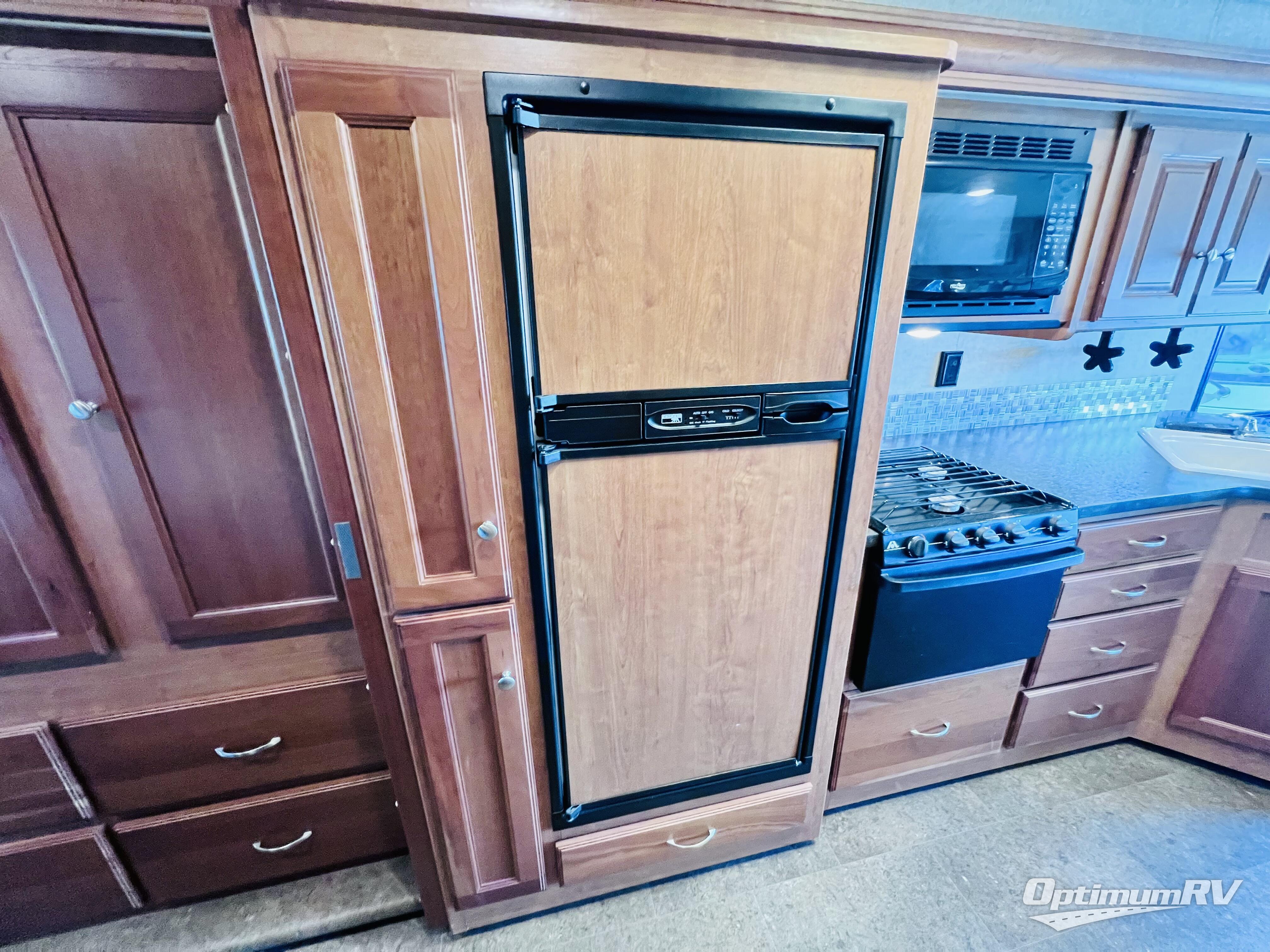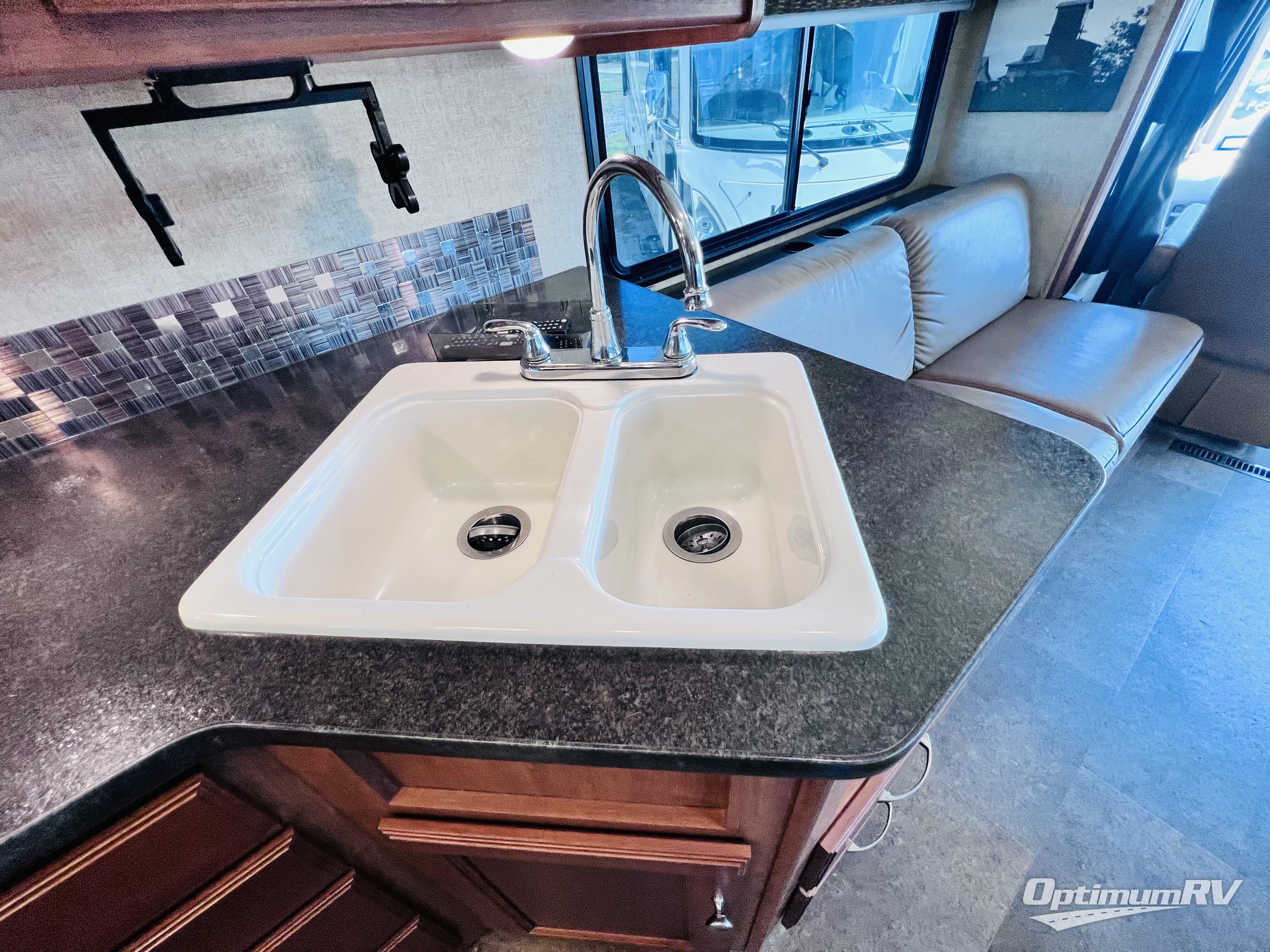 The full slide continues with the kitchen which includes a double sink, overhead cabinetry, a three burner range, refrigerator, and pantry. You will find a second pantry next to the dinette along the curb side where you will also notice a location for a 40" HDTV.