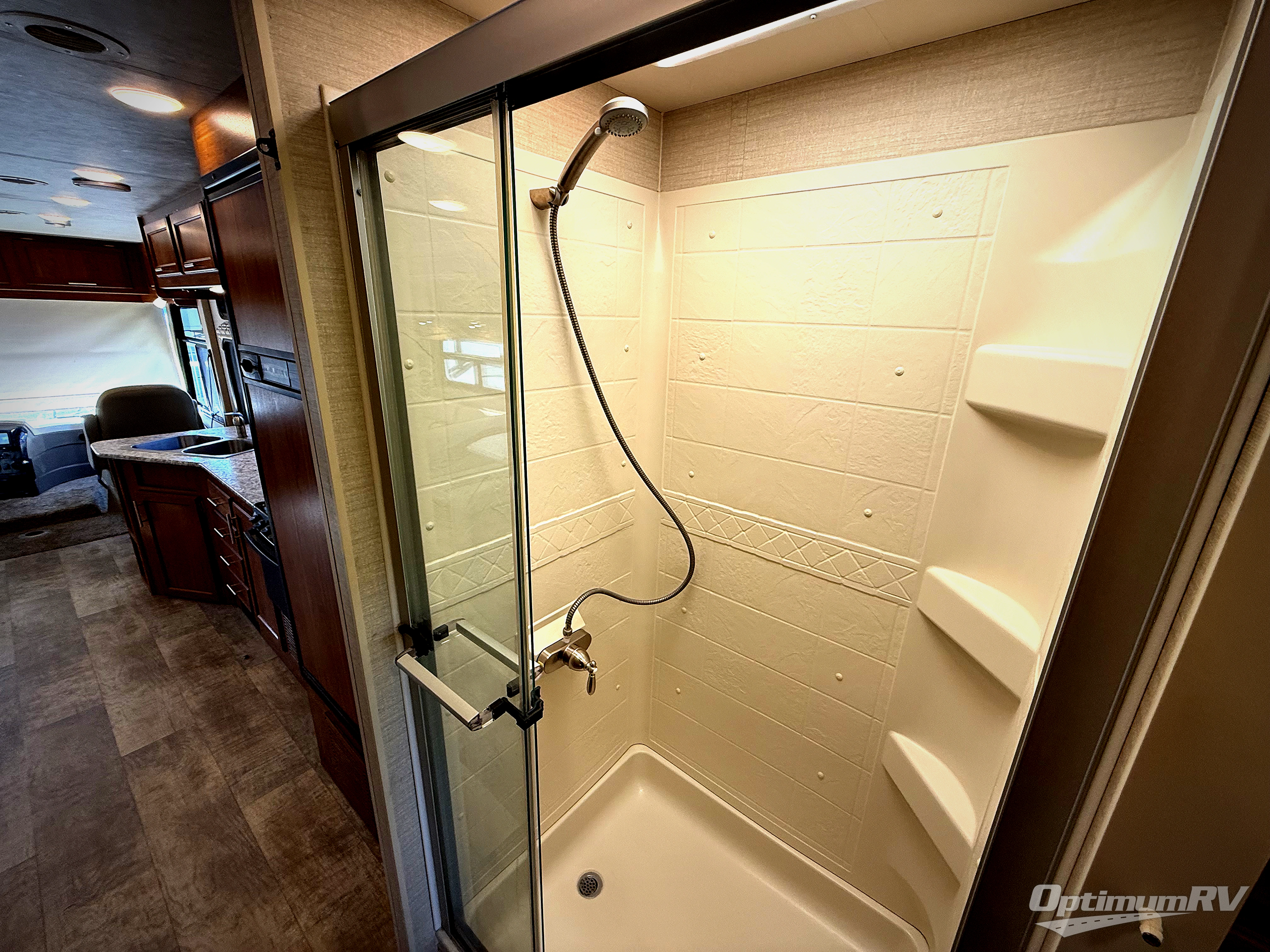 Beyond the kitchen there is a split bath including a private toilet area on the right side along with a vanity and sink. The shower is along the curb side opposite.