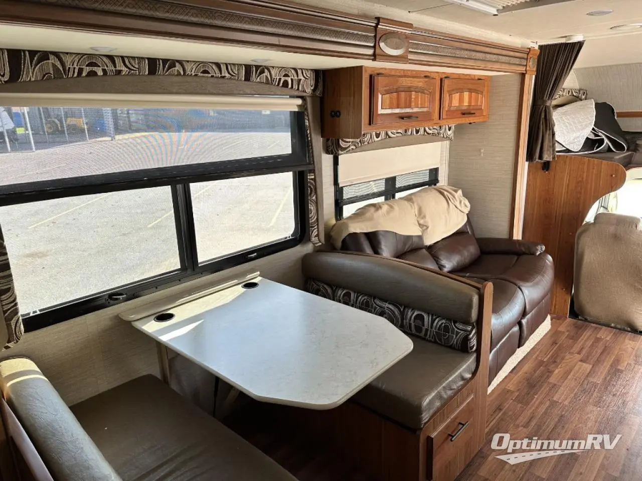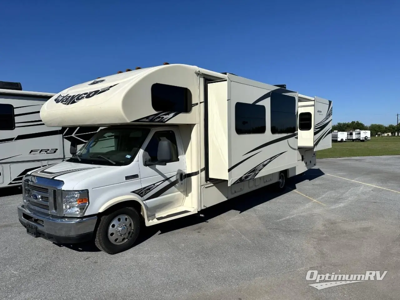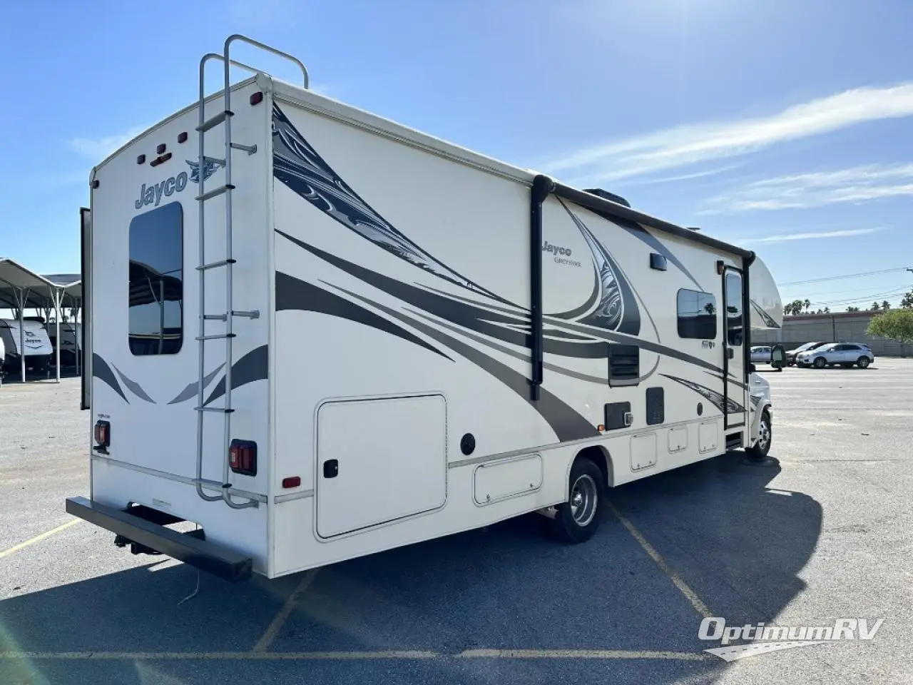When you step inside the Greyhawk 29MV class C gas motor home by Jayco, you will be impressed with how well the floorplan space is used. To the left of the entrance there is a counter with a pull out countertop with drawers, a double kitchen sink, three burner range, microwave, refrigerator, and a pantry. Behind the driver's seat you will find a sofa with overhead cabinets and dinette slide. Above the driver's seat is a cab-over bunk with TV overhead cabinet for extra sleeping space.