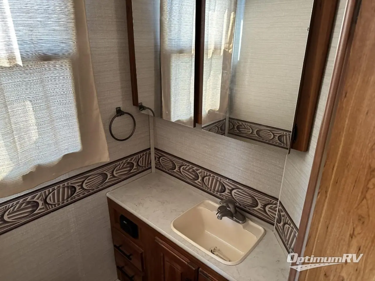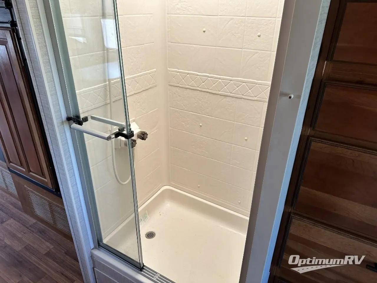 As you proceed toward the rear of the motor home, you will walk through the bathroom. There is a private toilet area with a sink, and medicine cabinet. The shower is across the hallway. The rear bedroom has a queen bed and nightstands slide. There is also a wardrobe and TV cabinet in the bedroom.