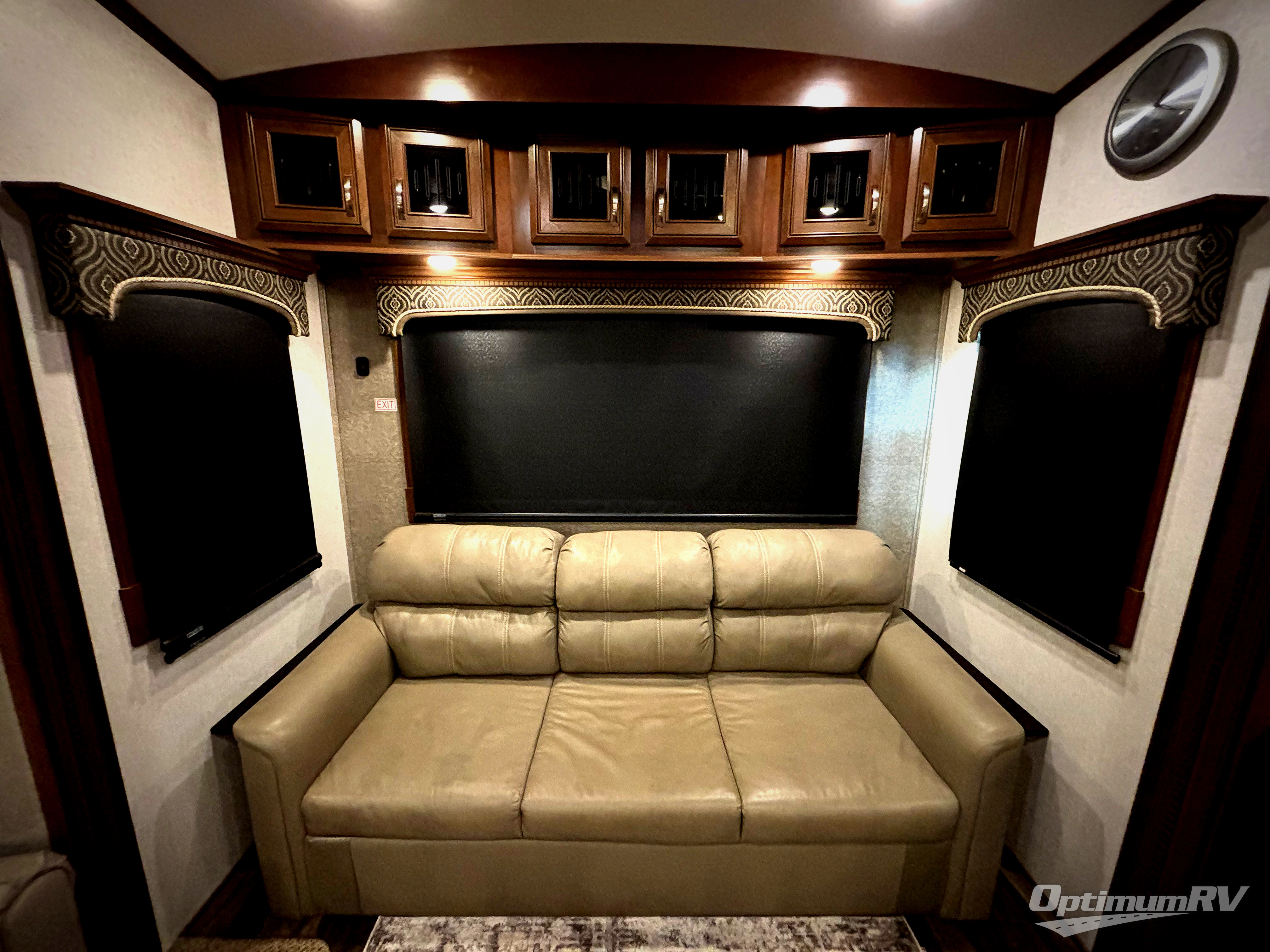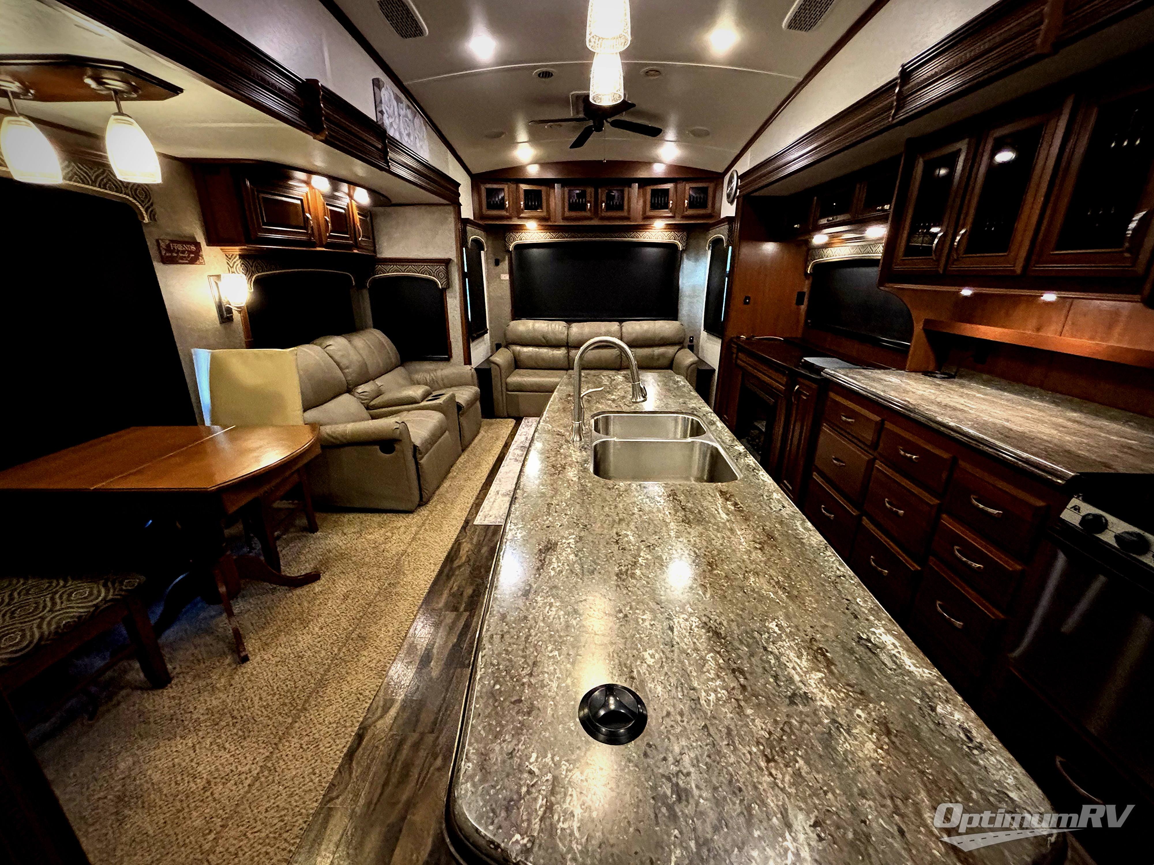 As you enter the fifth wheel, to the left there is a slide out with a free-standing table and theater seating or you can choose optional recliners. Along the rear wall you will enjoy a tri-fold hide-a-bed or choose an optional reclining sofa. The slide out along the road side has an entertainment center with fireplace below, cabinets, microwave, three burner range, and a residential refrigerator. There is a kitchen island with lots of counter space and a double kitchen sink. On the interior wall of the kitchen there is a large pantry with sliding doors and a wardrobe.